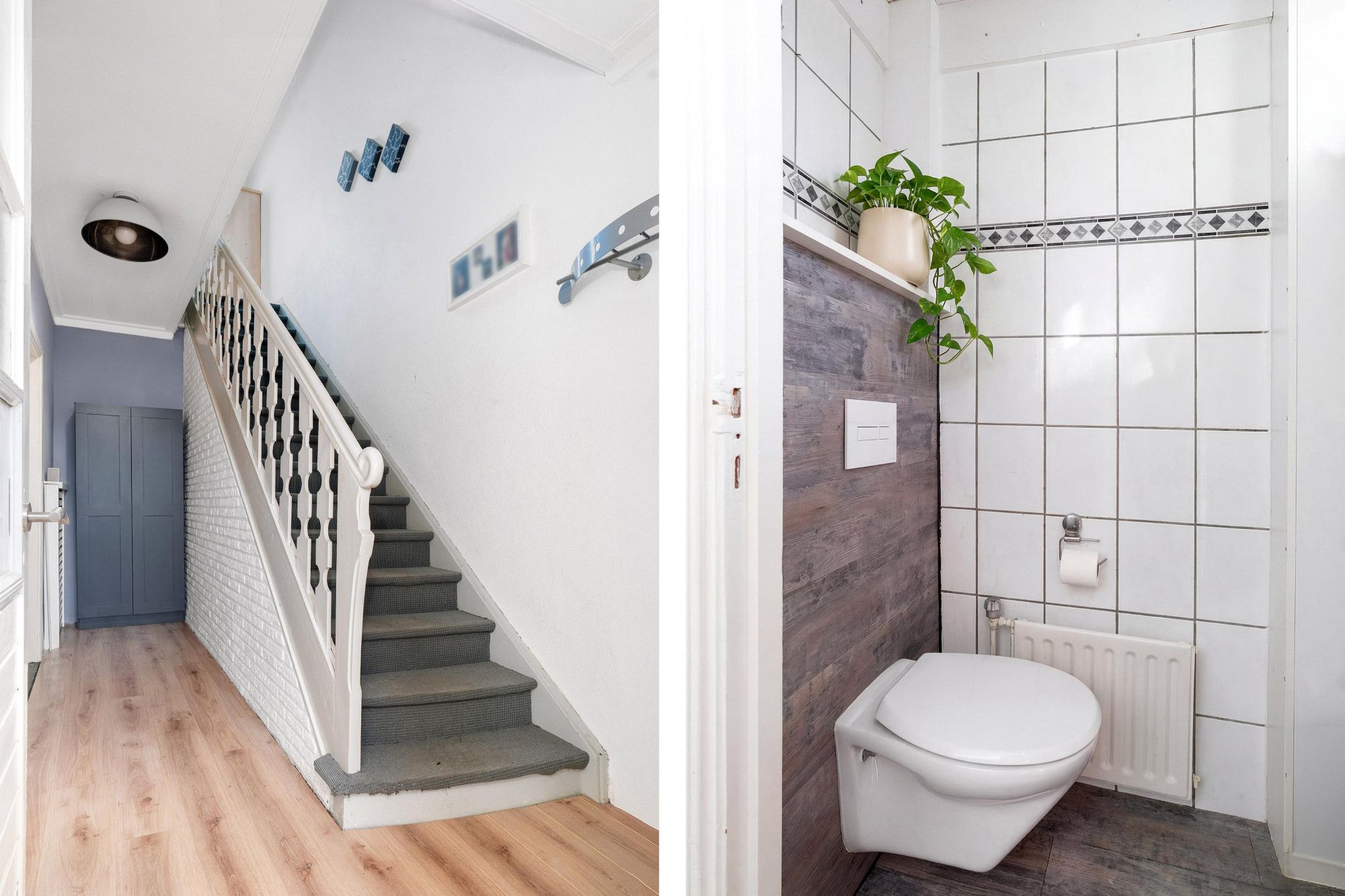 Entree met tegelvloer en zwevend toilet.
