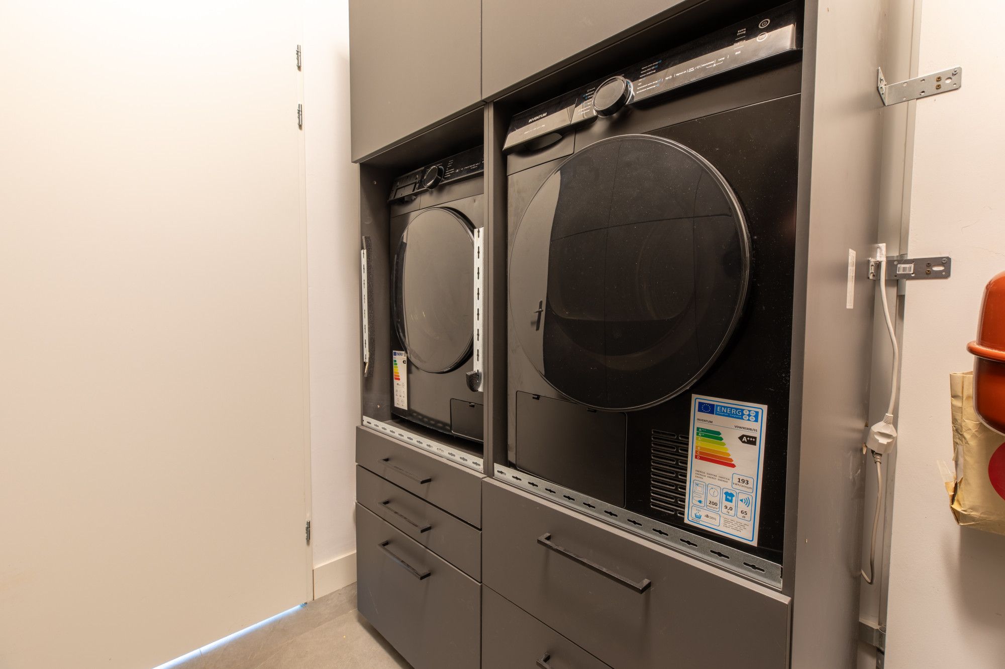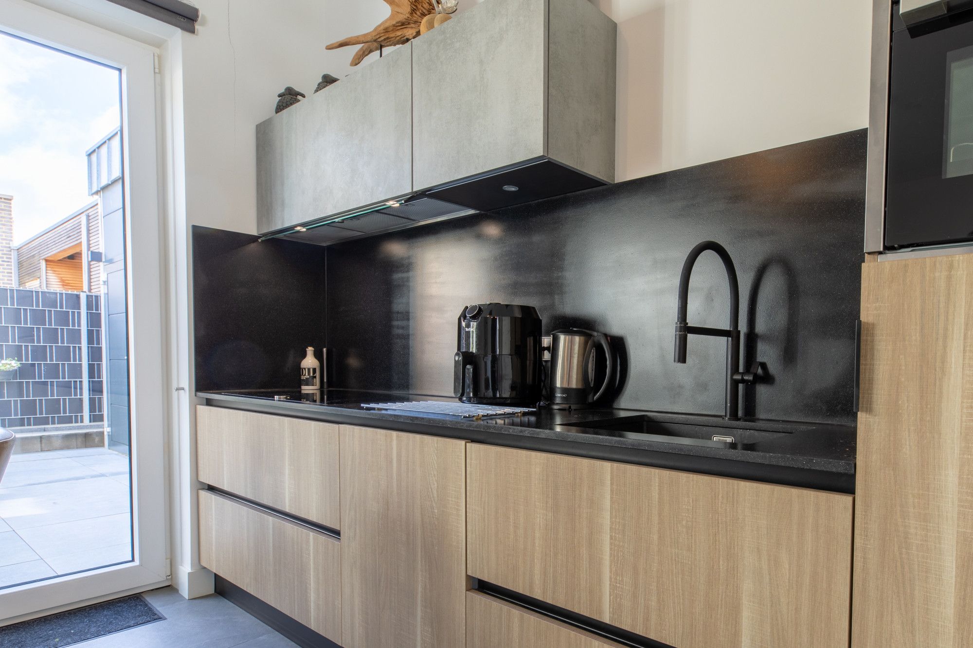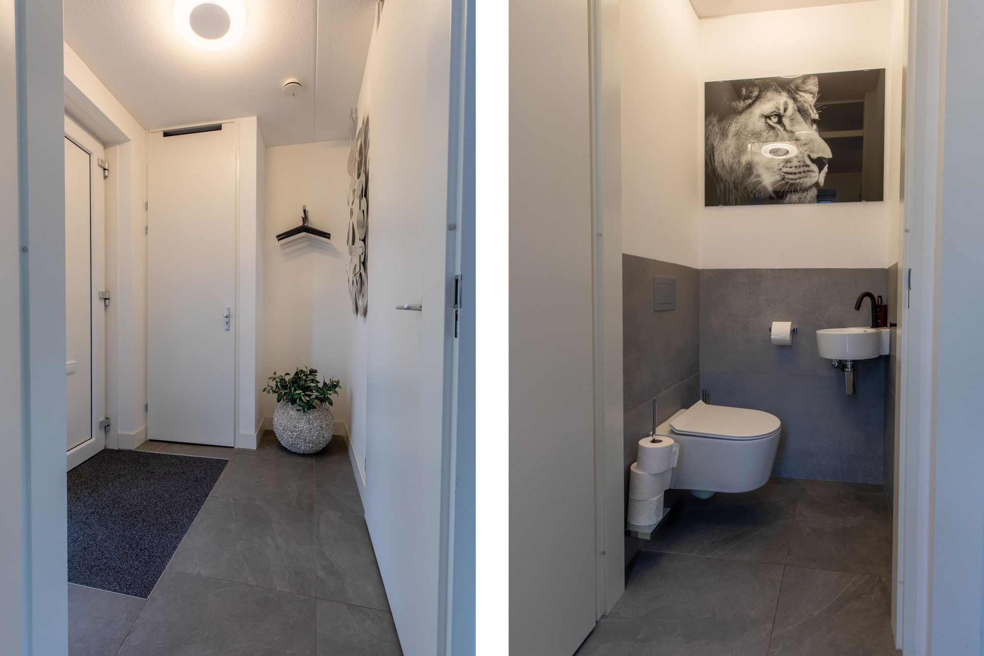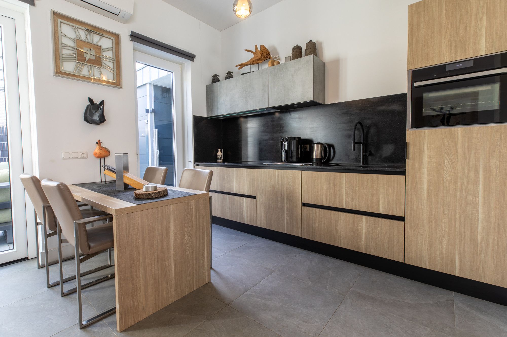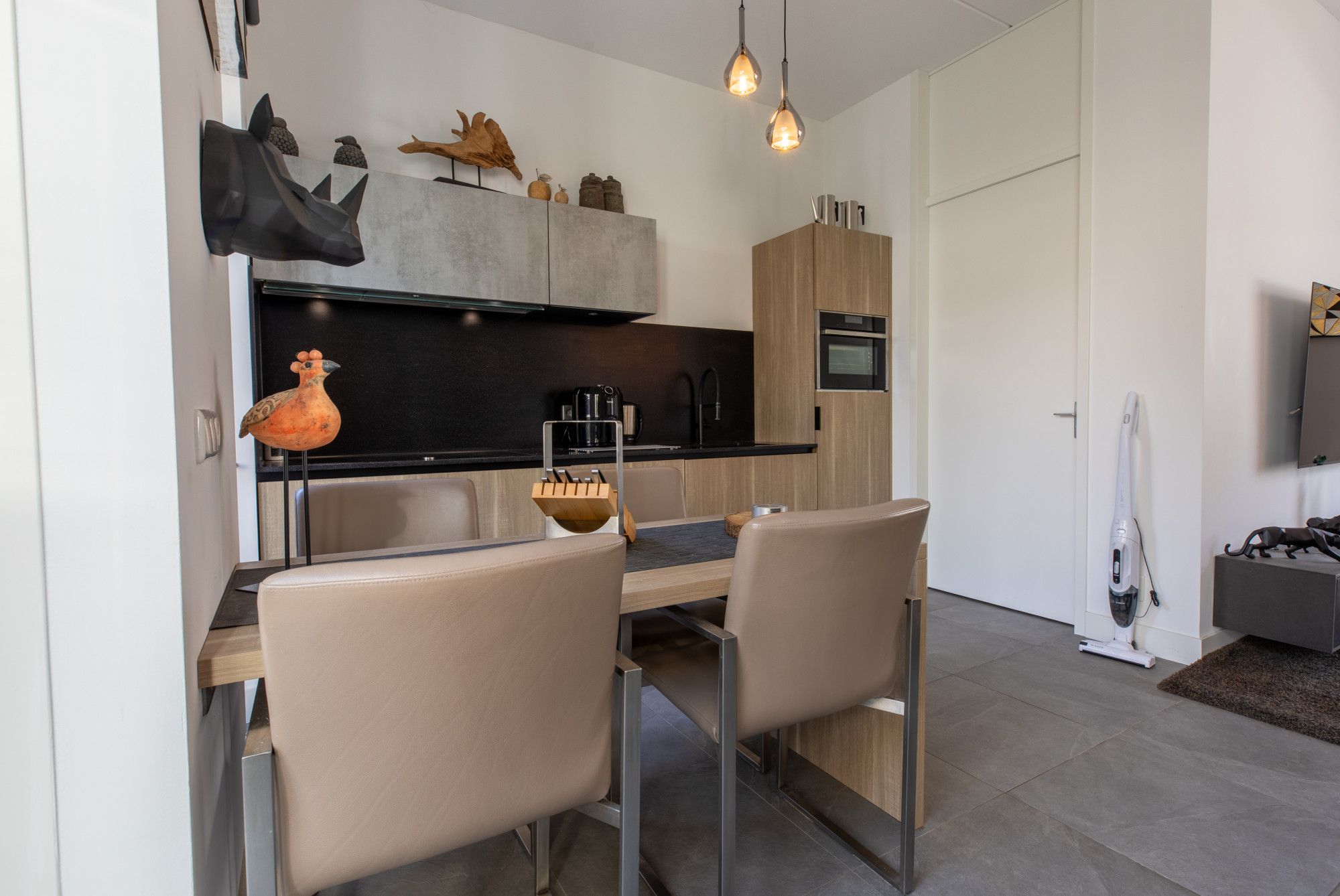 Via de hal, met aangrenzend de meterkast en het toilet, gaat u naar de naar de woonkamer met open keuken. De woonkamer is circa 30m2 (circa 6,02m x 4,93m) groot. De keuken (circa 3,20m x 2,27m) is ingericht met een moderne keuken, voorzien van apparatuur en een vaste tafel in dezelfde stijl. Naast de keuken is de bijkeuken met kastenwand, waarin een groot deel van de apparatuur (waaronder de wasmachine, de droger en de cv-ketel) is geplaatst.