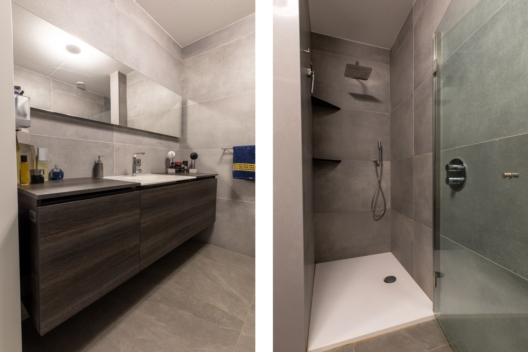 Via een tweede hal gaat u naar de slaapkamer(s) en de badkamer. De twee slaapkamers zijn samengevoegd tot slaapkamer (circa 4,35m x 3,00m) met kastenwand en kledingkamer met zithoek (circa 4,35m x 2,44m) en eveneens een kastenwand, die in een handomdraai terug te brengen is naar een tweede slaapkamer.