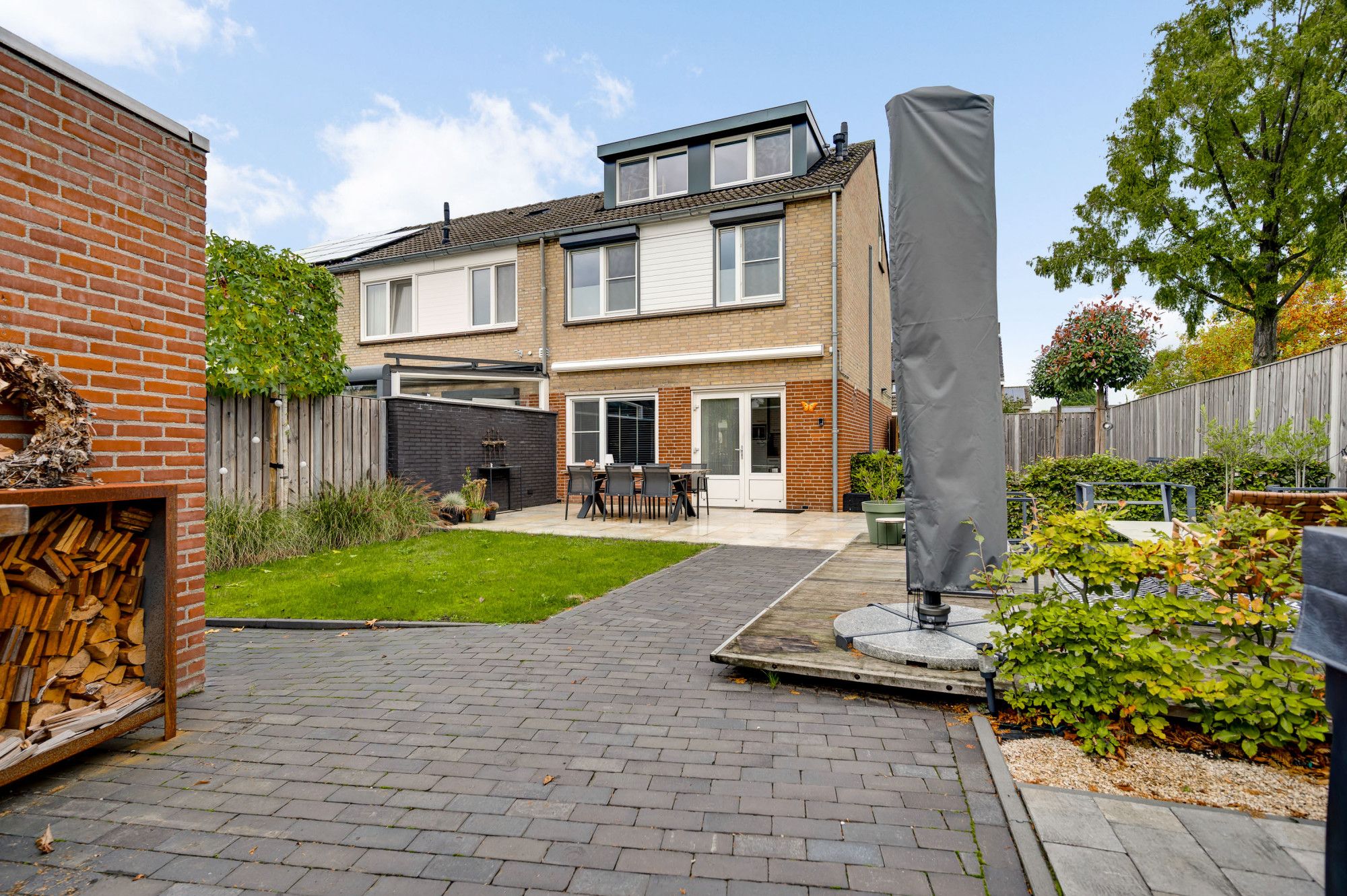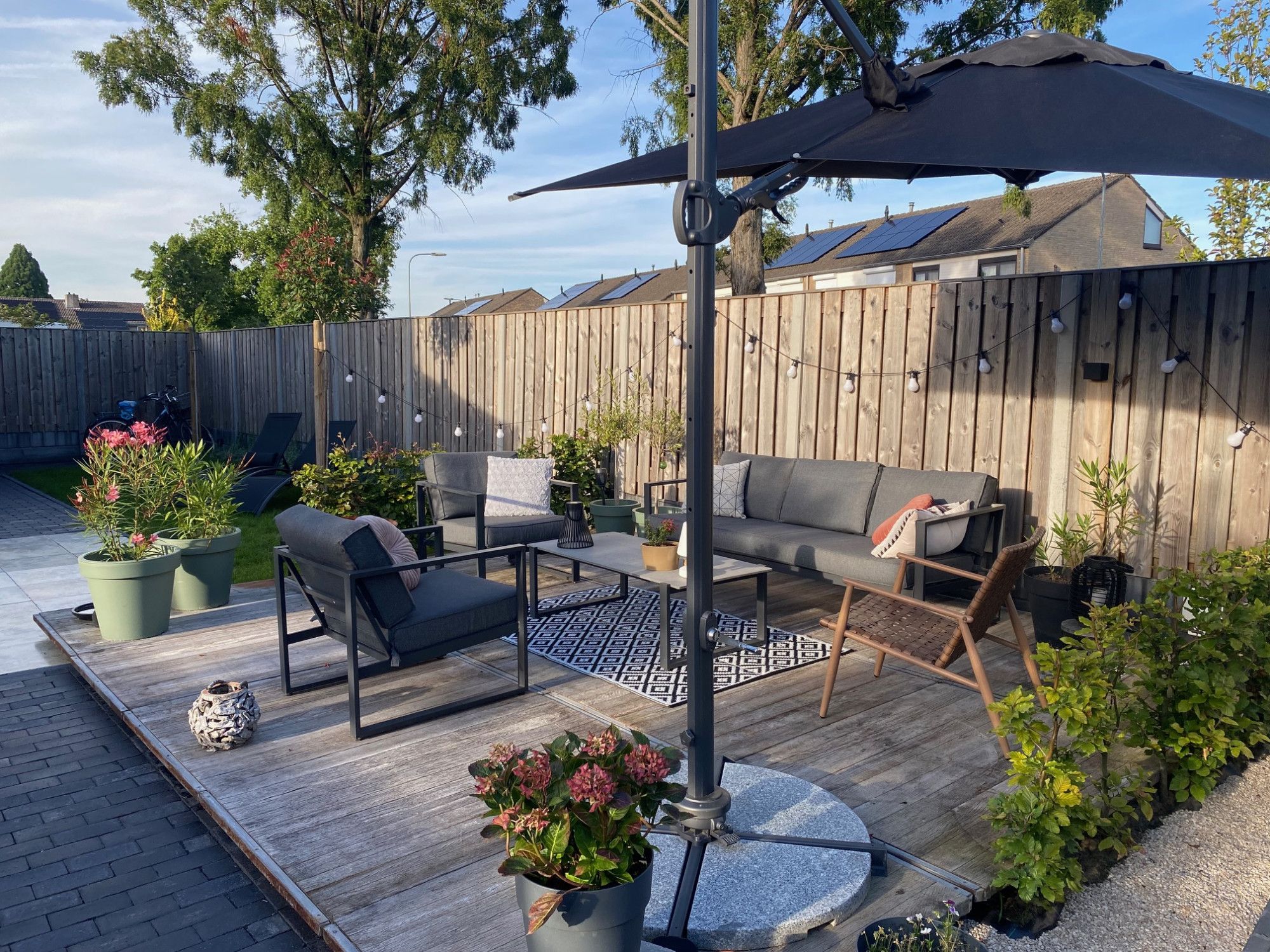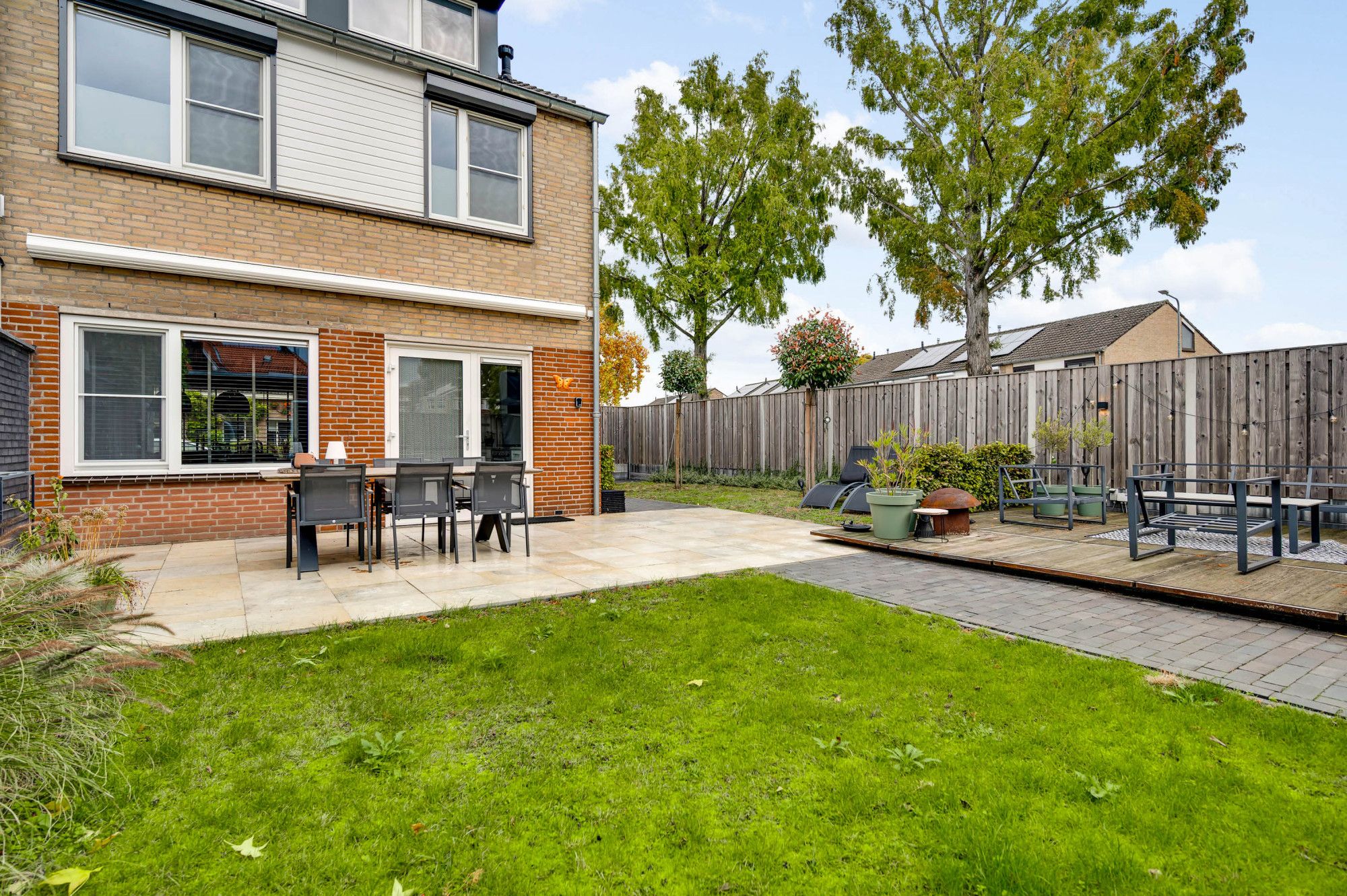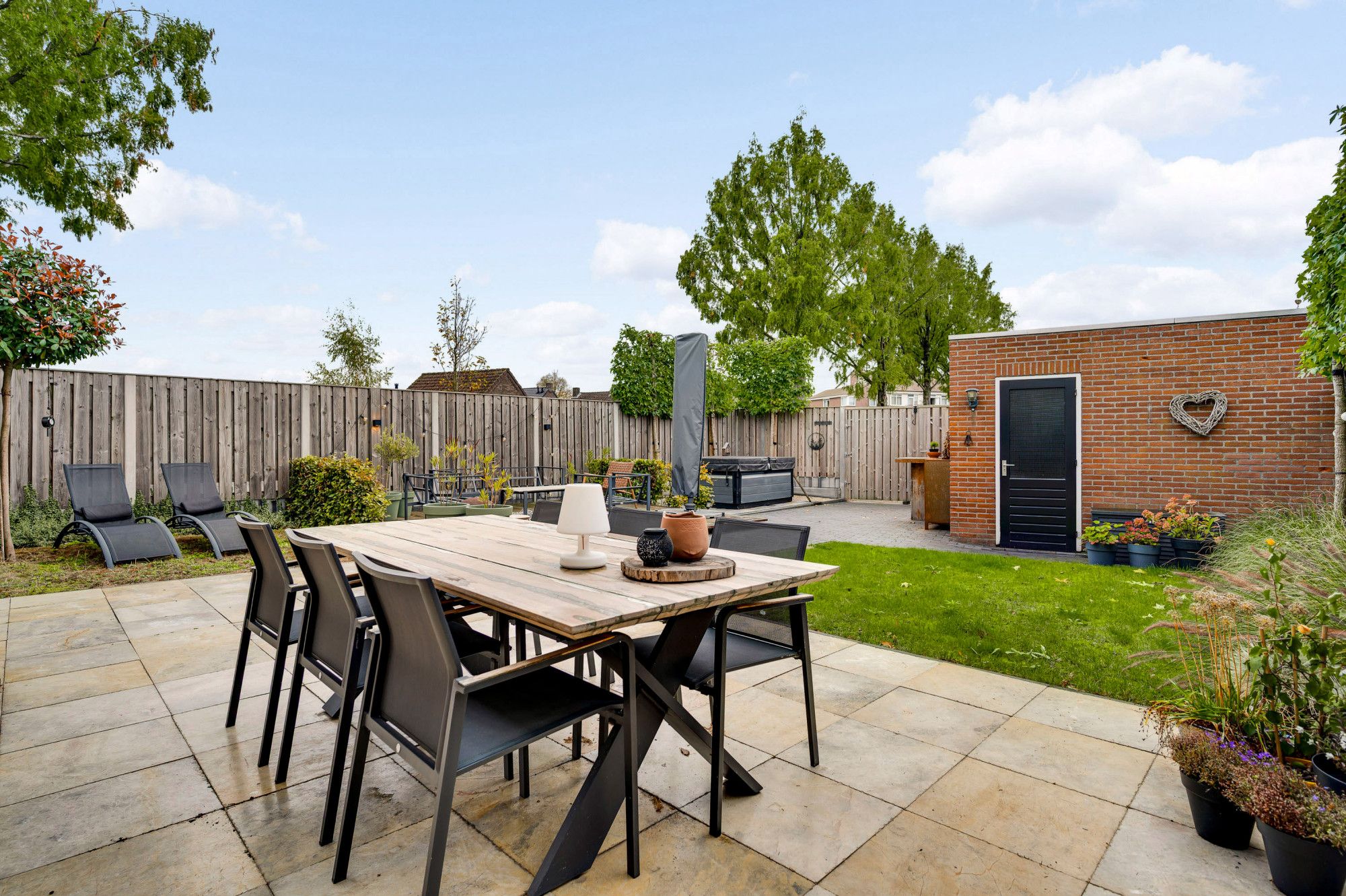 Er is een verzorgde voortuin met toegang tot de achterom en een zonnige achtertuin op het zuidoosten met veel privacy. Verder is er een eigen vrijstaande garage met elektra en witgoedaansluitingen, een terras met zonnescherm, gazon en beplanting. De tuin is een prettige plek om tot rust te komen of te genieten van gezellige momenten met familie en vrienden.