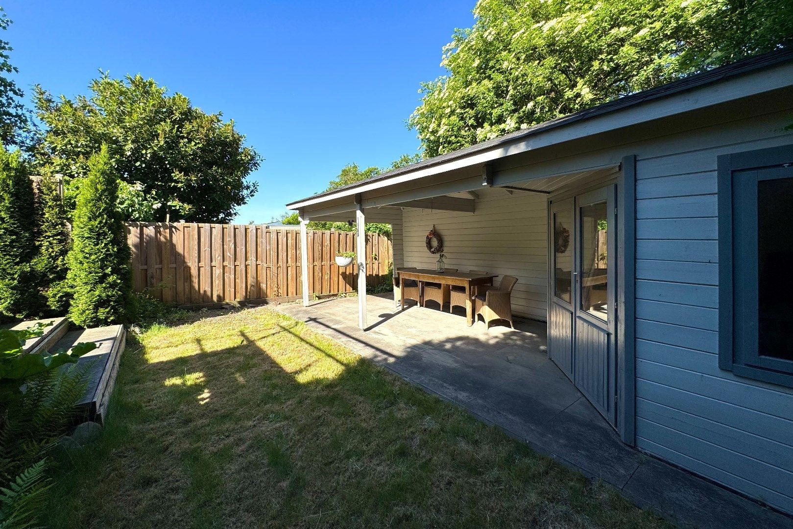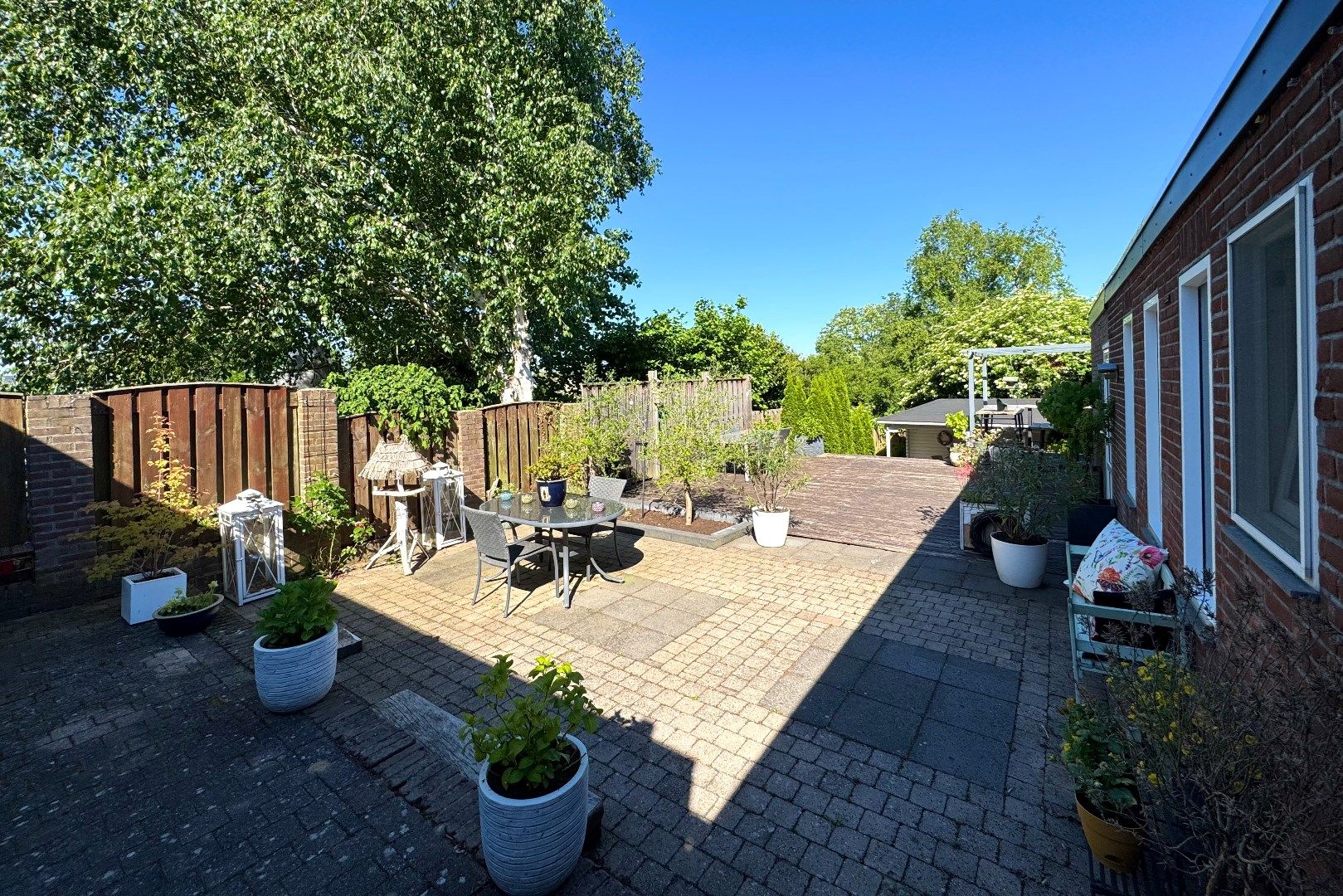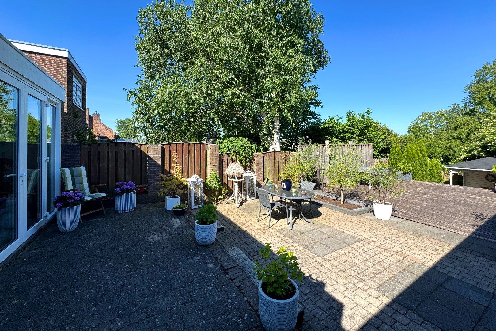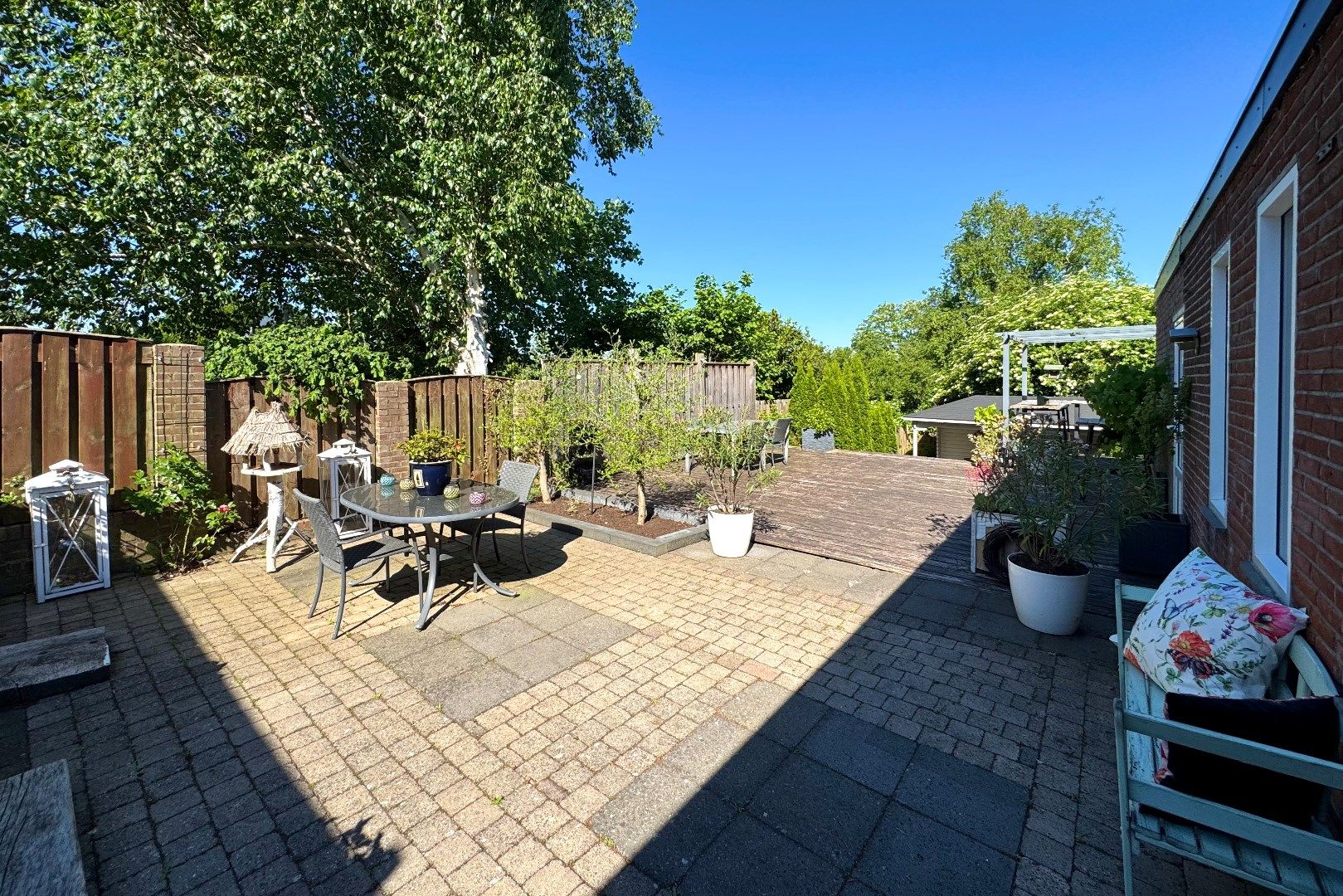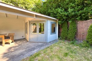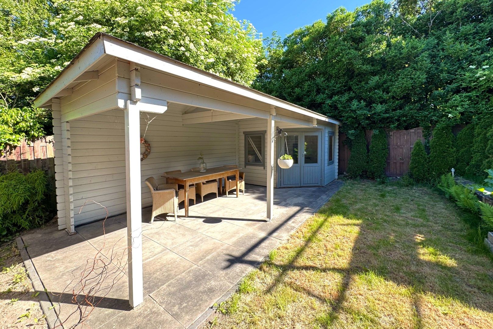Via zowel de woonkamer als de keuken bereikt men de achtergelegen tuin. Deze achtergelegen tuin is op het noordwesten gesitueerd en biedt veel privacy en rust. Zo zijn er o.a. meerdere terrassen aanwezig, borders, een gazon en een achtergelegen tuinhuis (7m2) met overkapping (4.90m x 2.70m). Via de tuin bereikt men de multifunctionele ruimte.
