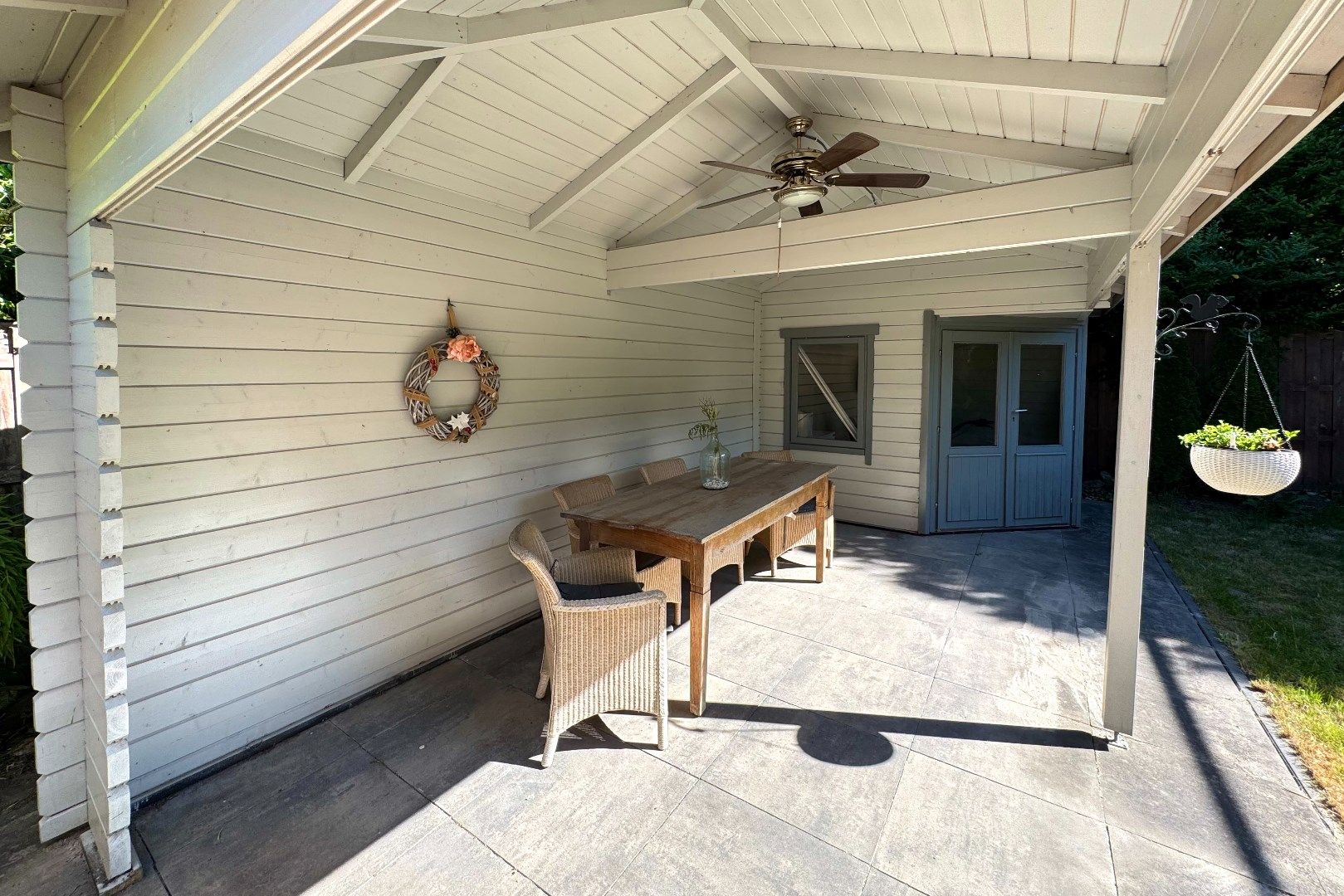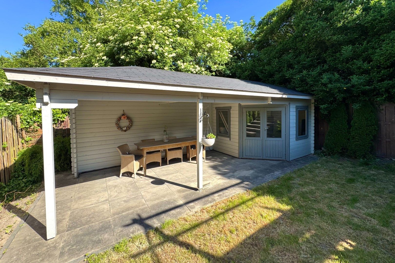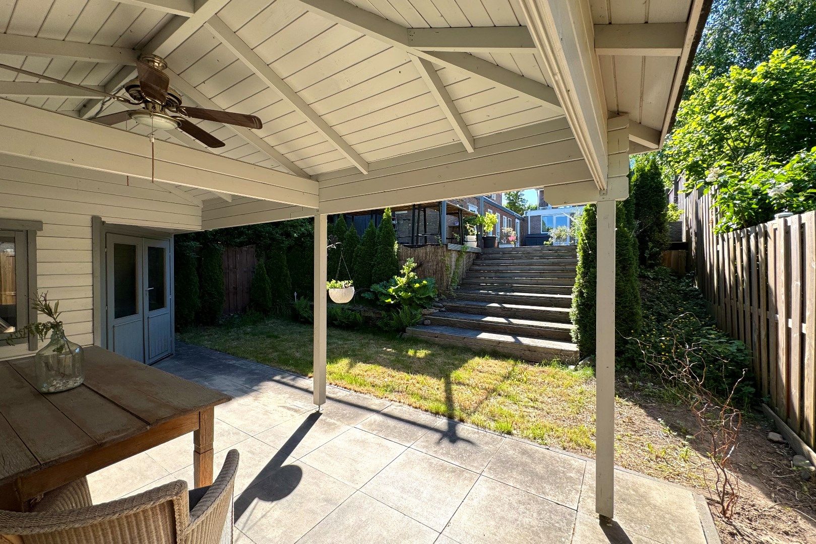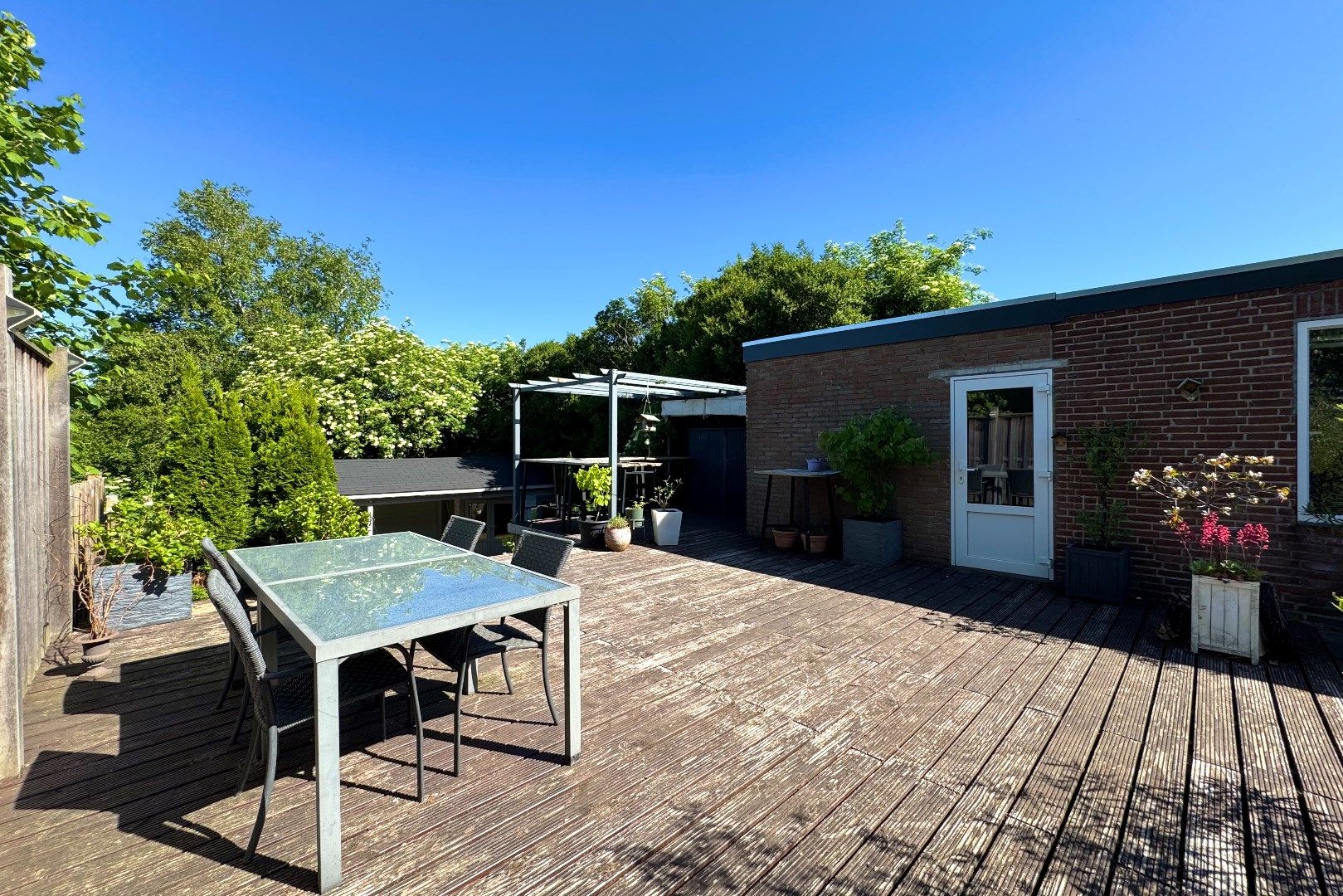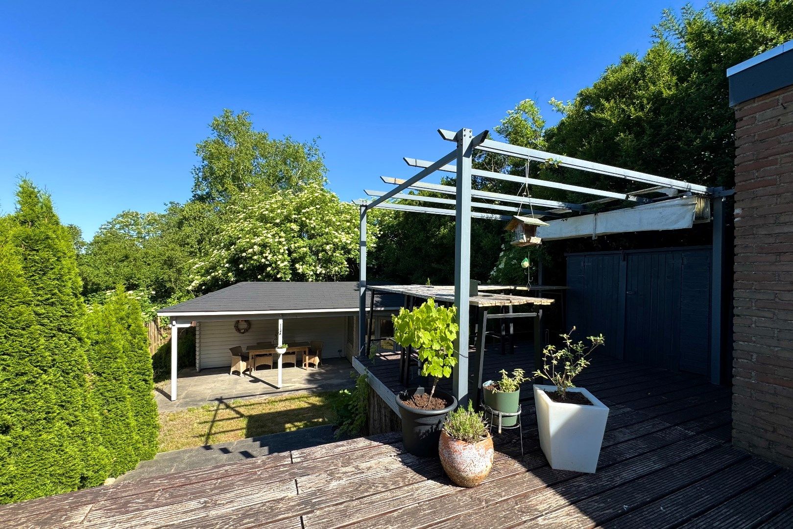 Via zowel de woonkamer als de keuken bereikt men de achtergelegen tuin. Deze achtergelegen tuin is op het noordwesten gesitueerd en biedt veel privacy en rust. Zo zijn er o.a. meerdere terrassen aanwezig, borders, een gazon en een achtergelegen tuinhuis (7m2) met overkapping (4.90m x 2.70m). Via de tuin bereikt men de multifunctionele ruimte.