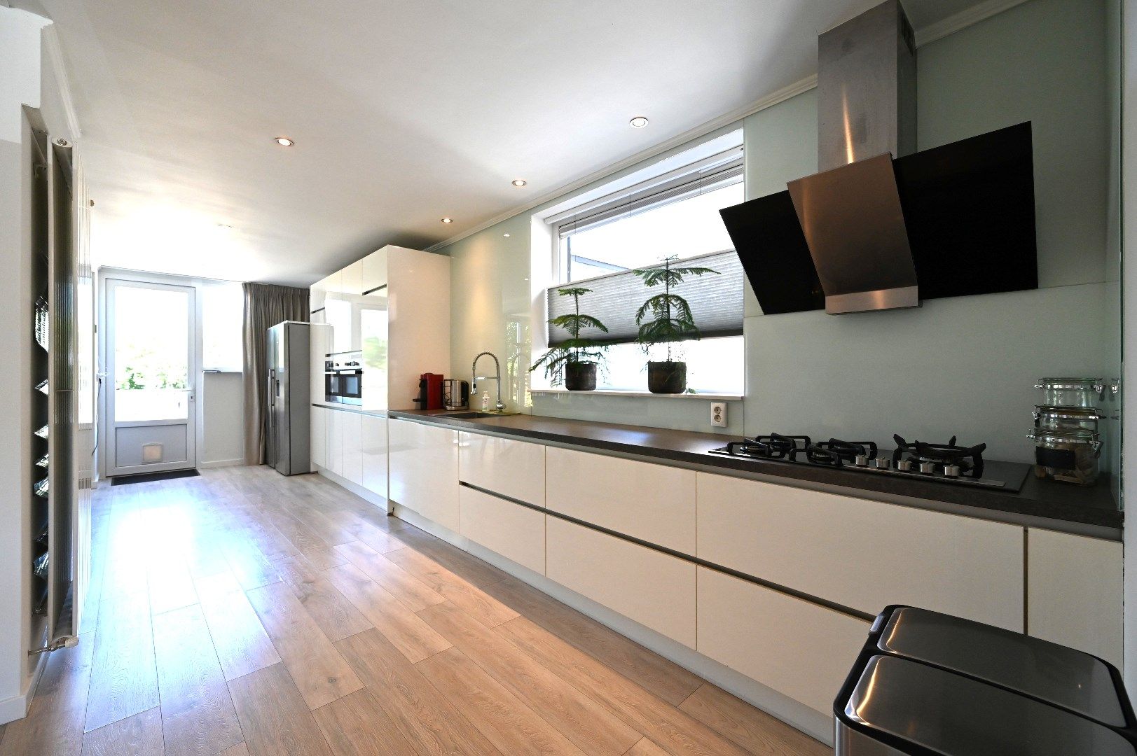 Wanneer men de voordeur opent dan treedt men de hal/entree binnen. Deze hal/entree (2.56m x 2.27m) biedt toegang tot de toiletruimte, keuken en middels de trapopgang toegang tot de eerste etage. De moderne toiletruimte (1.54m x 0.88m) is voorzien van een Japans toilet en fonteintje. De ruime open keuken (20m2) is voorzien van een laminaatvloer, airconditioning en beschikt over een keukeninstallatie in rechte opstelling met de volgende ingebouwde keukenapparatuur: 5-pits gaskookplaat, afzuiging, vaatwasser, combioven (2x), koelkast en Amerikaanse koelkast & diepvries. De royale doorzonwoonkamer (12.47m x 3.53m) is voorzien van een laminaatvloer en biedt middels de dubbele openslaande tuindeur toegang tot de tuin. Door de vele en grote raampartijen is er aan lichtinval geen gebrek.