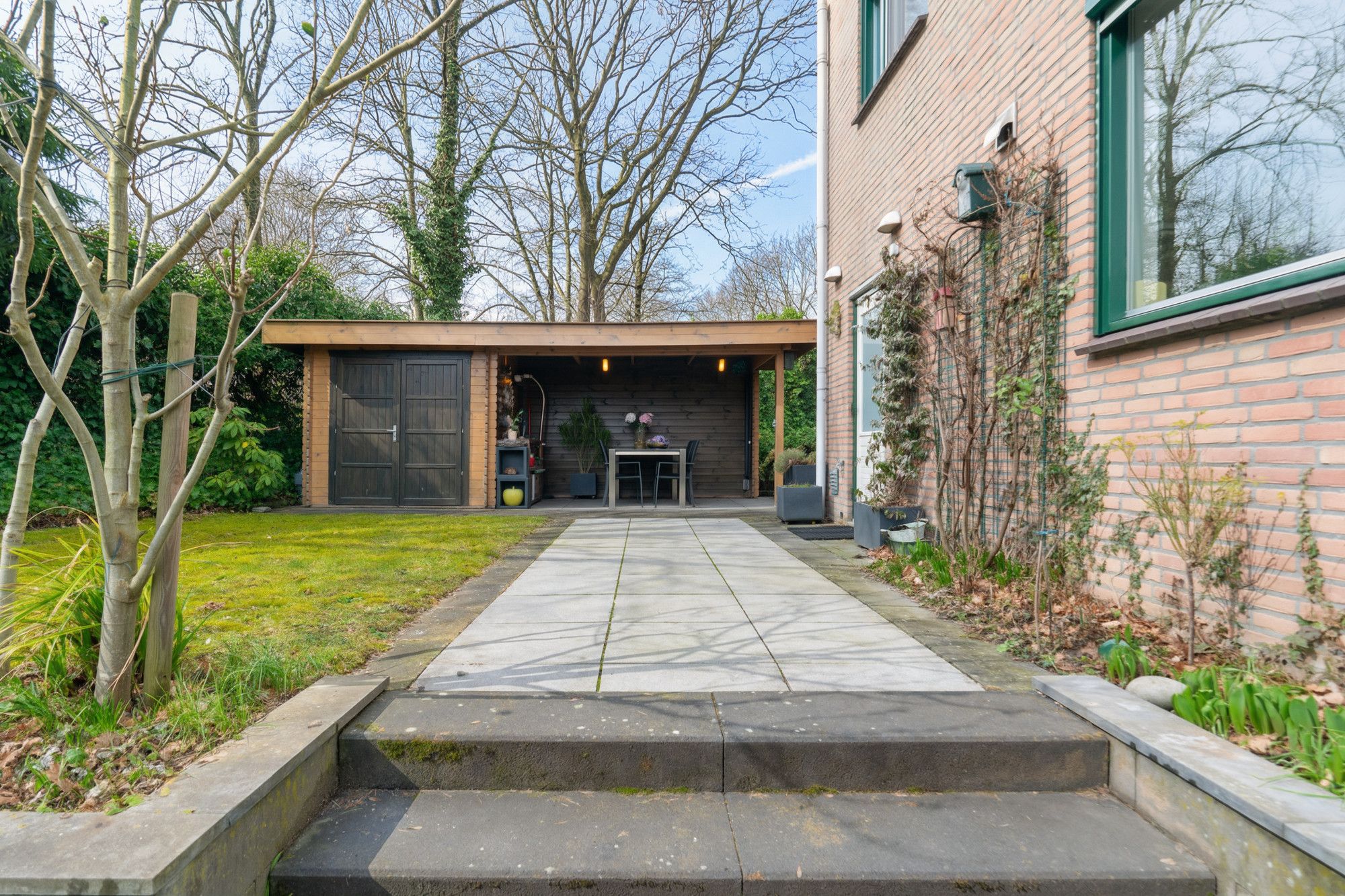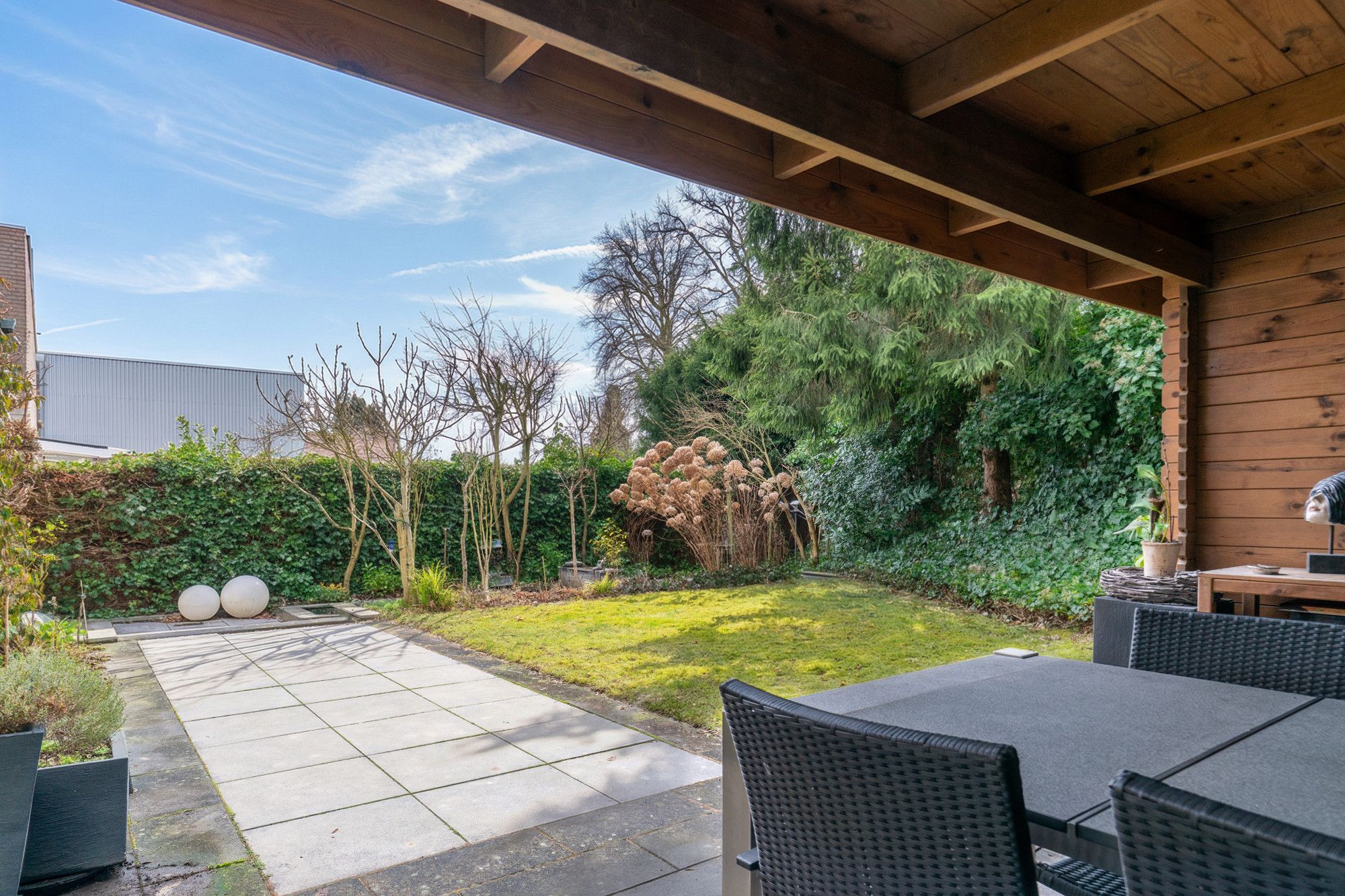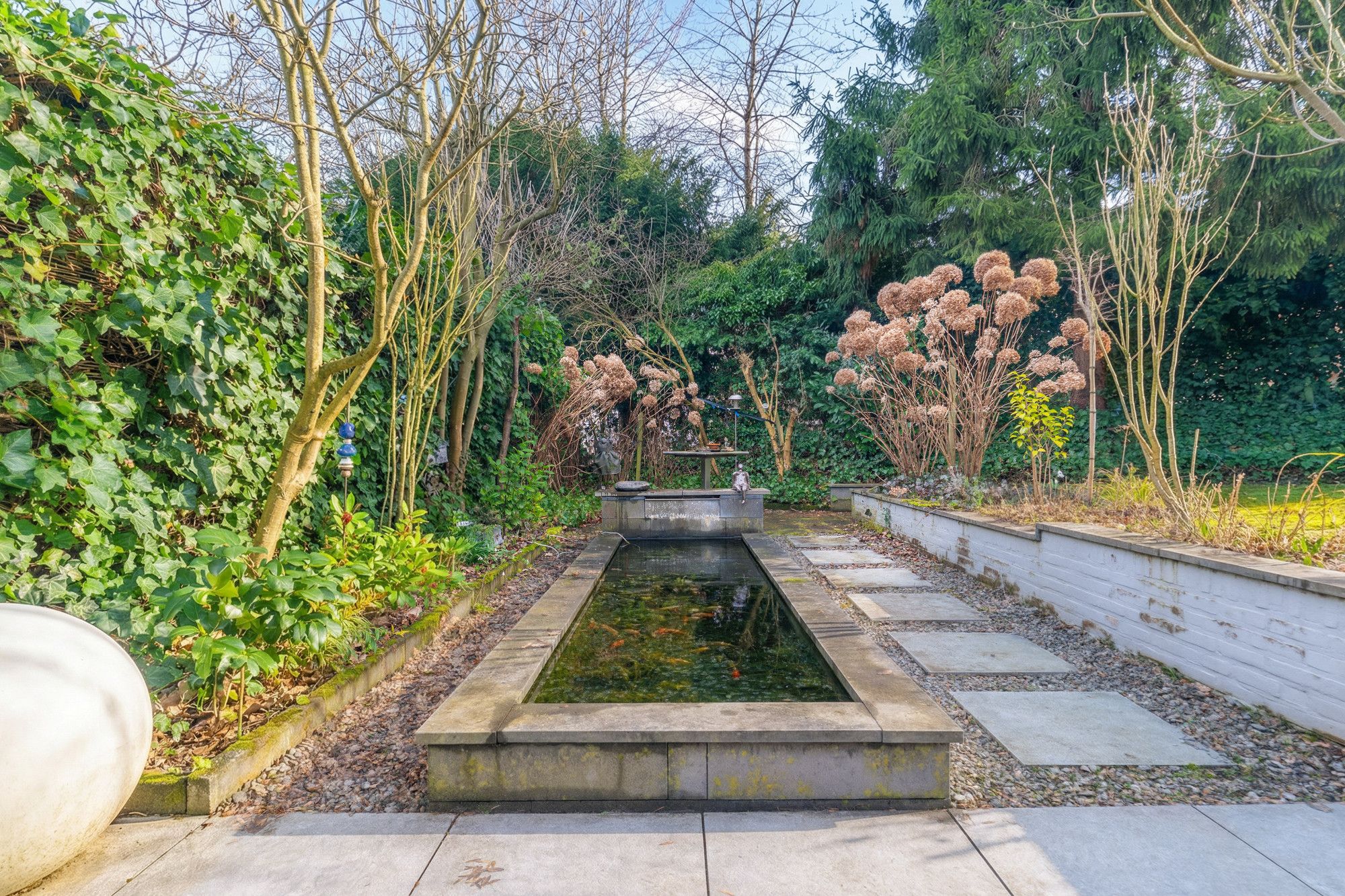De achtertuin is gelegen op het zuidoosten en biedt volop privacy. Hier vindt u een gazon, een vijverpartij, een beklinkerd pad en een ruime berging met aansluitend een overkapping met terras — een heerlijke plek om te genieten van het buitenleven.