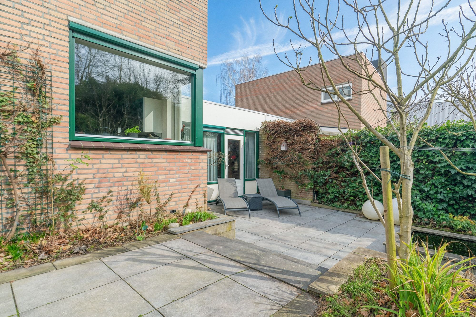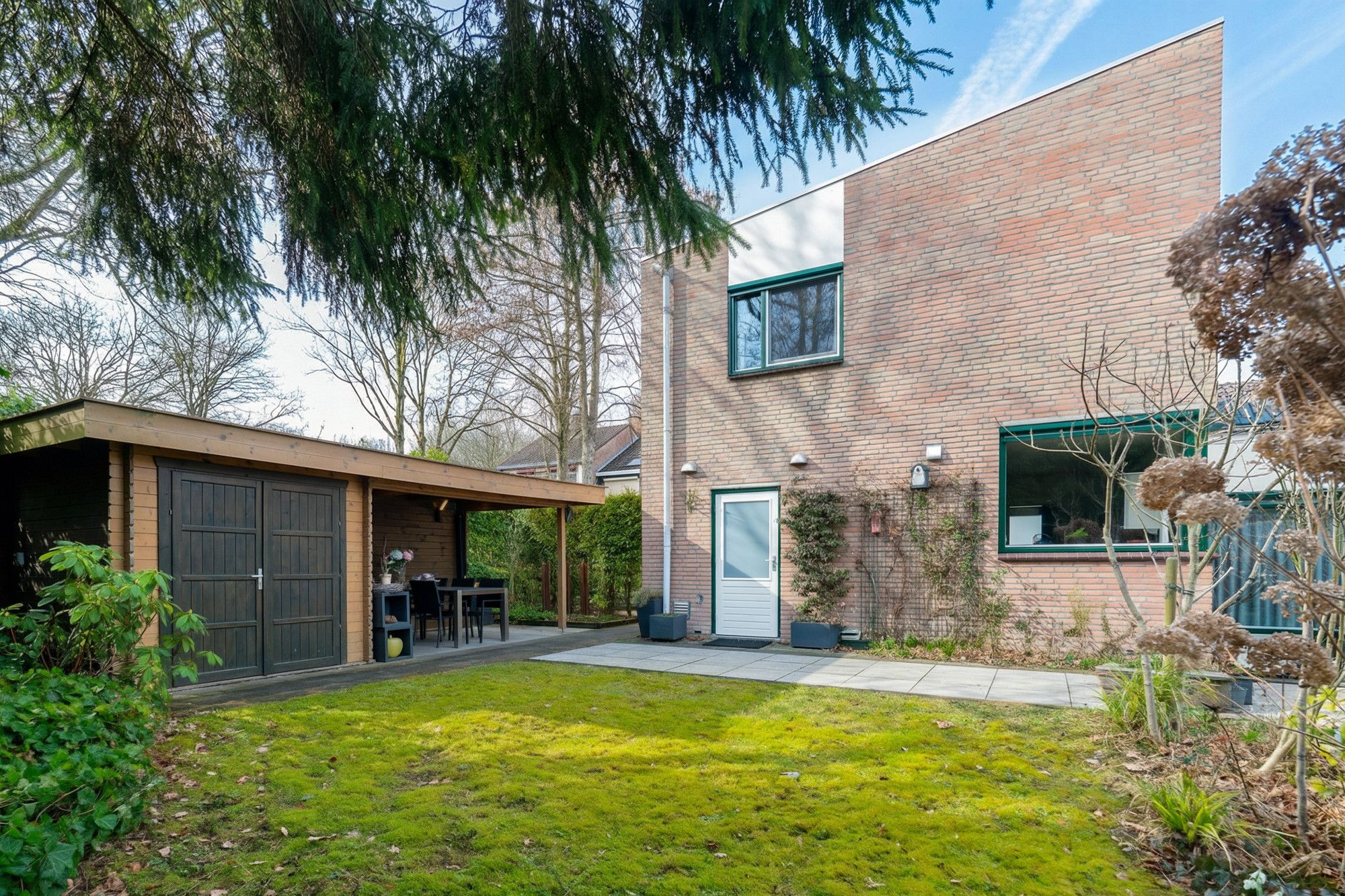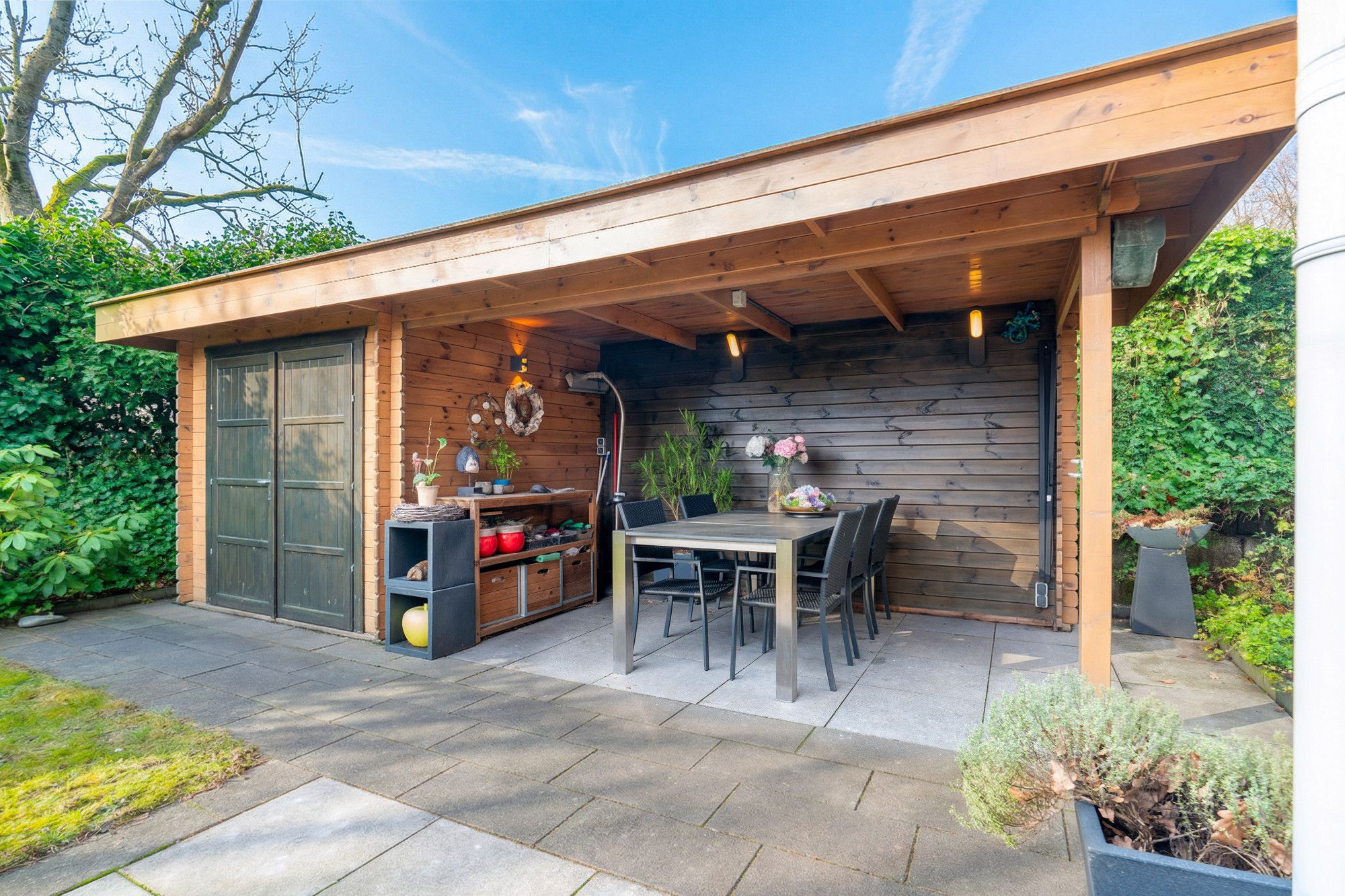 De achtertuin is gelegen op het zuidoosten en biedt volop privacy. Hier vindt u een gazon, een vijverpartij, een beklinkerd pad en een ruime berging met aansluitend een overkapping met terras — een heerlijke plek om te genieten van het buitenleven.