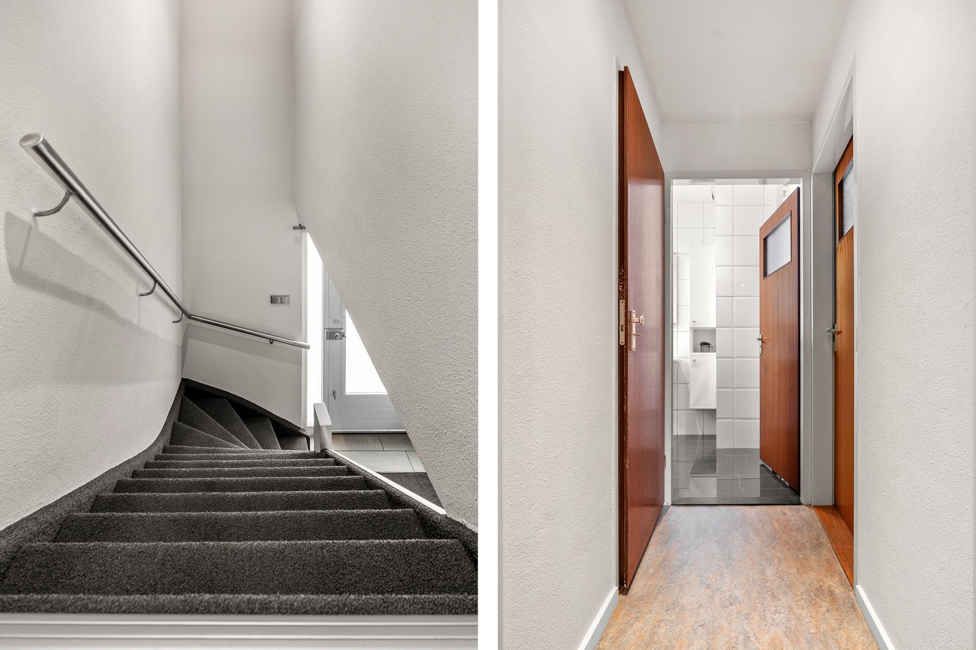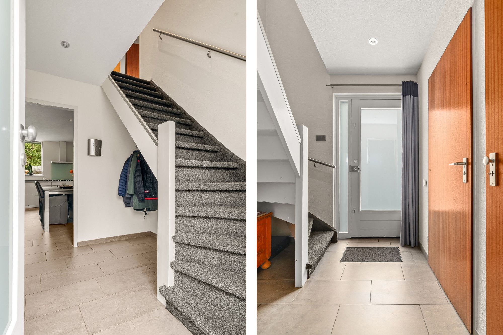 Via de entree bereikt u de ruime hal met meterkast, toiletruimte met hangcloset en vaste trap naar de eerste verdieping. Onder de trap is praktisch gebruikgemaakt van de ruimte met een garderobe.