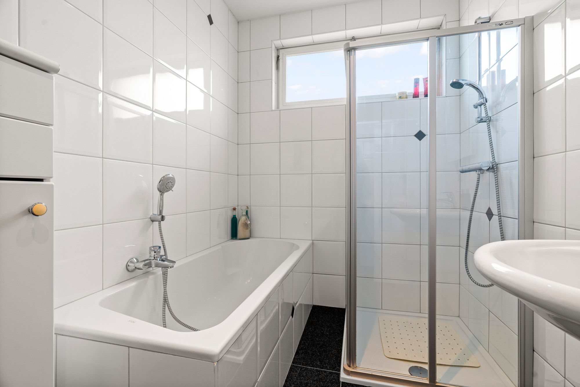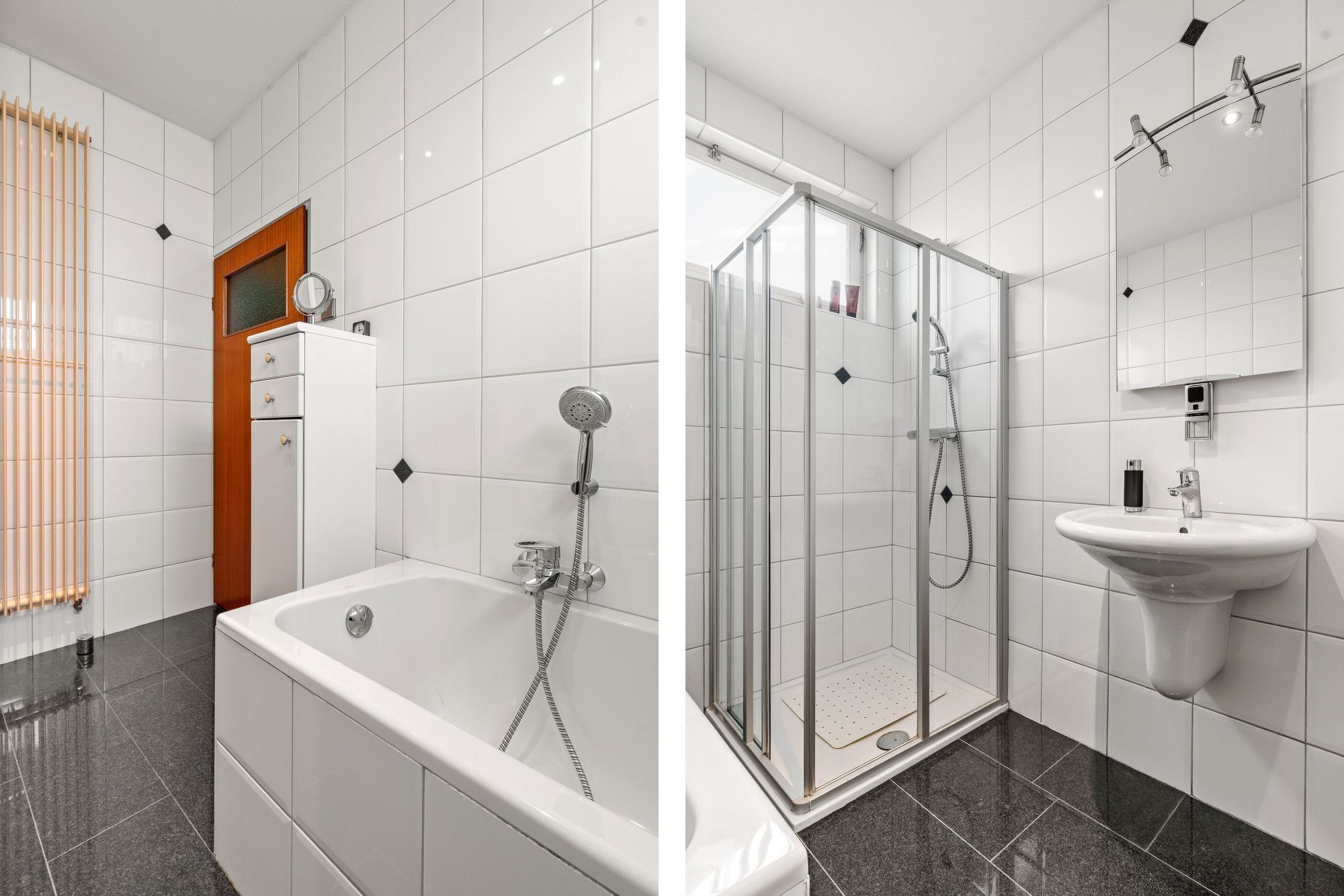 De geheel betegelde badkamer is compleet uitgerust met een ligbad, douche en wastafelmeubel.