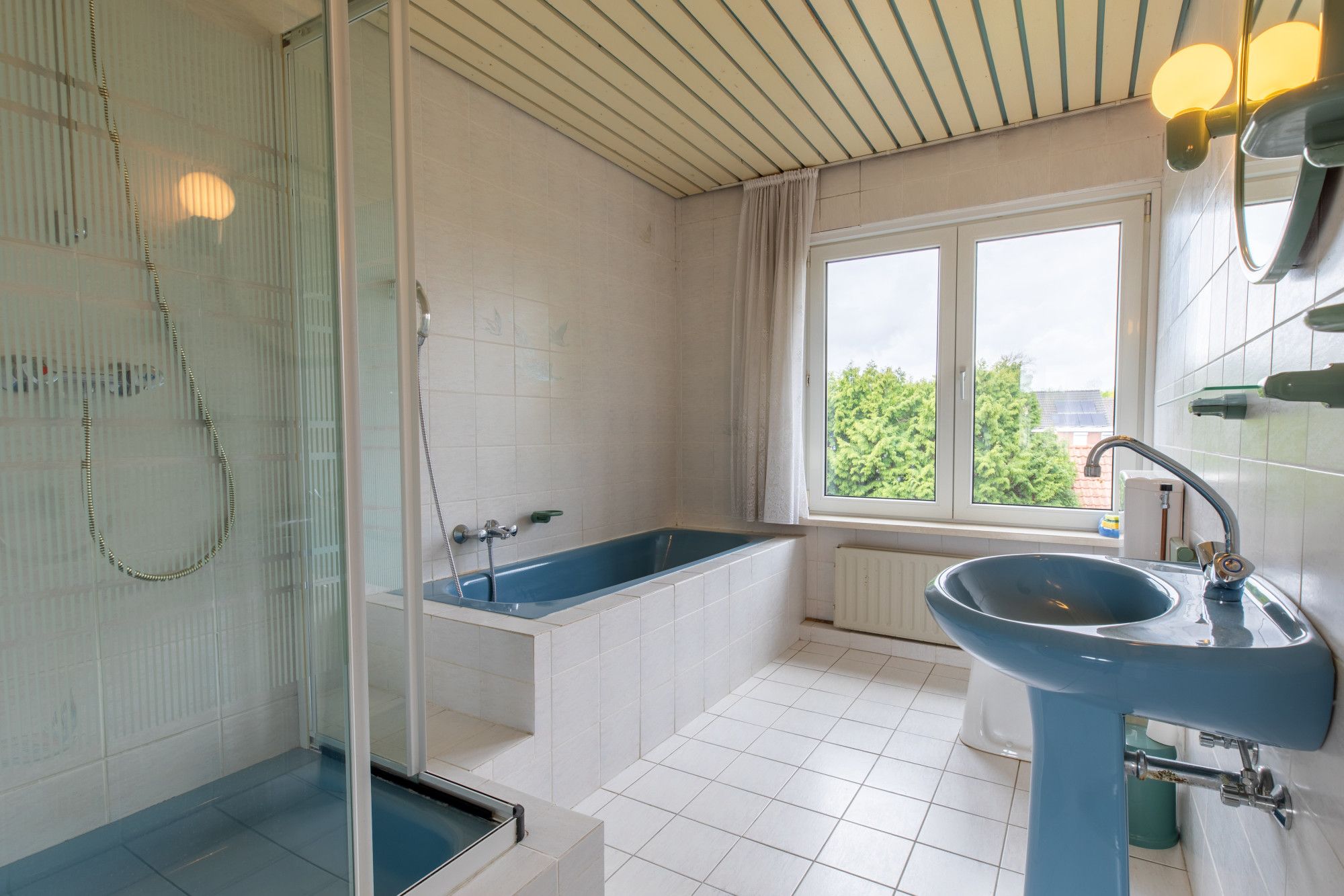 Geheel betegelde nette badkamer (3.02 x 2.30 m) voorzien van douche, ligbad, vaste wastafel en duo-closet toilet.