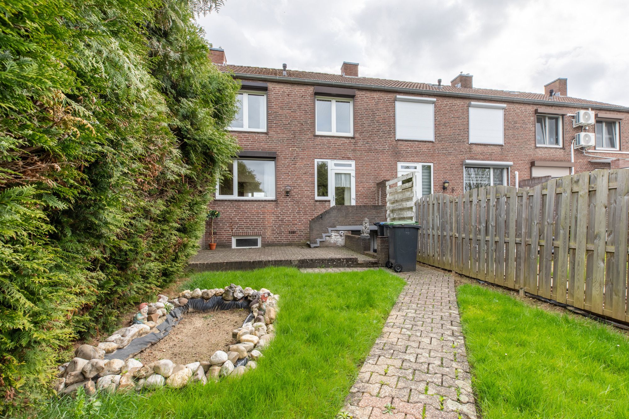 Achtertuin met achter-ingang, terras en gazon.