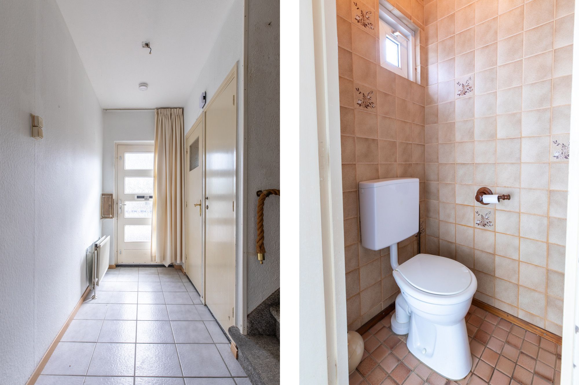 Deels betegeld toilet met duo closet toilet.