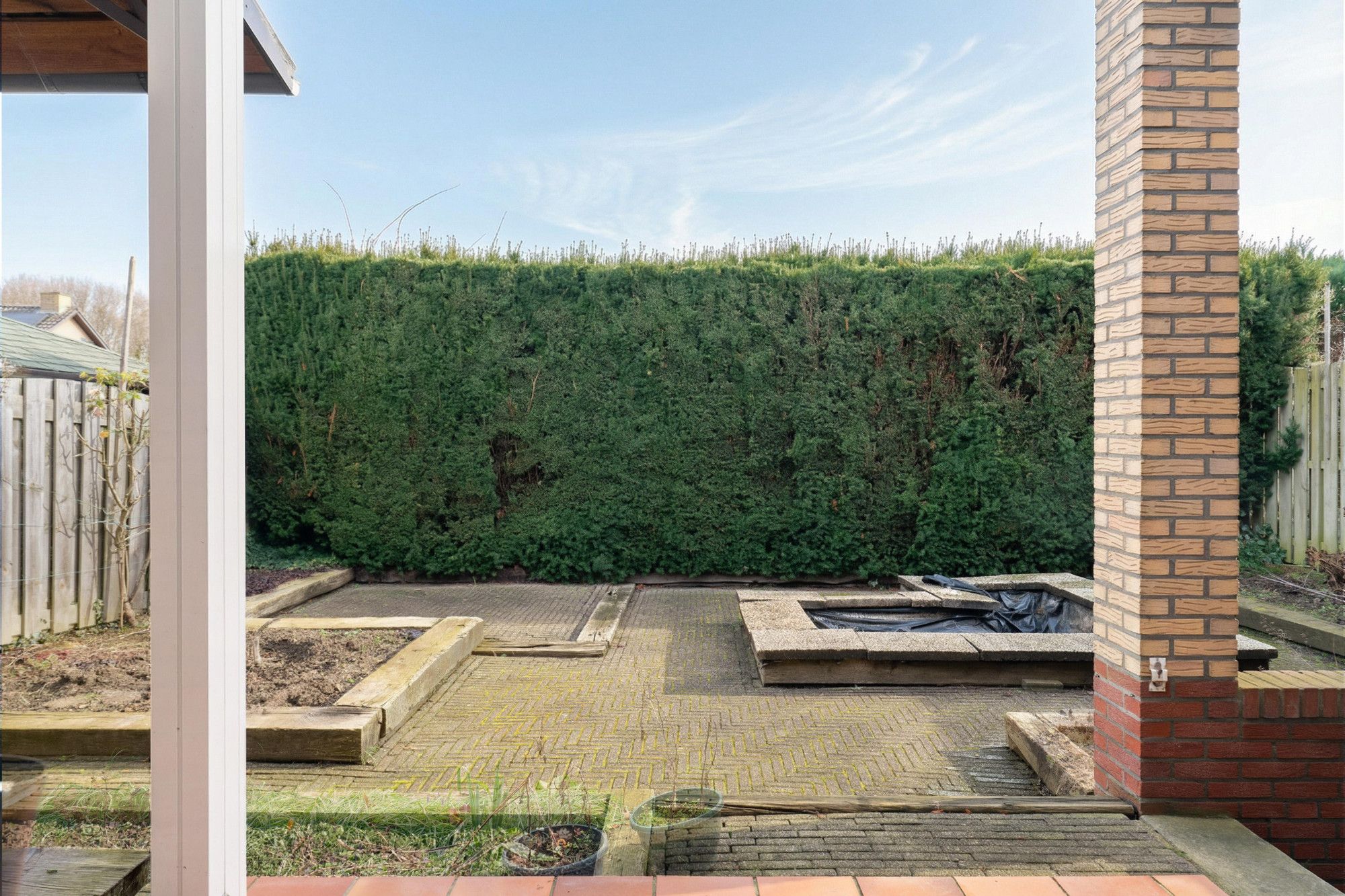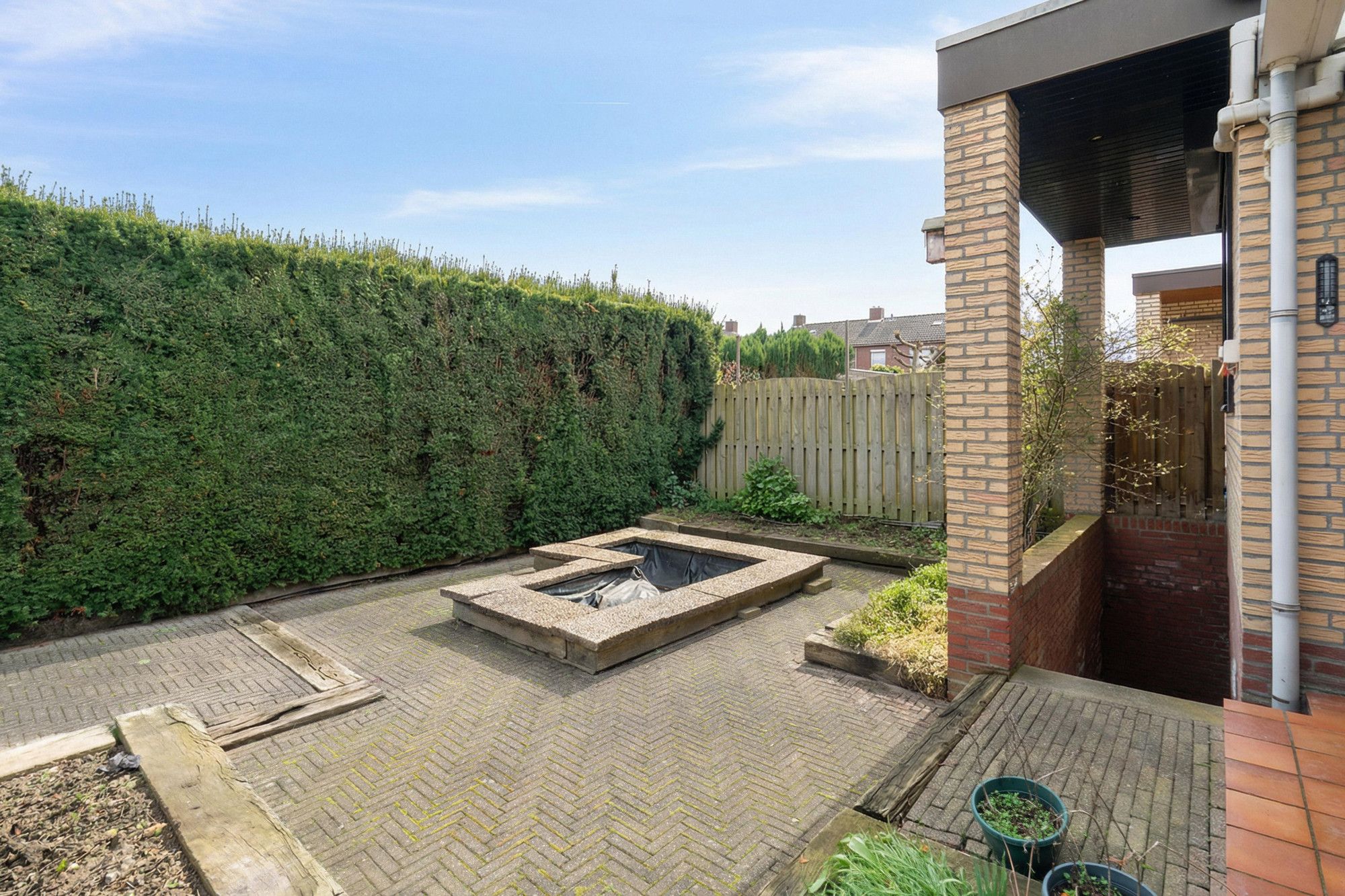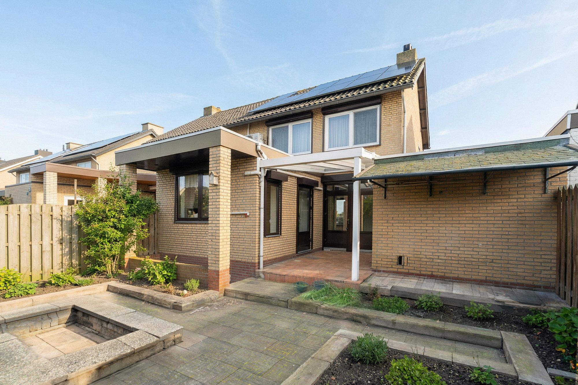 De fraai aangelegde tuin met overkapping en tegelvloer vormt een verlengstuk van de woonkamer.