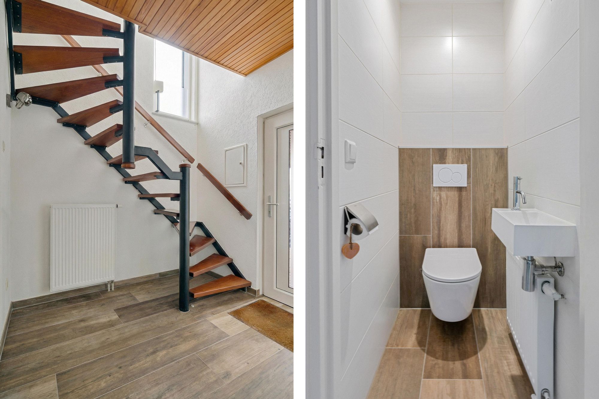 Verzorgde entree met moderne meterkast en volledig betegeld toilet met fonteintje.