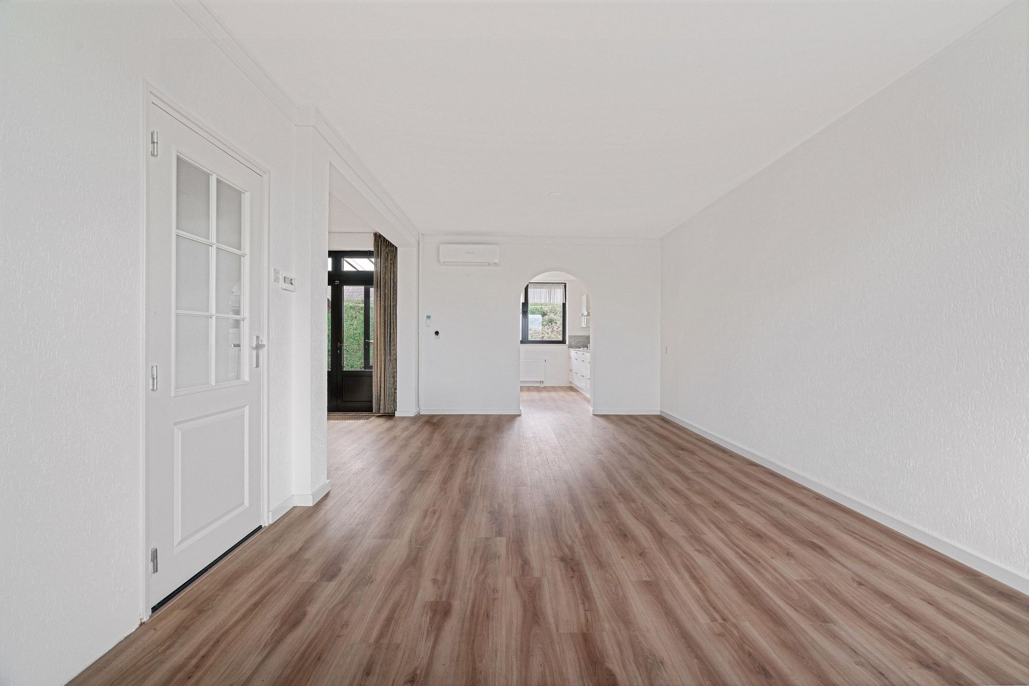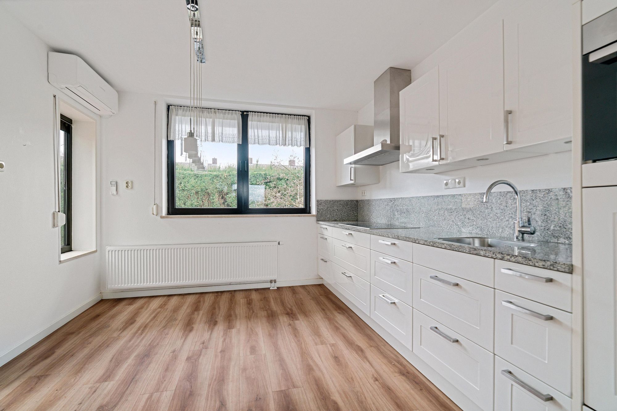 De sfeervolle L-woonkamer (7.26 x 3.67 m / 6.10 x 3.02 m) beschikt over een laminaatvloer, airconditioning en mogelijkheid voor een haardpartij. Grote raampartijen en twee openslaande deuren zorgen voor prachtig contact met de tuin en veel natuurlijke lichtinval.