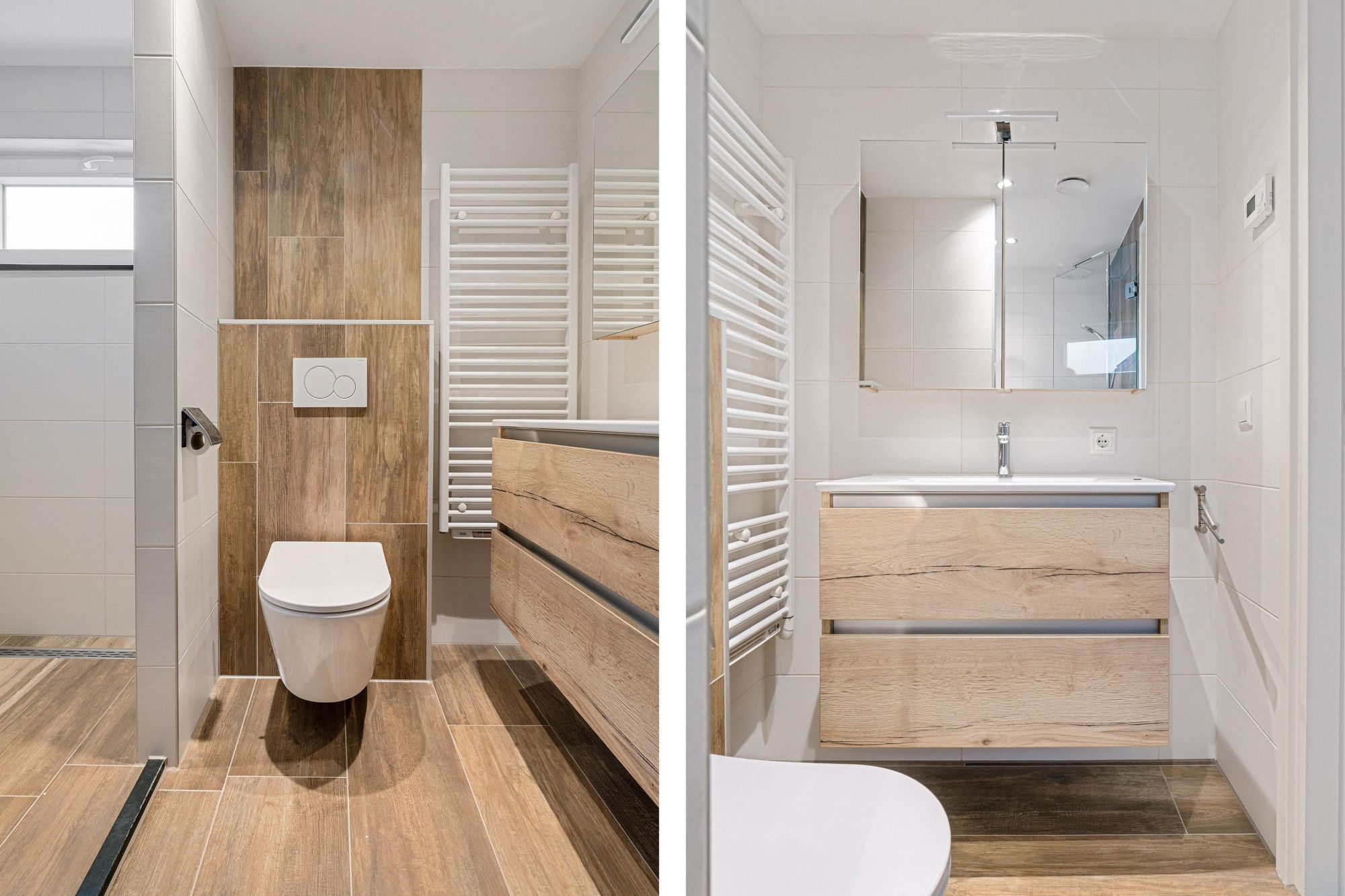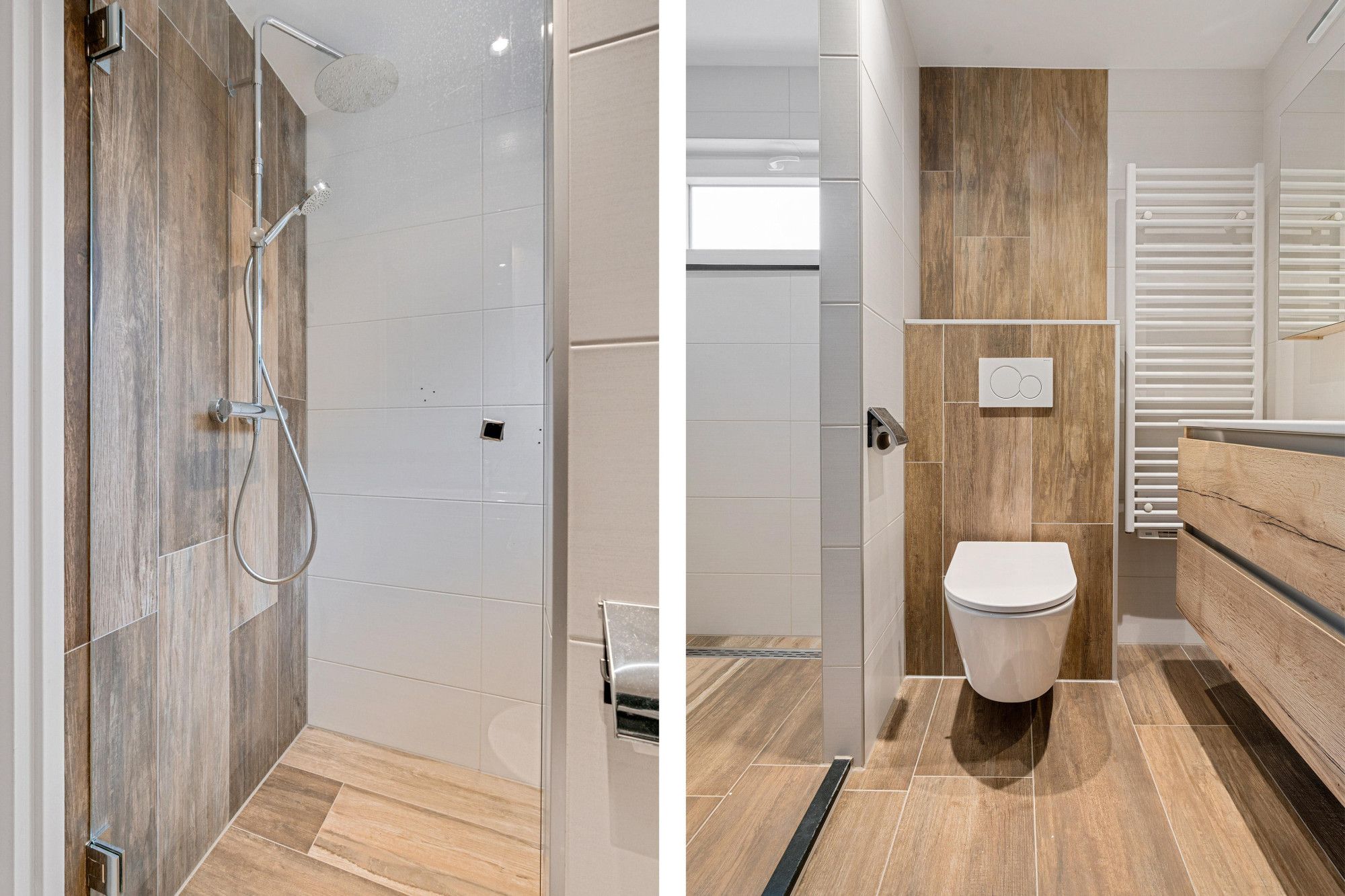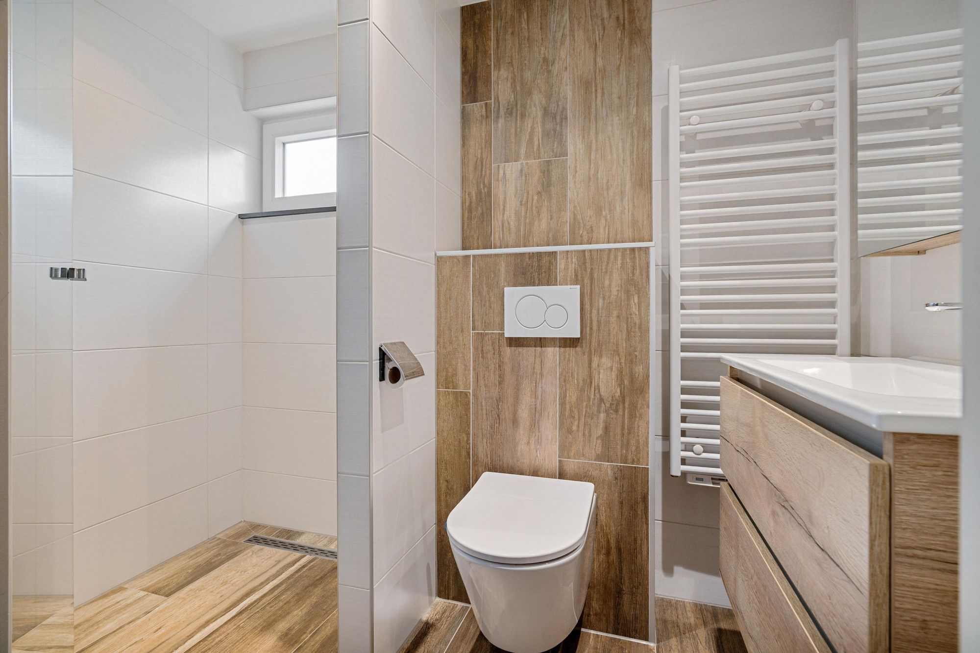 Complete badkamer (2.44 x 1.39 m) met inloopdouche, vaste wastafel en sierradiator.