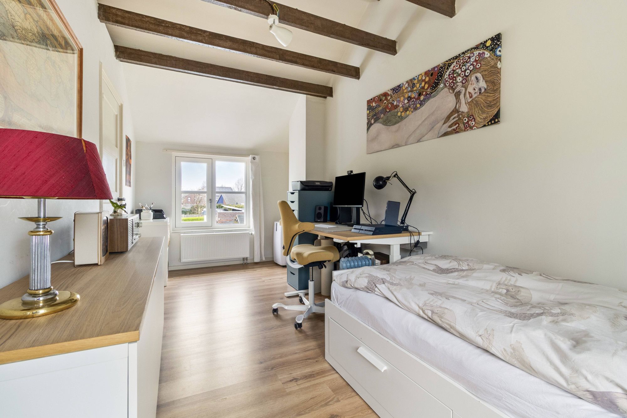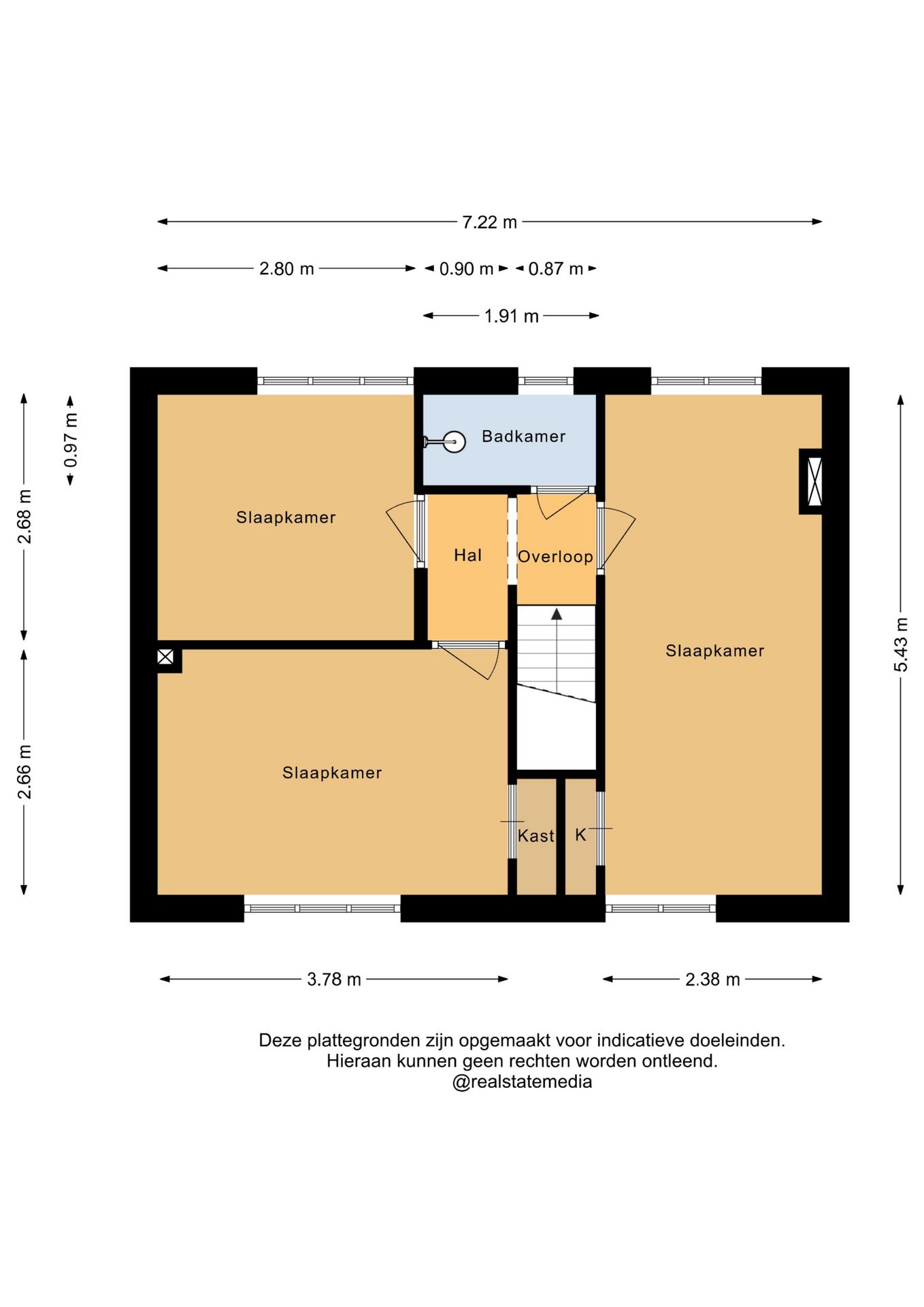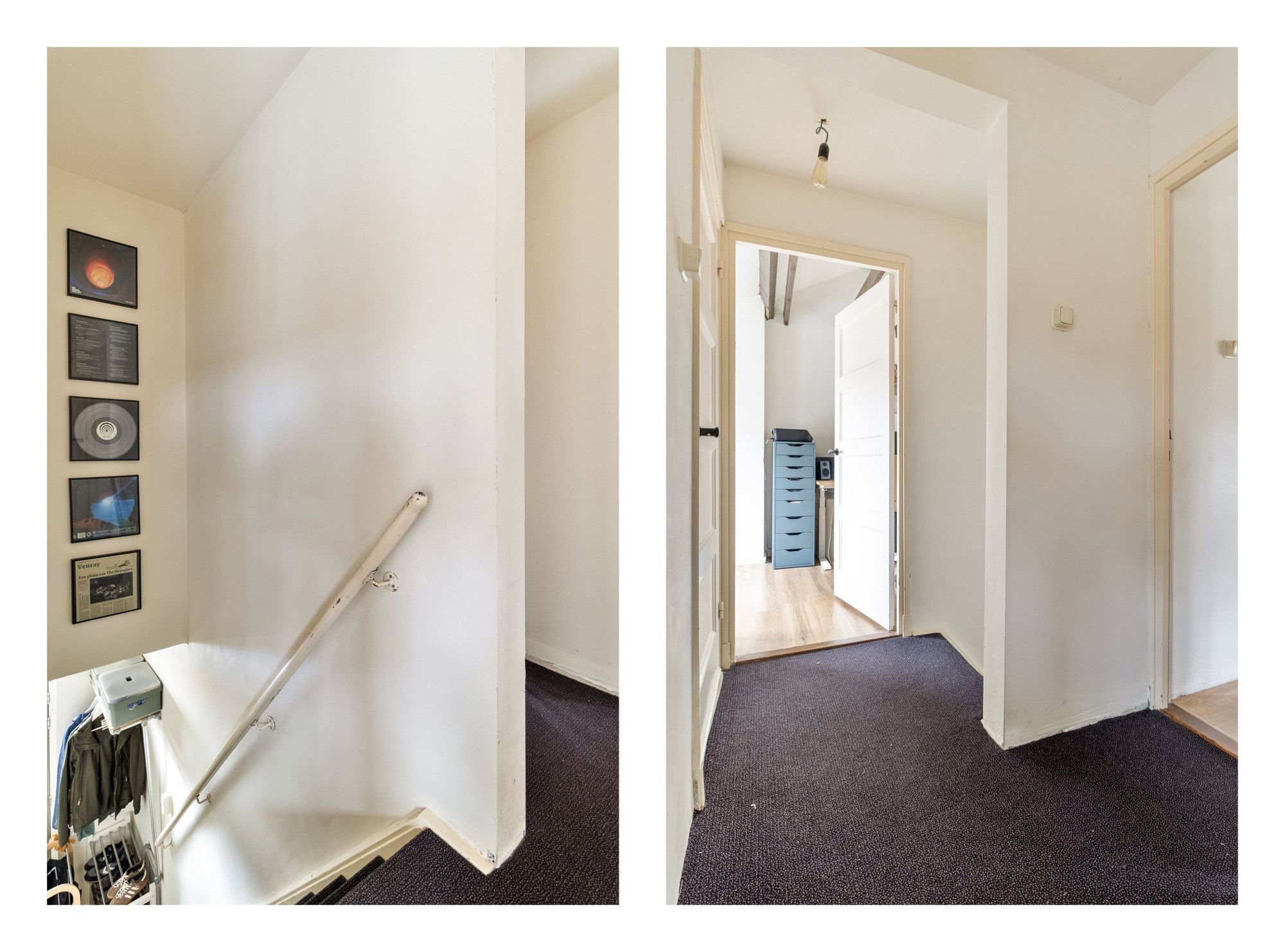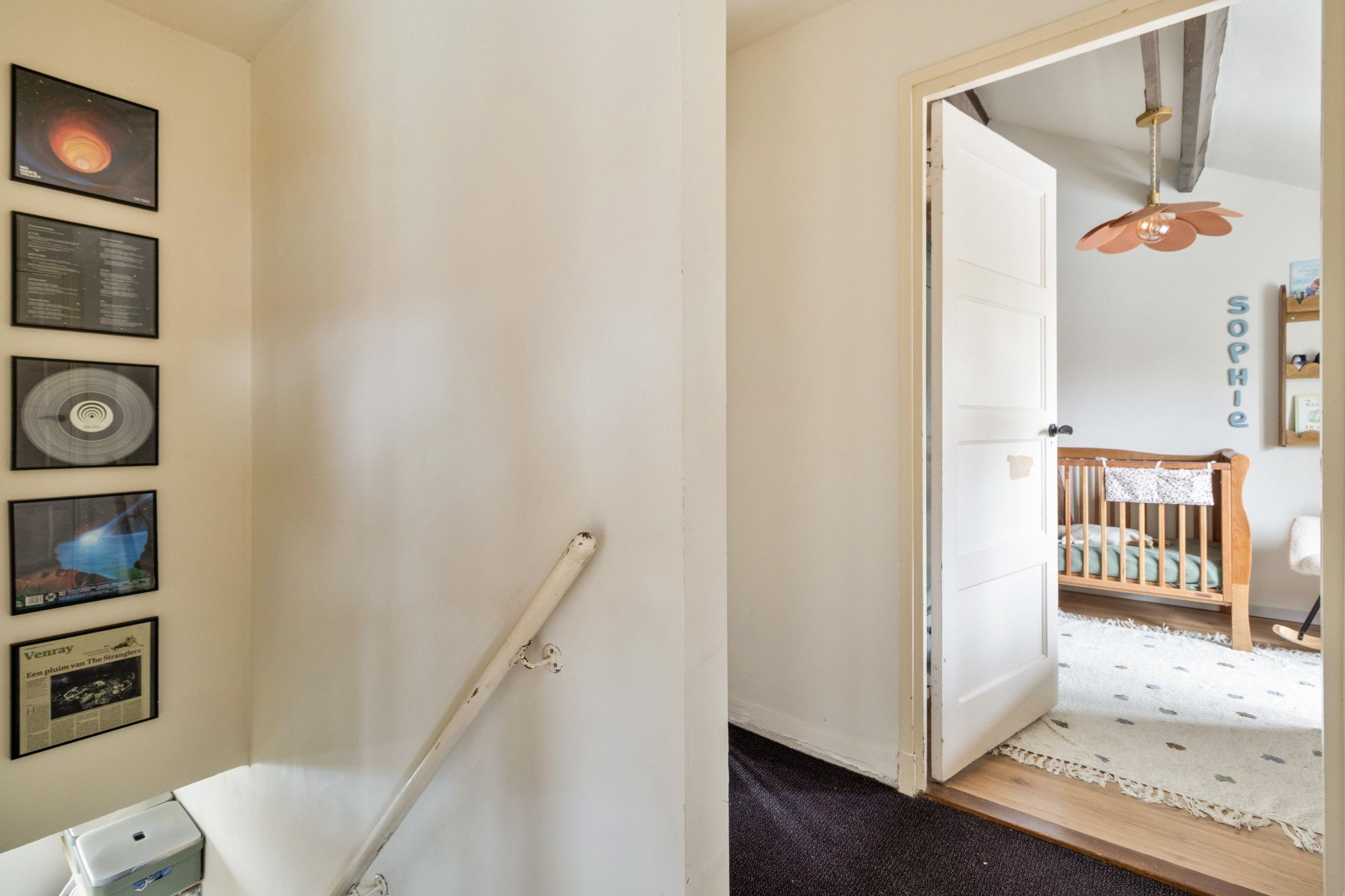 Via de trap kom je uit op de overloop. Vanuit hier is er toegang tot drie slaapkamers en een badkamer.