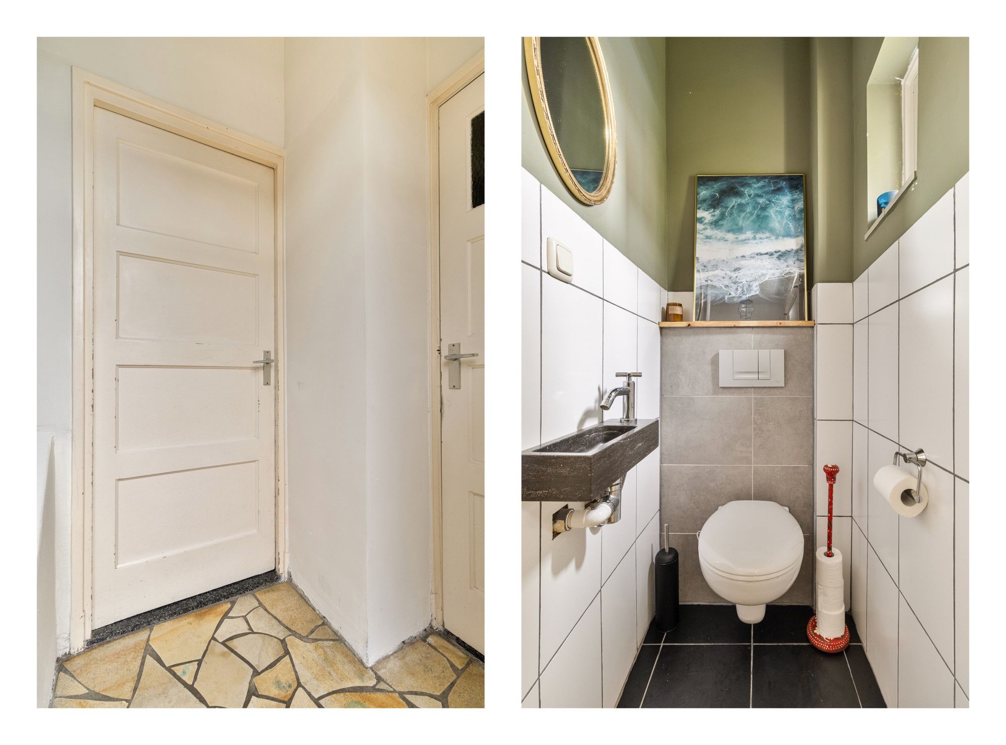 Via de entree kom je binnen in de hal met toilet en trapopgang naar de eerste verdieping. Vanuit de hal is er toegang tot de woonkamer.