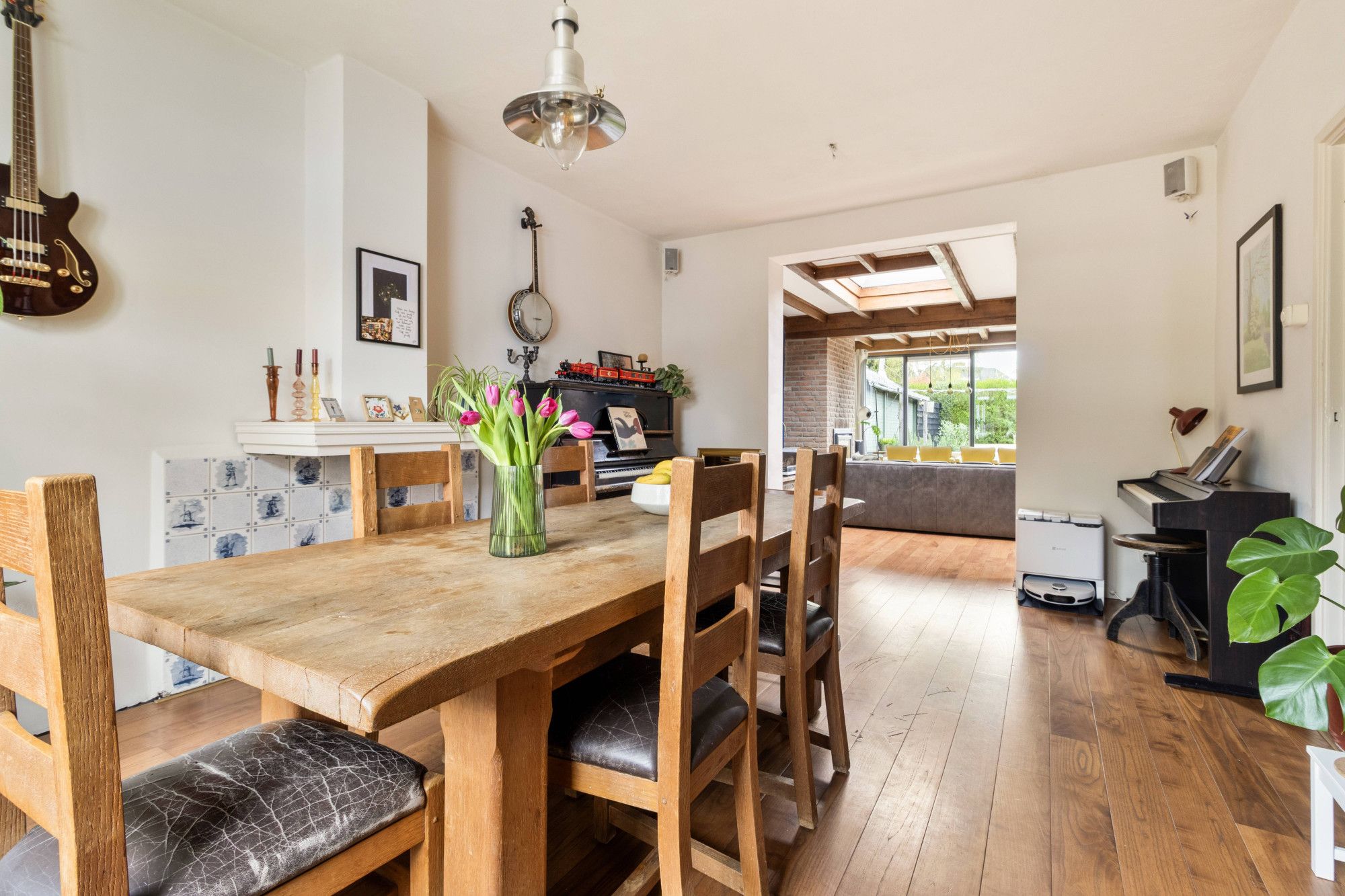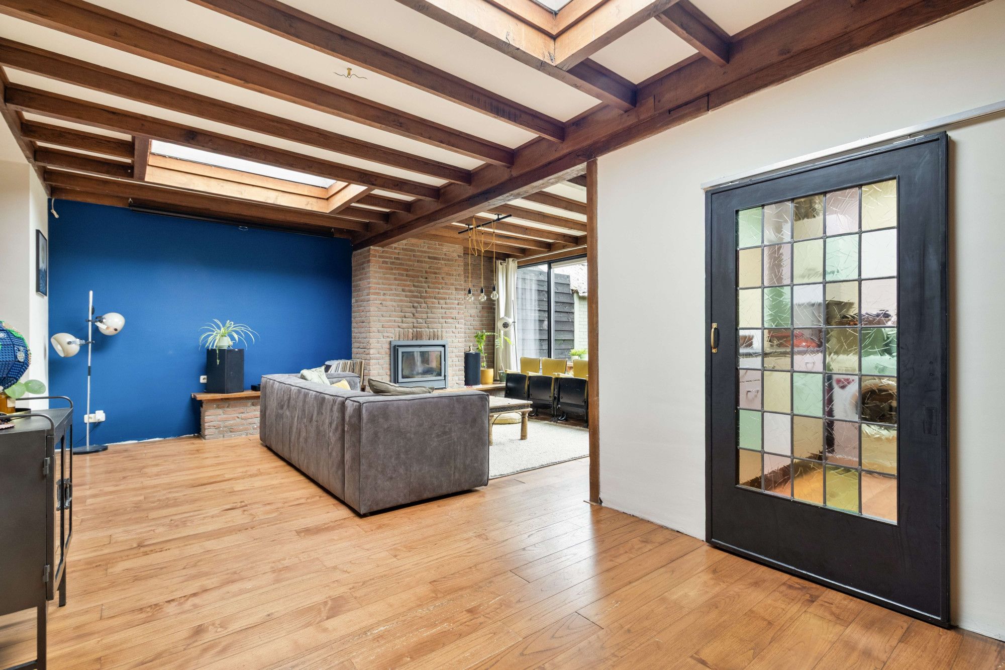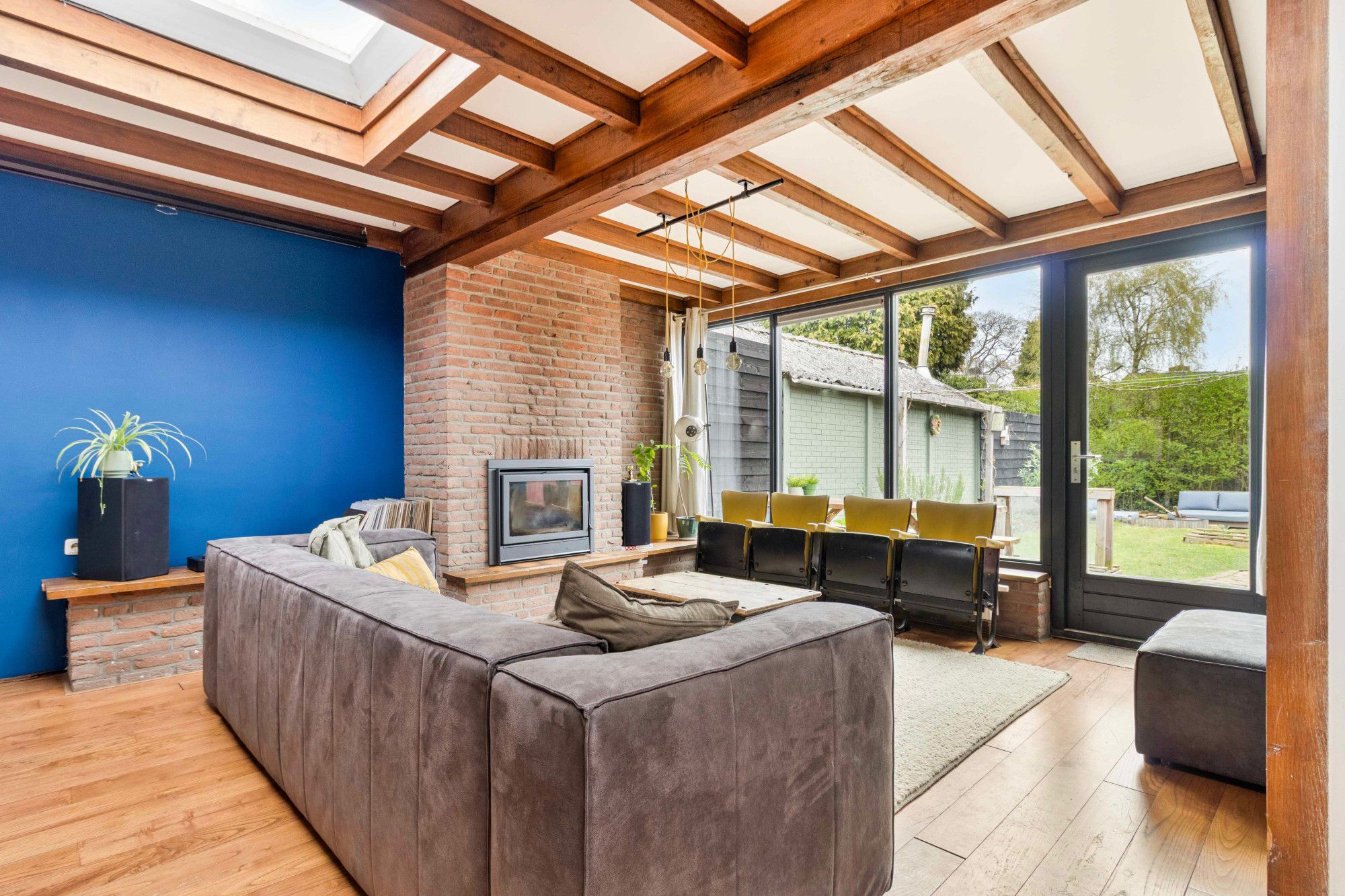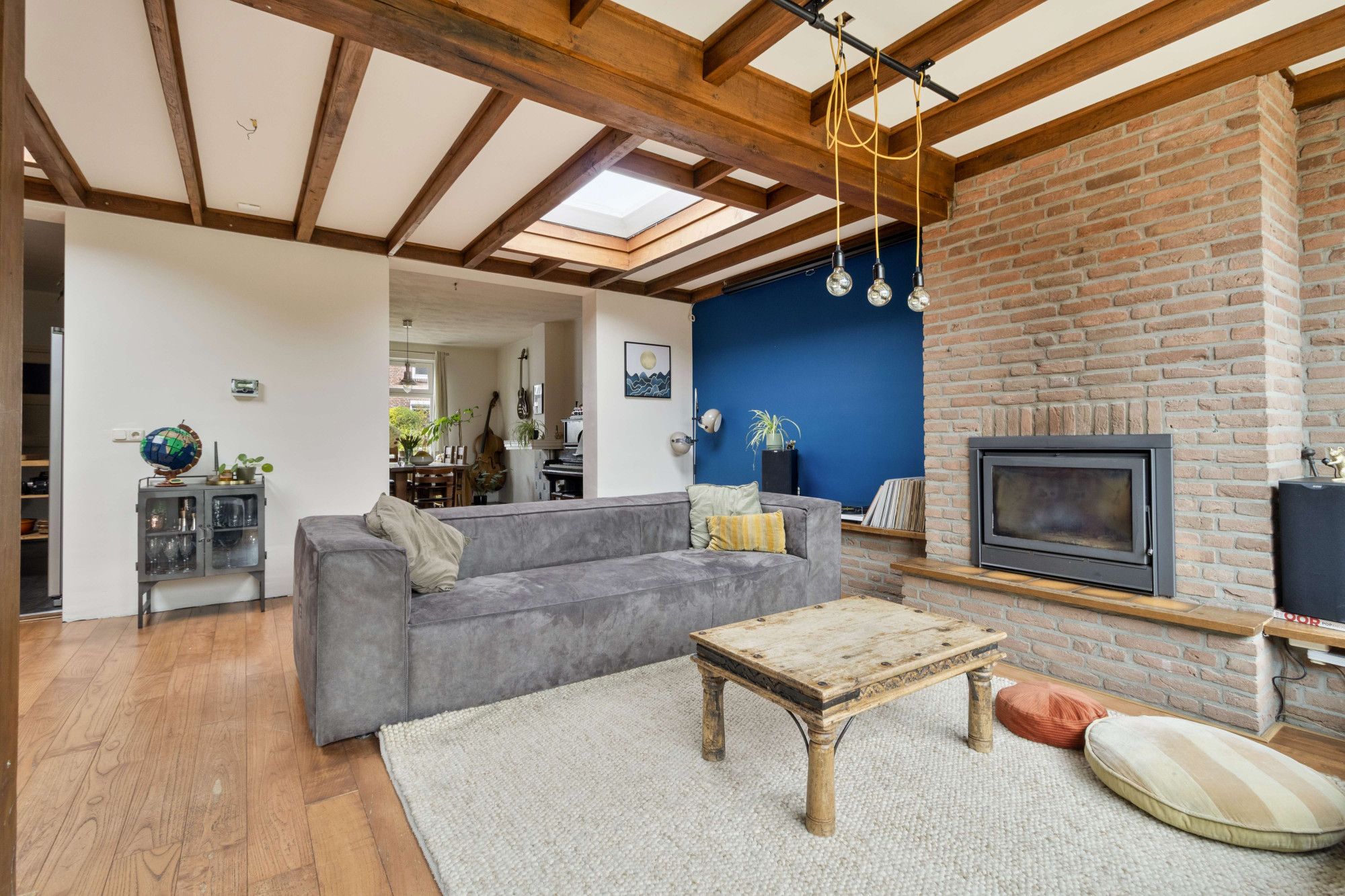 De woonkamer is ruim opgezet, mede door de grote uitbouw, en biedt voldoende plaats voor een comfortabele zithoek en een eettafel. In de woonkamer ligt een lamel-parketvloer en in de uitbouw is een sfeervolle houtkachel aanwezig. Dankzij de raampartijen is er een prettige lichtinval in de woning.