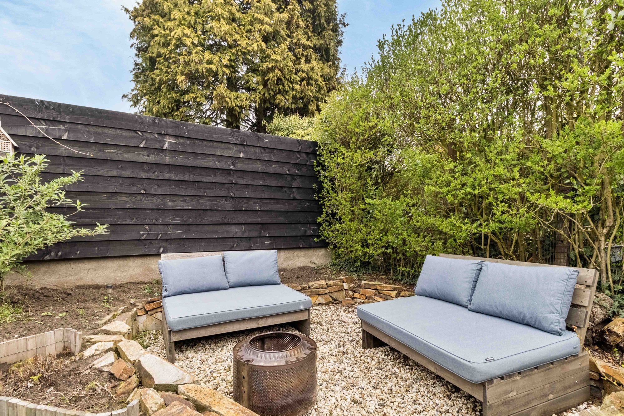 Achter in de tuin bevindt zich een zitkuil, een heerlijke plek om in alle rust te zitten en optimaal van de tuin te genieten. De zitkuil is voorzien van een drainagebuis in de hoek, waarmee hemelwater wordt afgekoppeld van het riool. Deze voorziening functioneert goed, waardoor er zelden tot nooit water in de zitkuil blijft staan.