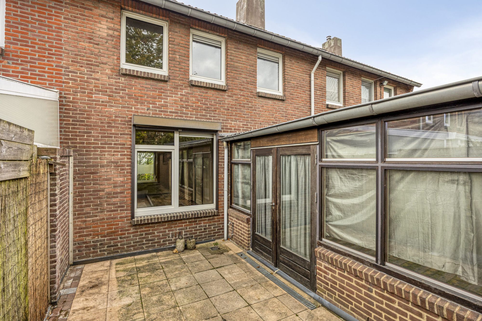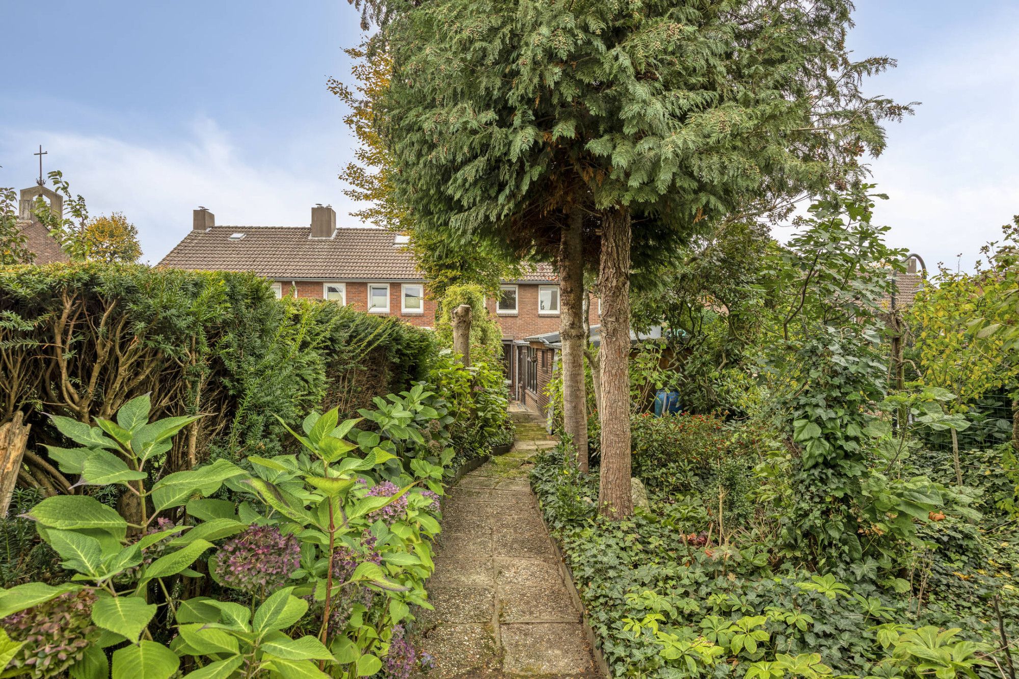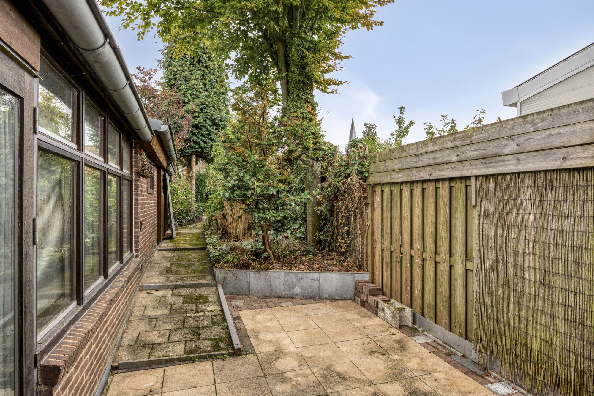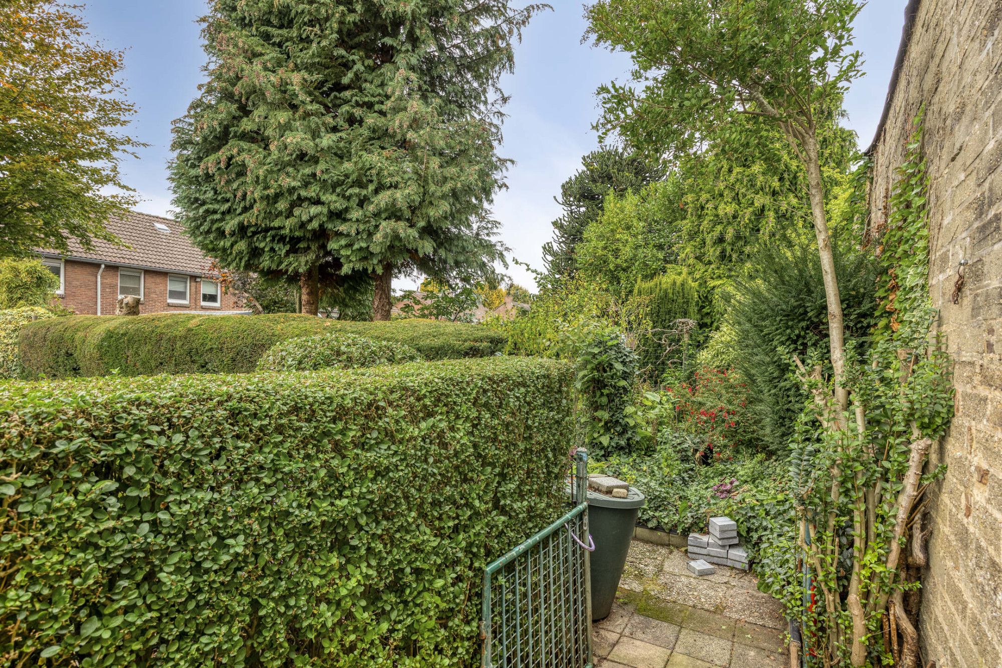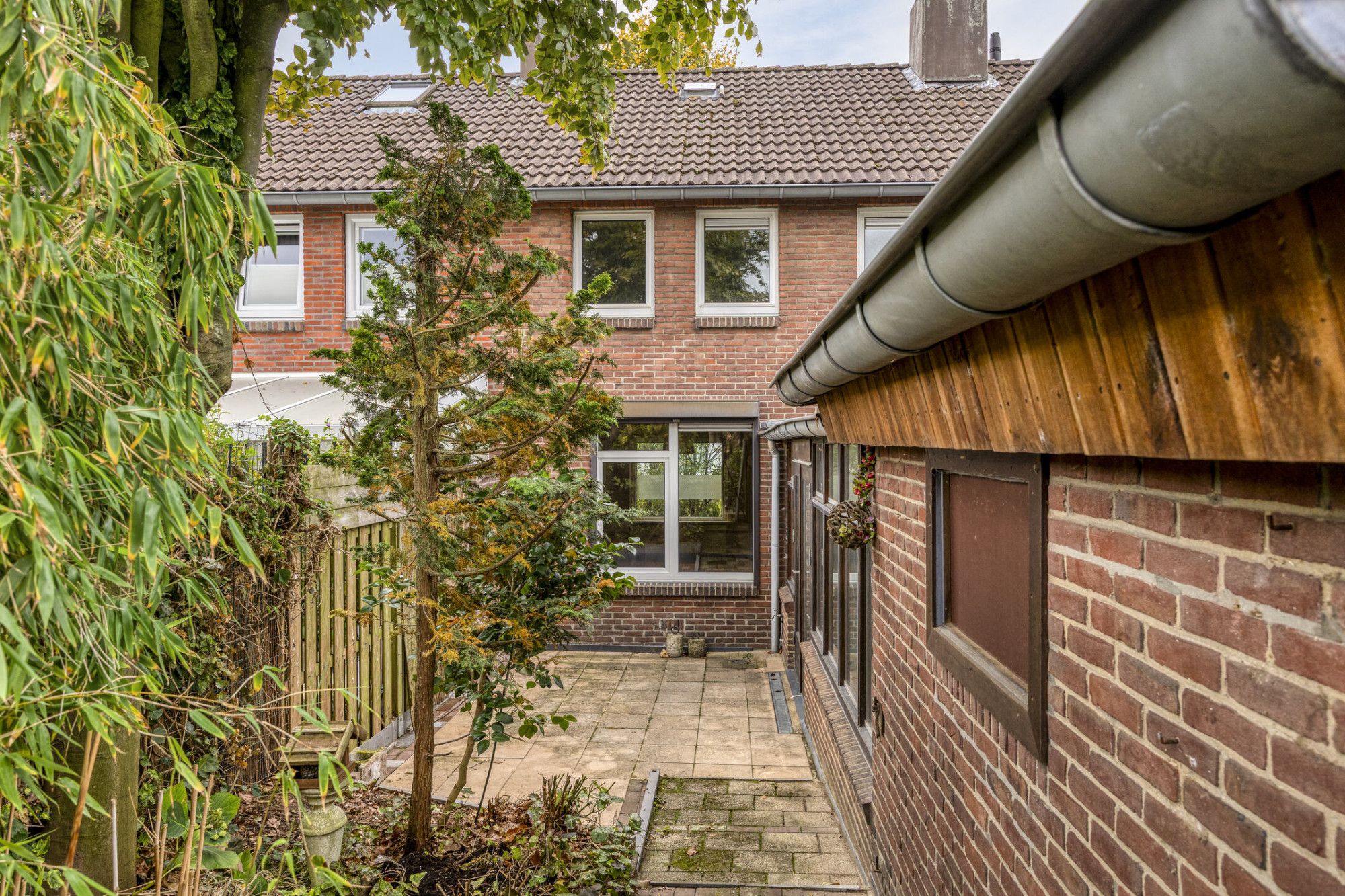 Zeer diepe (circa 22 meter) achtertuin met terras, begroeiing en achter in/uitgang.