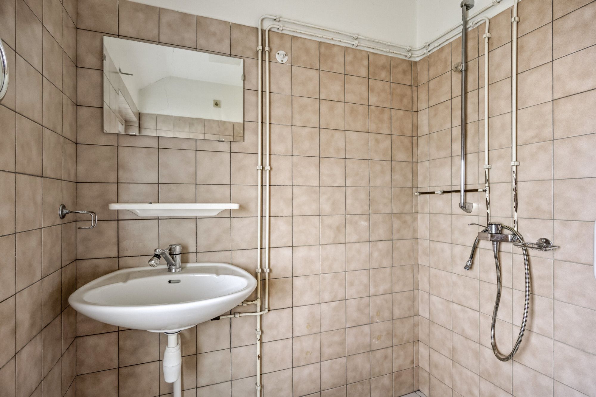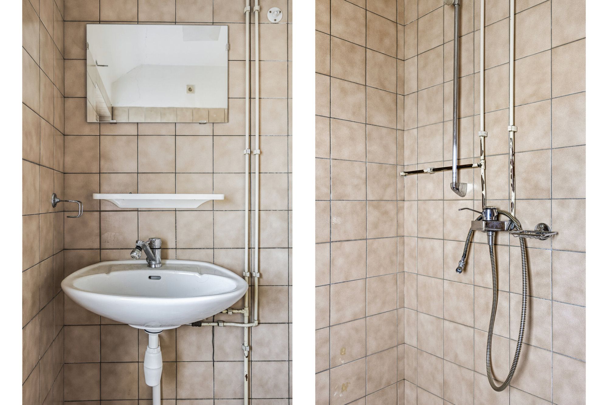 Deels betegelde badkamer (1.92 x 1.40 m) met inloopdouche en vaste wastafel.
