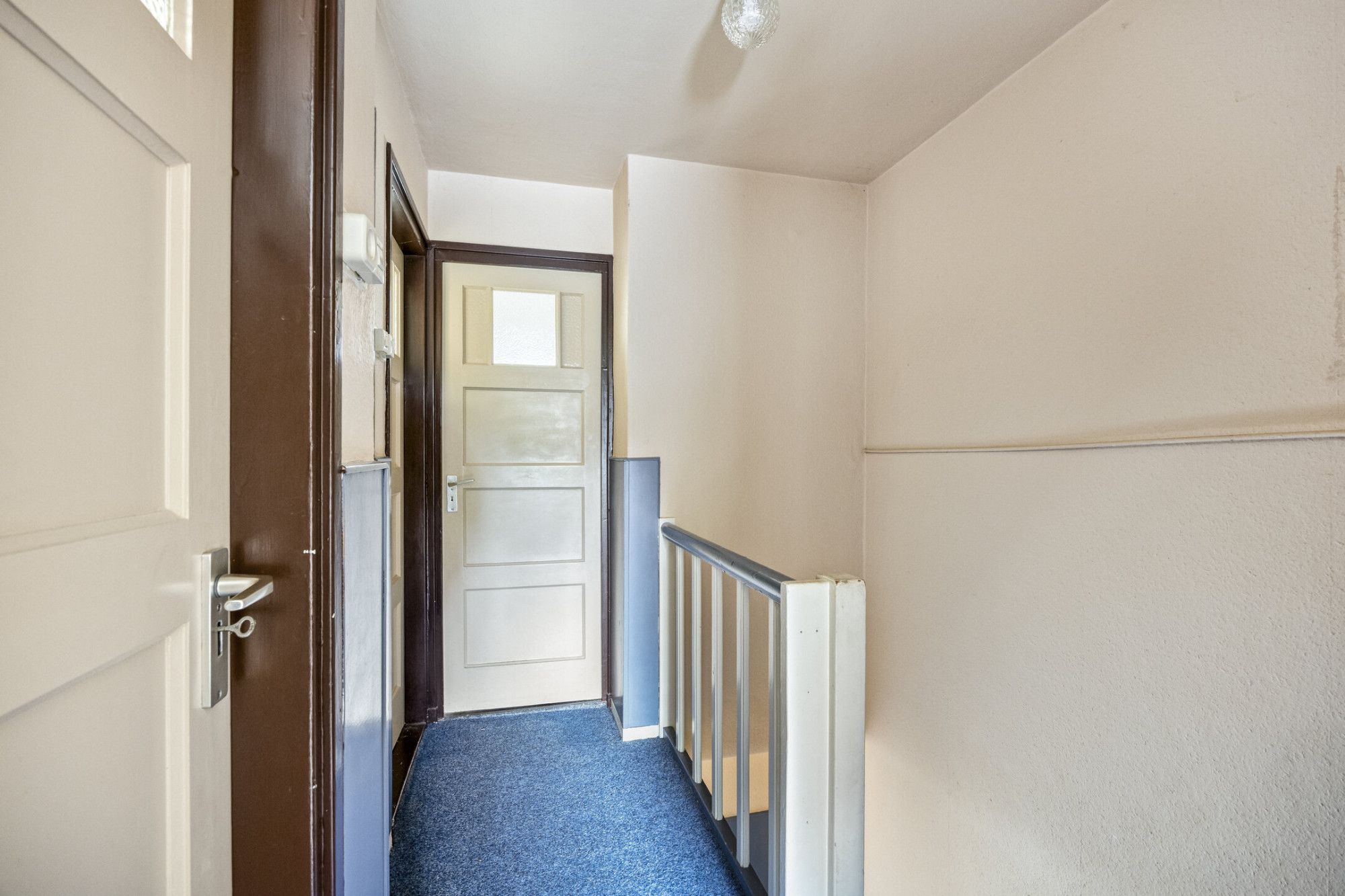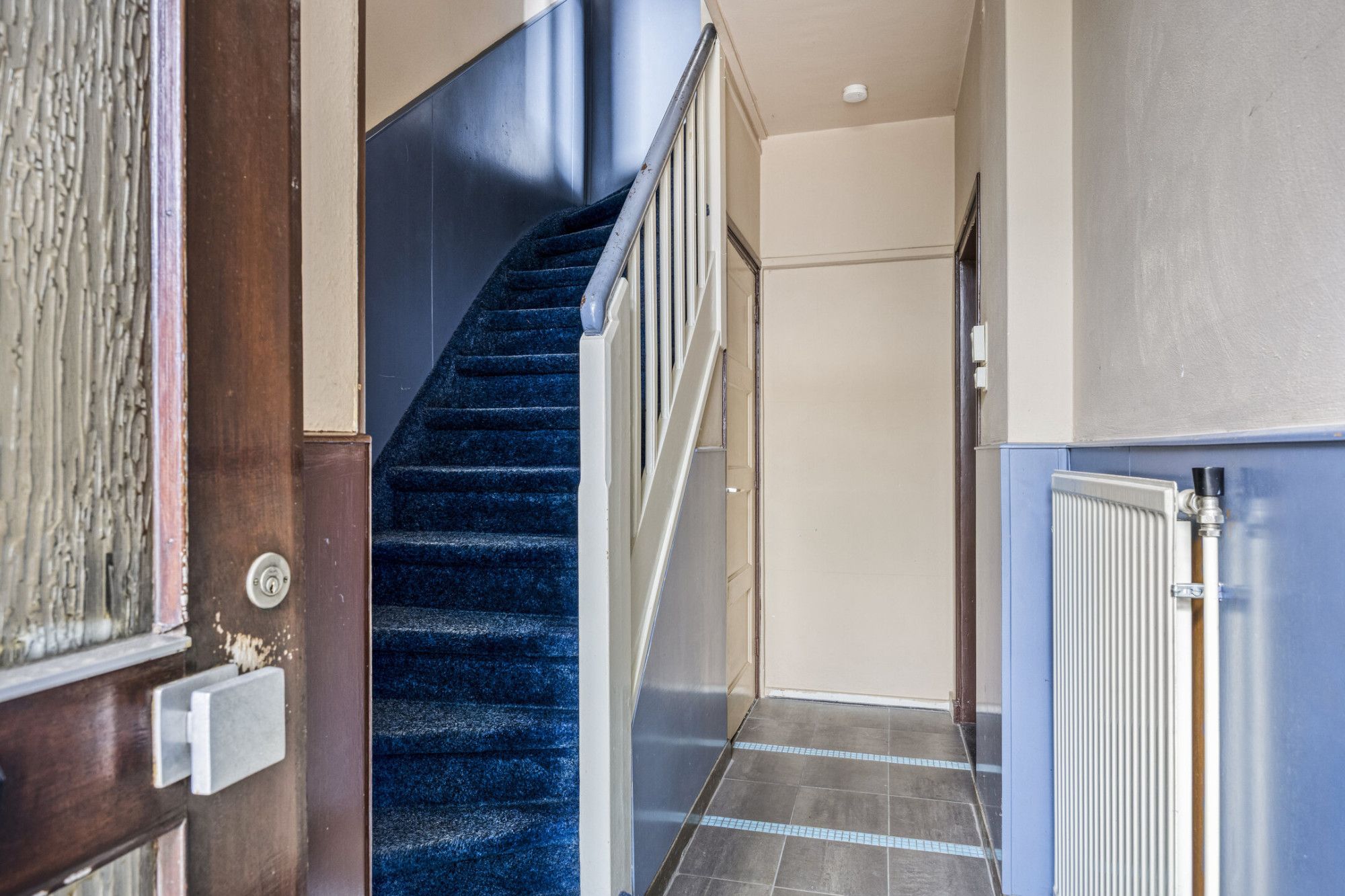 Ontvangsthal voorzien van tegelvloer, moderne uitvoering meterkast en met trap naar verdieping en souterrain.