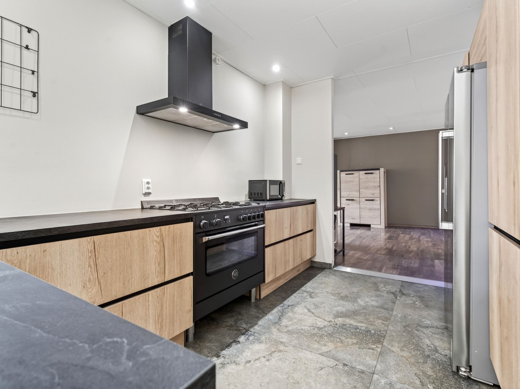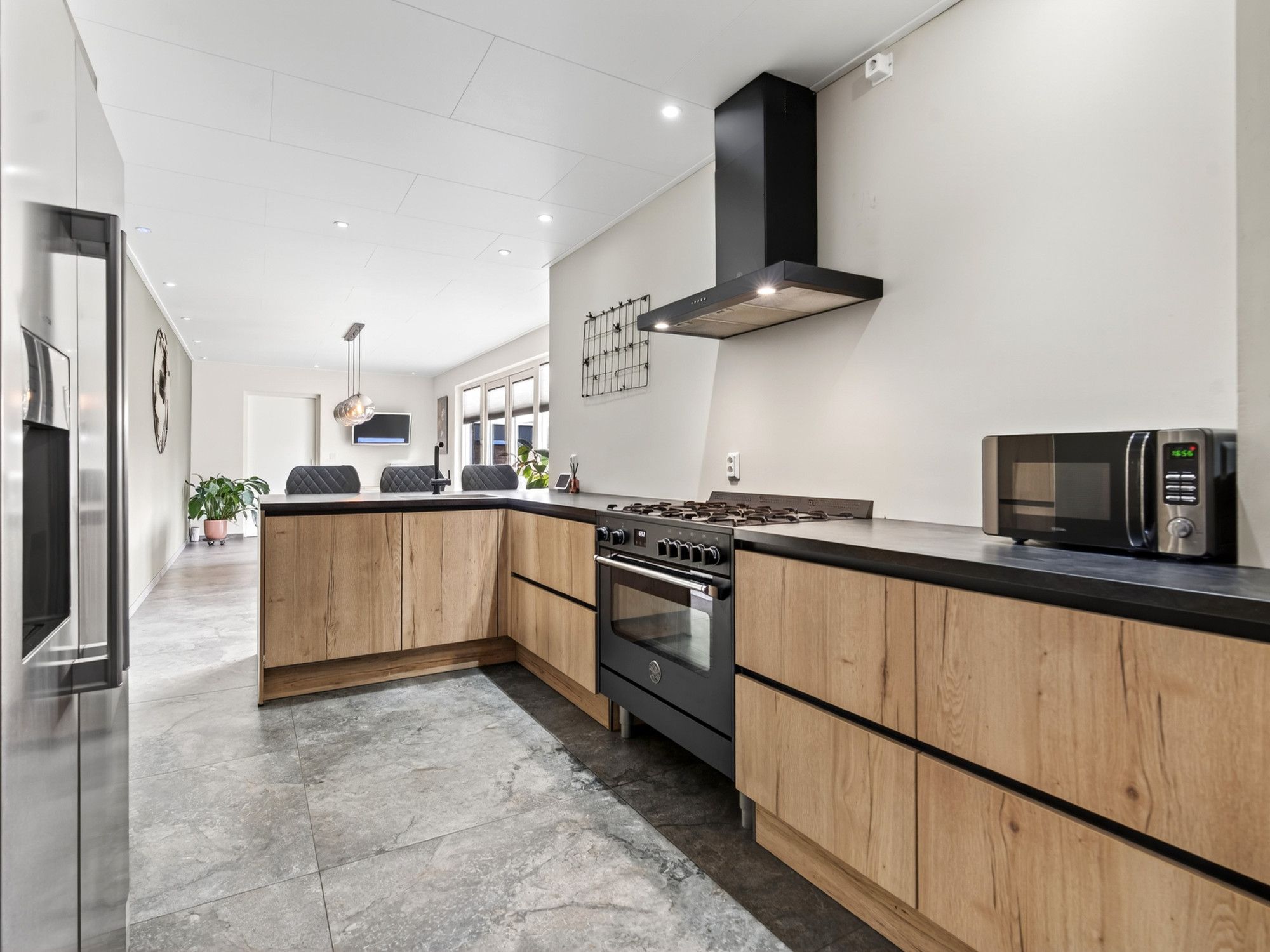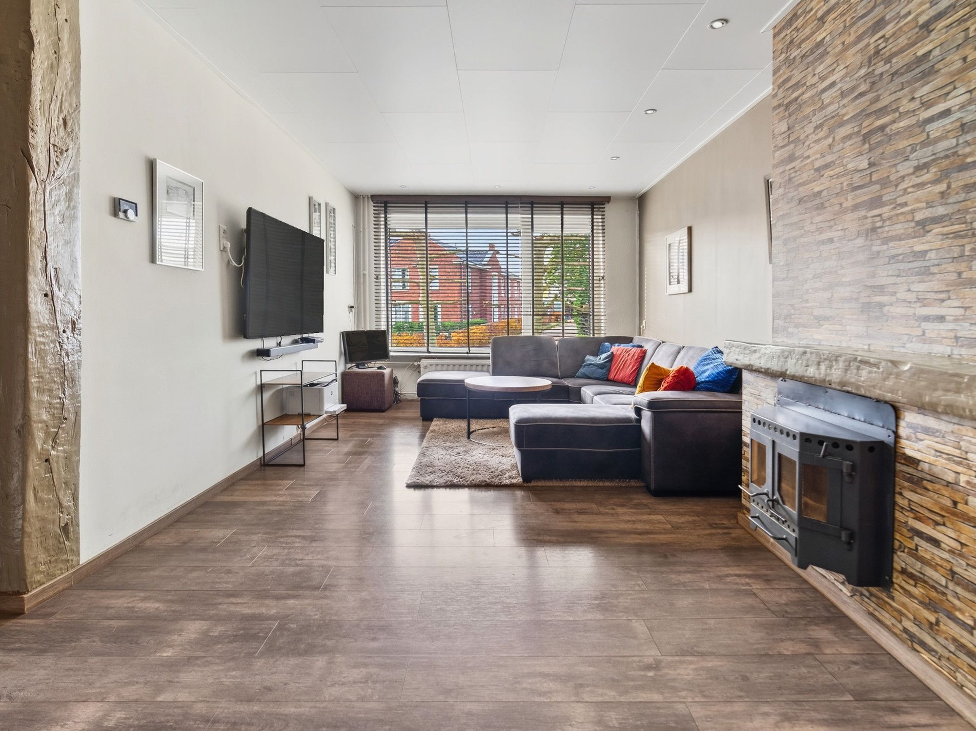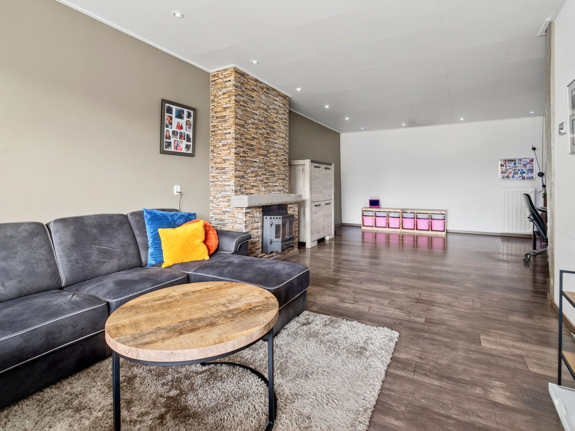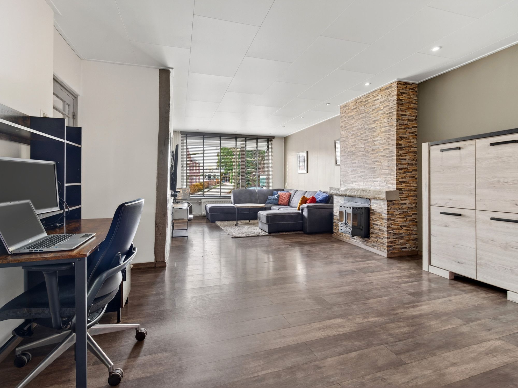 De woonkamer heeft een laminaatvloer, grote raampartijen met elektrisch rolluik en een sfeervolle (niet in werking zijnde) open haard. De open keuken is modern ingericht met een 5-pits gasfornuis, grote oven, afzuigkap, vaatwasser, Amerikaanse koelkast. Vanuit de keuken loop je door naar de aanbouw met bar, eetgedeelte en toegang tot de garage en tuin. Zowel de keuken als de aanbouw zijn voorzien van vloerverwarming.