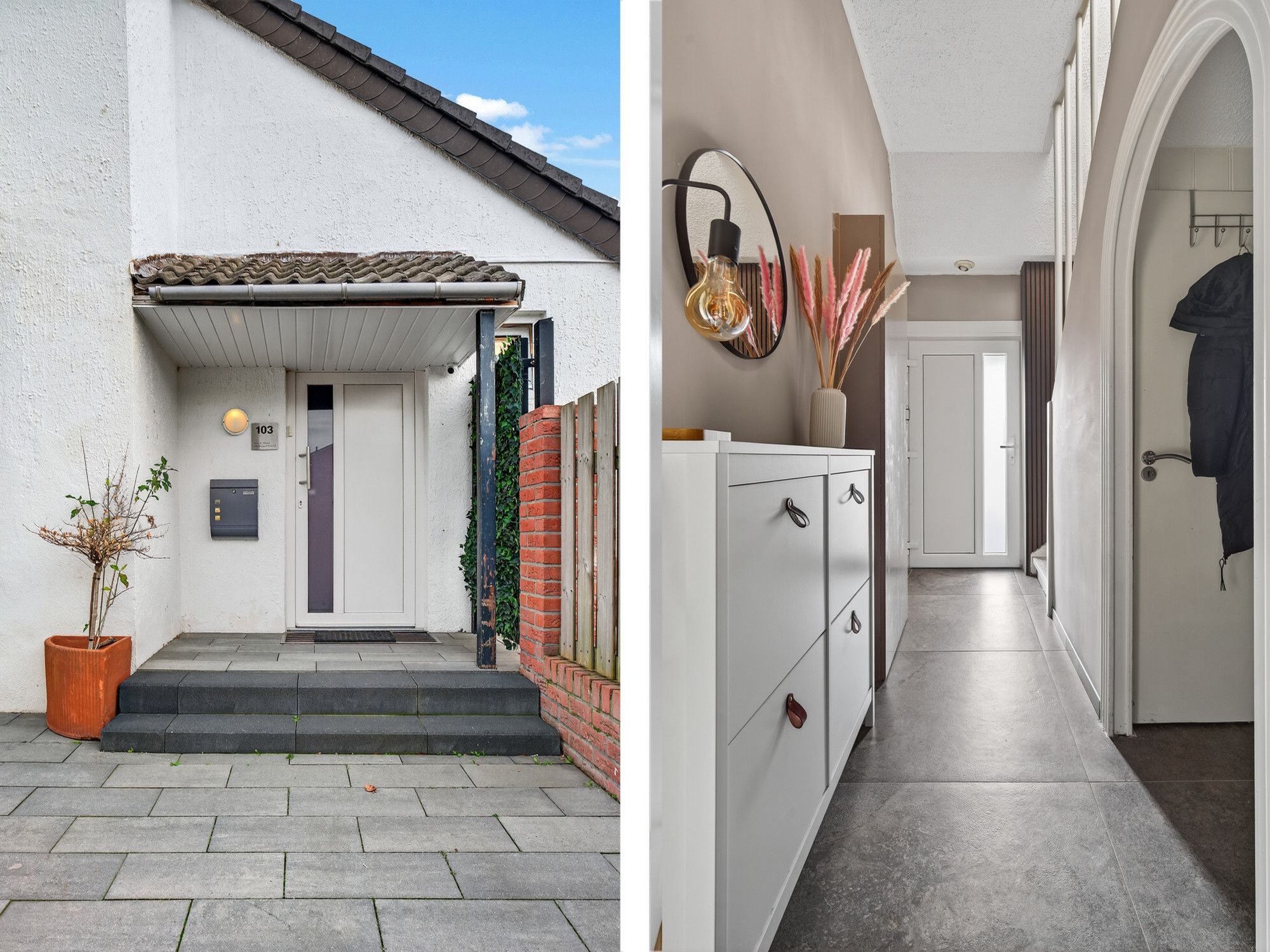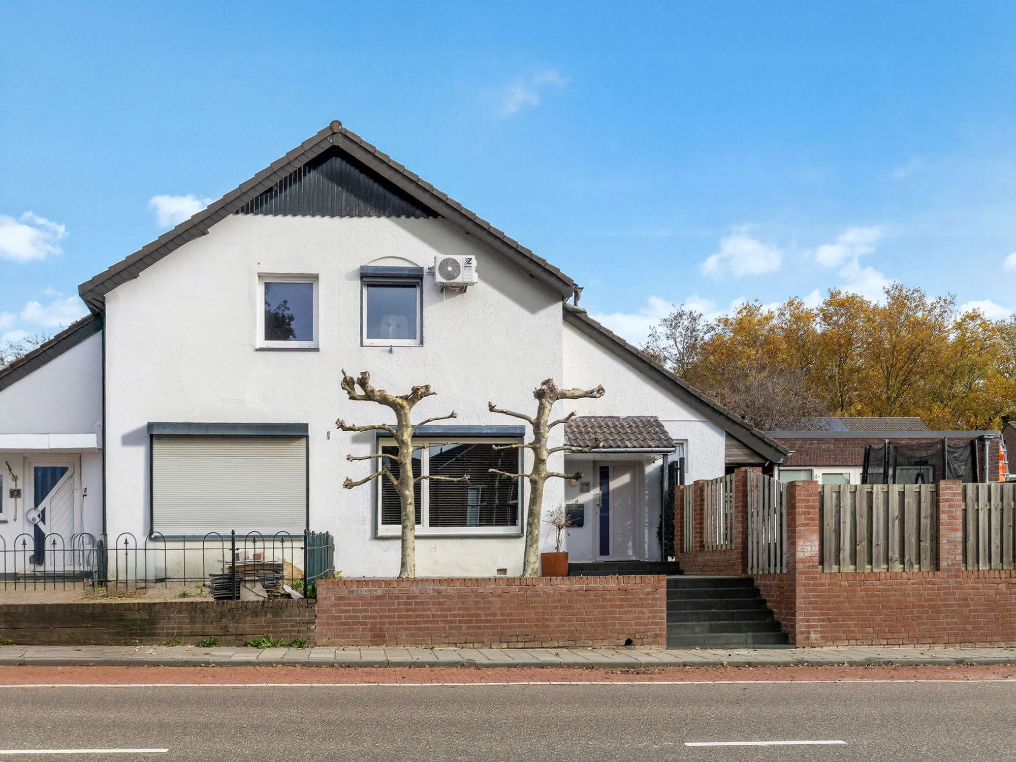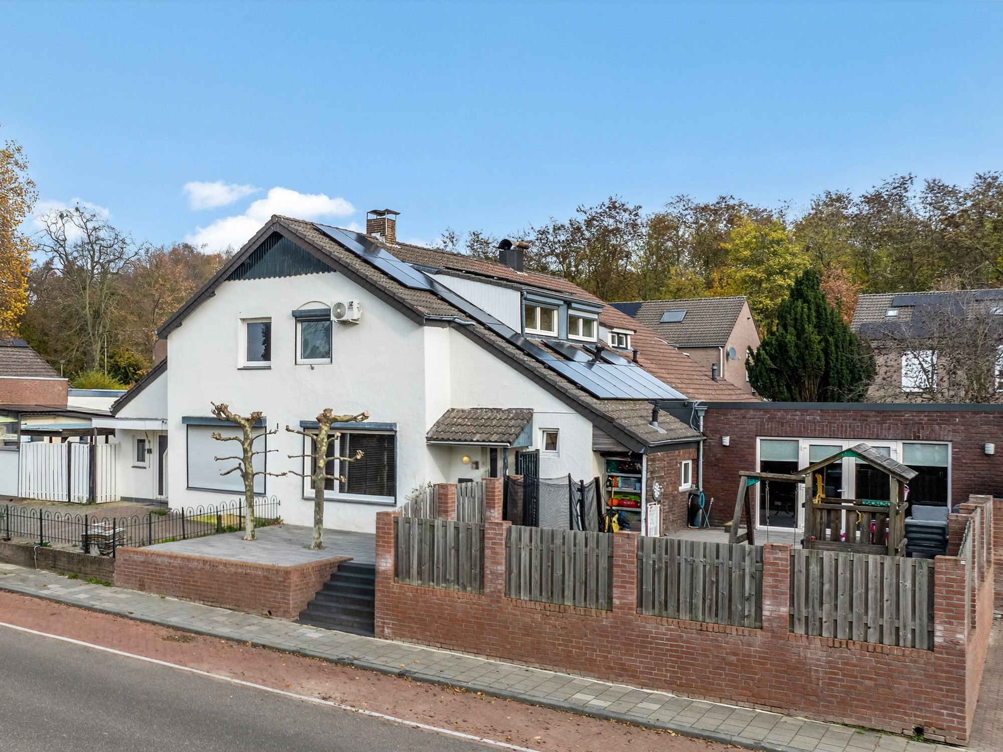 Via enkele traptreden bereik je de voordeur met kleine overkapping. Ook is er een zijpoort naar de tuin en oprit met garage.