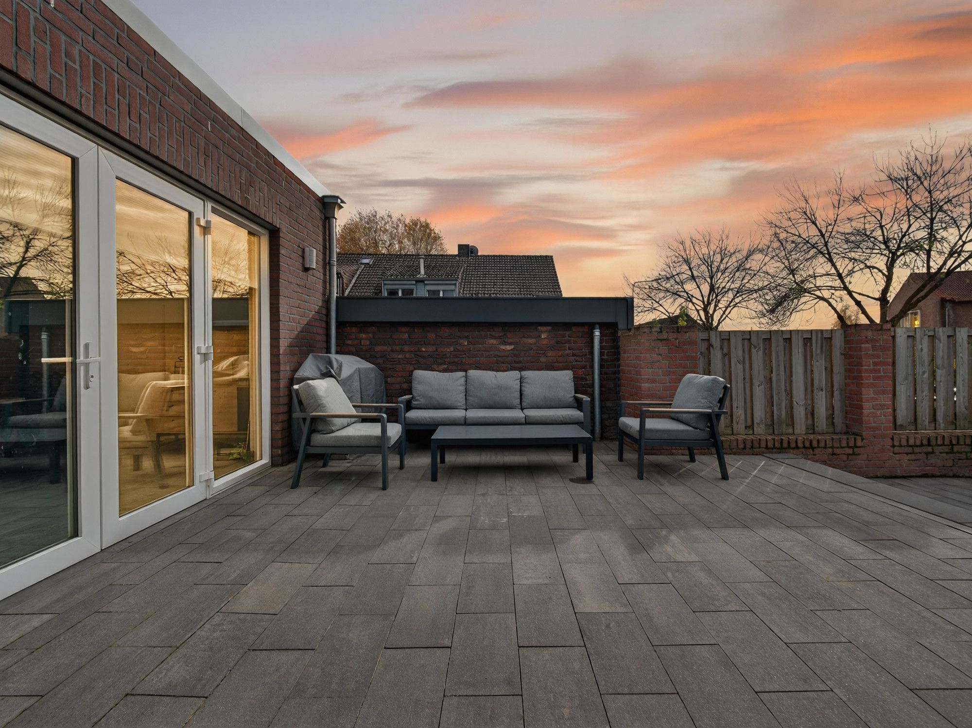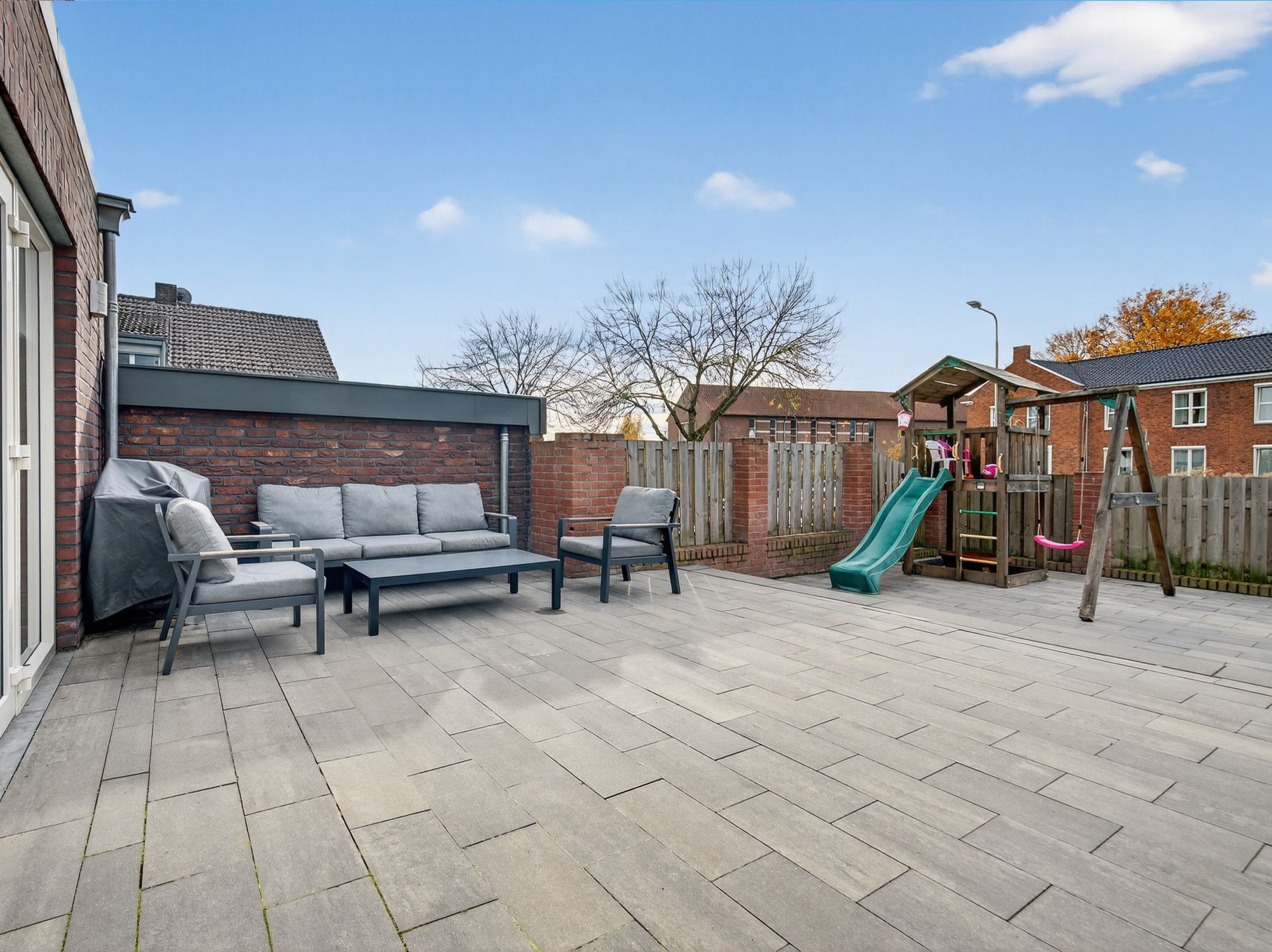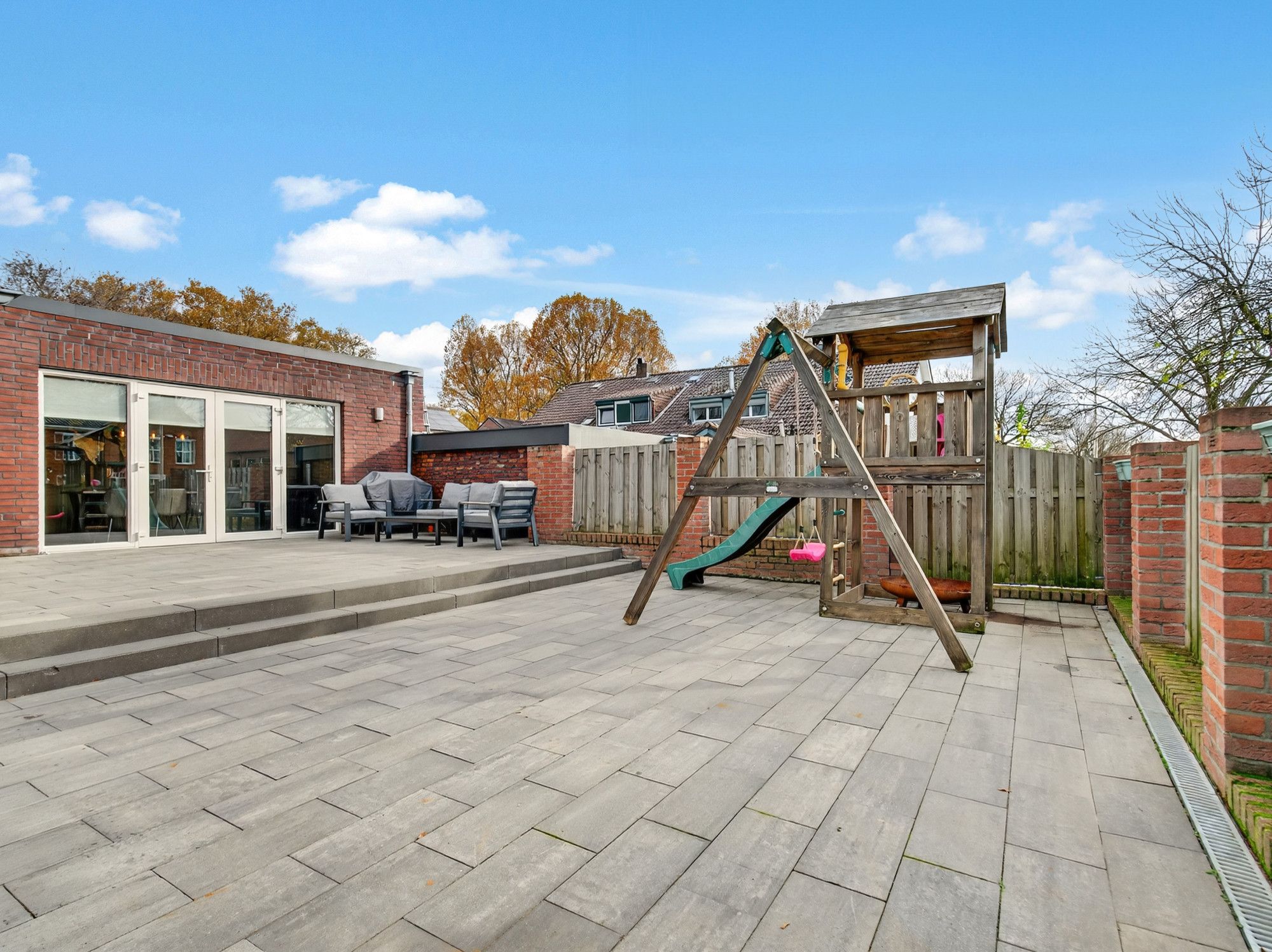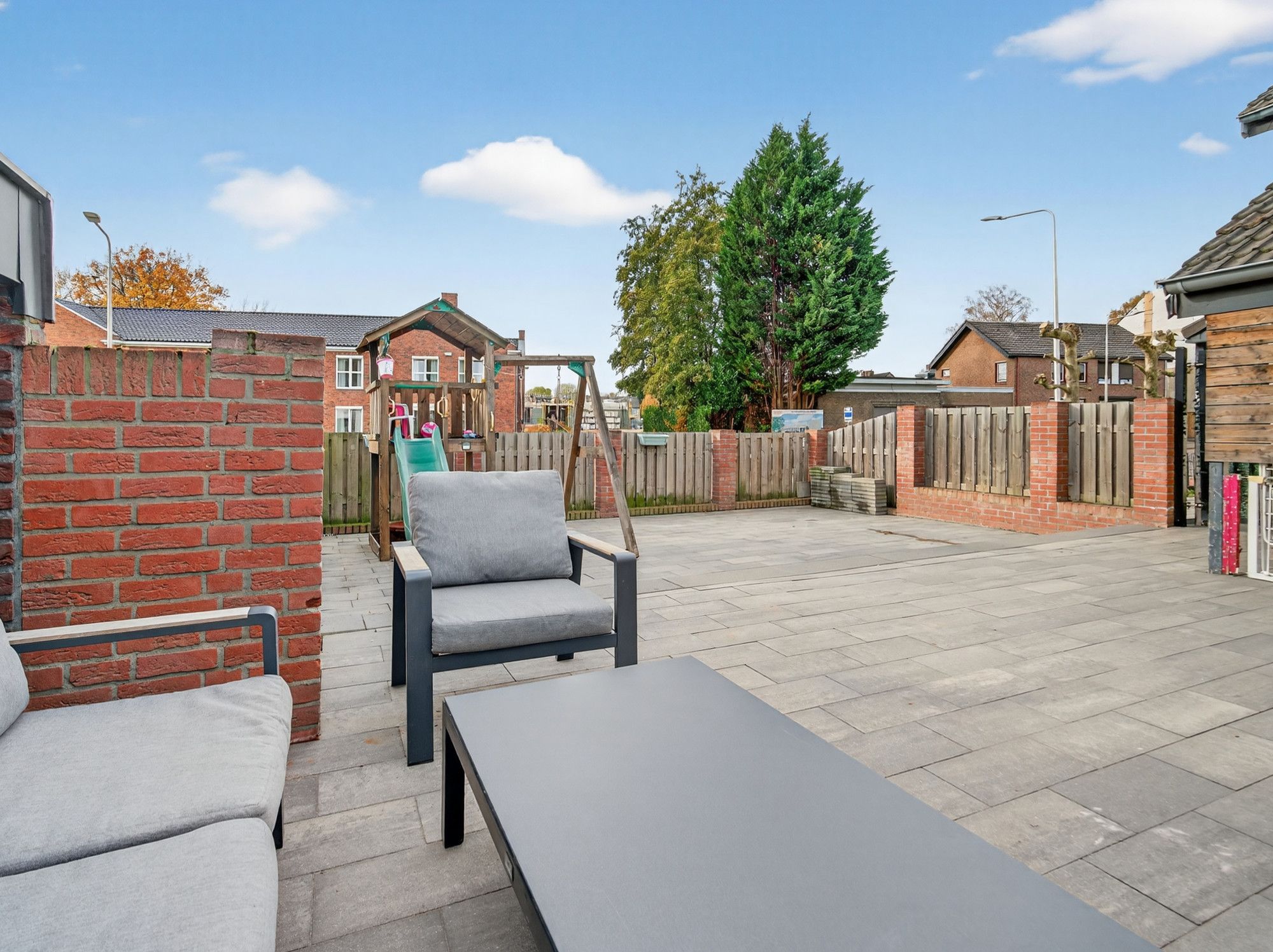 De tuin is onderhoudsvriendelijk ingericht met een betegeld terras en zithoek, volledig omsloten door een houten schutting. Via de zijkant is de tuin bereikbaar via een poort.