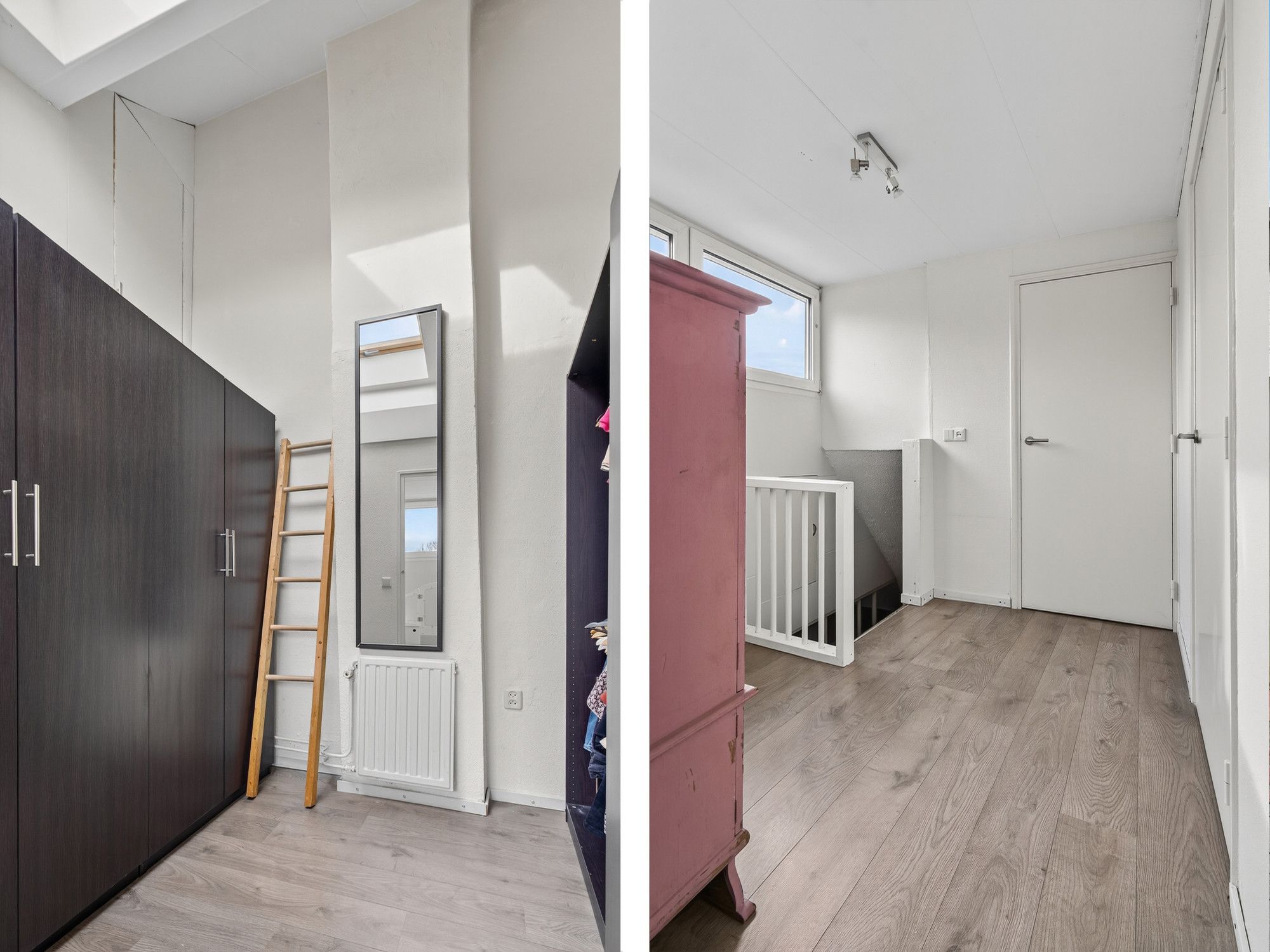 De eerste verdieping is afgewerkt met laminaat en beschikt over rolluiken. De overloop geeft toegang tot twee slaapkamers en een garderobekamer. De slaapkamer aan de voorzijde heeft airconditioning. De garderobekamer beschikt over een dakraam en bergruimte. Daarnaast zijn bij de trap nog extra bergkastjes aanwezig.