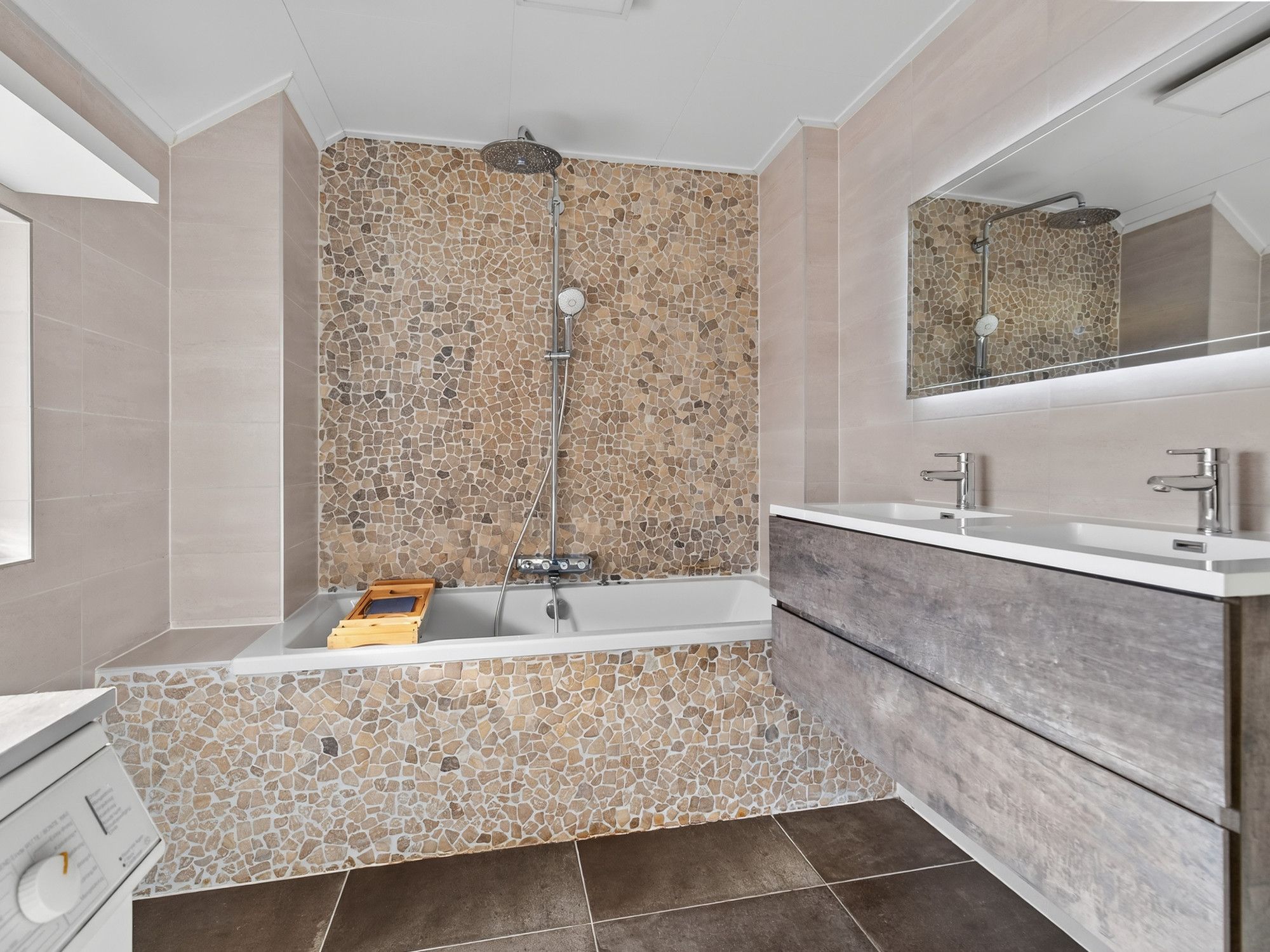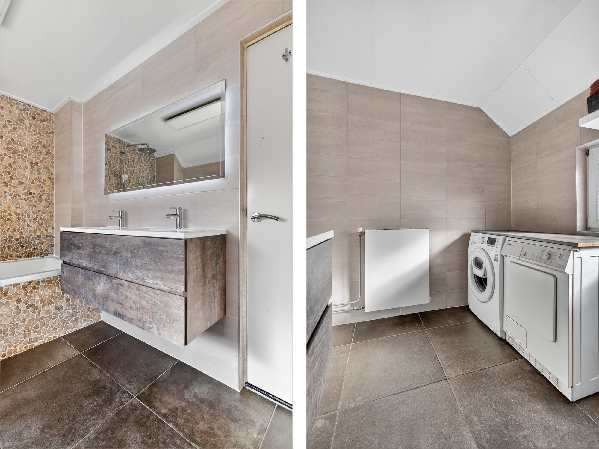 De hal is betegeld en voorzien van een meterkast, garderobe, aparte toiletruimte met sensorverlichting, toegang tot de badkamer, woonkamer, kelder en de trap naar de eerste verdieping. De badkamer is modern uitgevoerd met twee wastafels en een meubel, witgoedaansluiting, een ligbad met bubbelbadfunctie, douchekop en spiegel met verlichting.