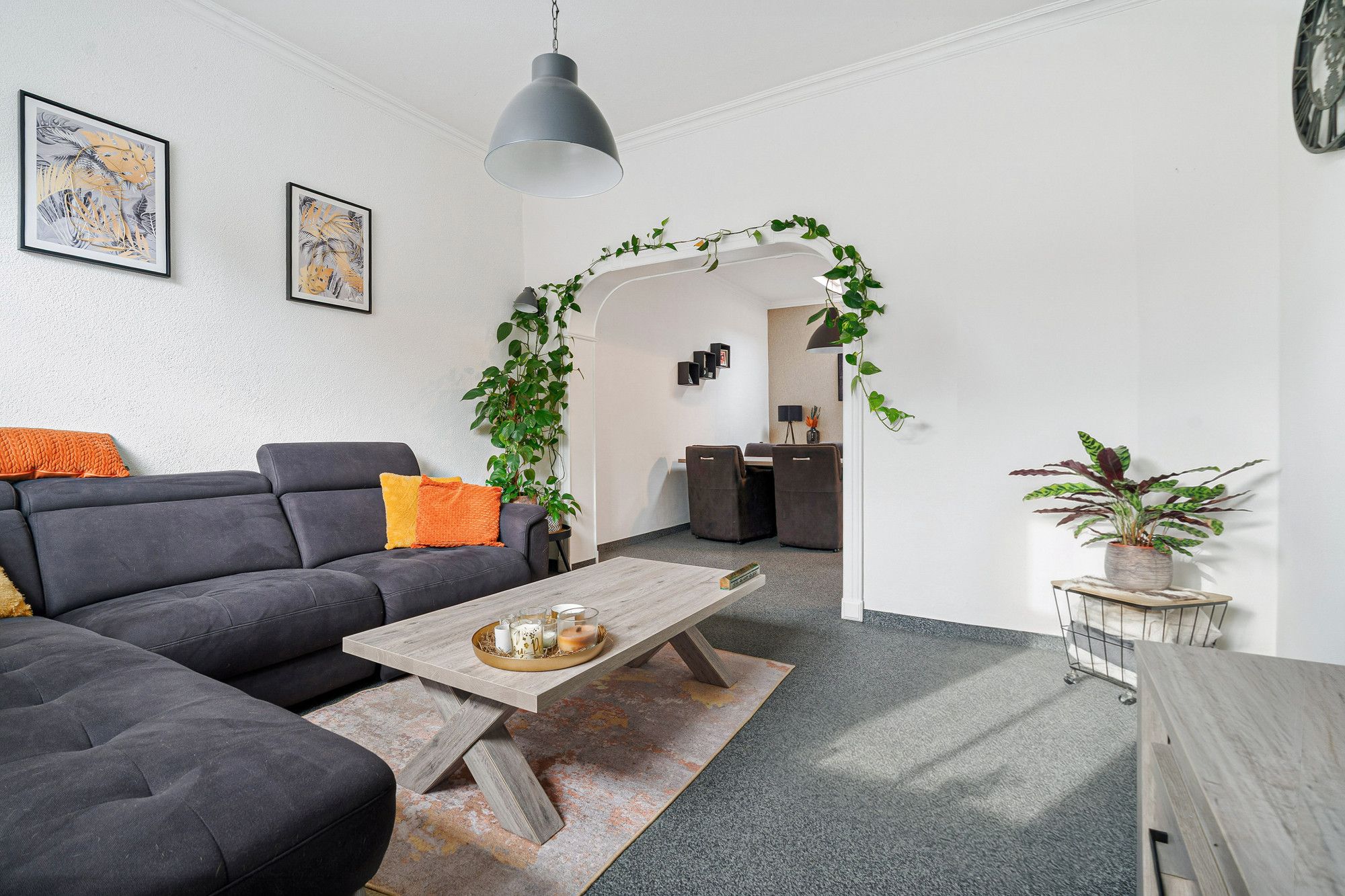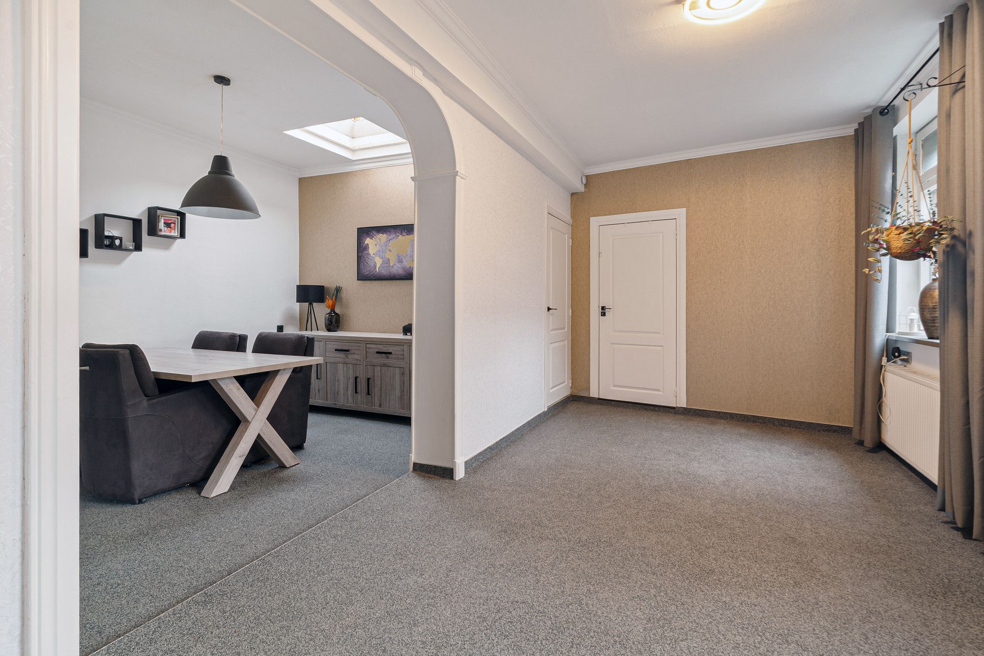 De woonkamer staat in open verbinding met de eetkamer, wat zorgt voor een fijne, lichte leefruimte met een prettige indeling. De grote boog tussen eetkamer en aanbouw geeft karakter en extra ruimtelijkheid.