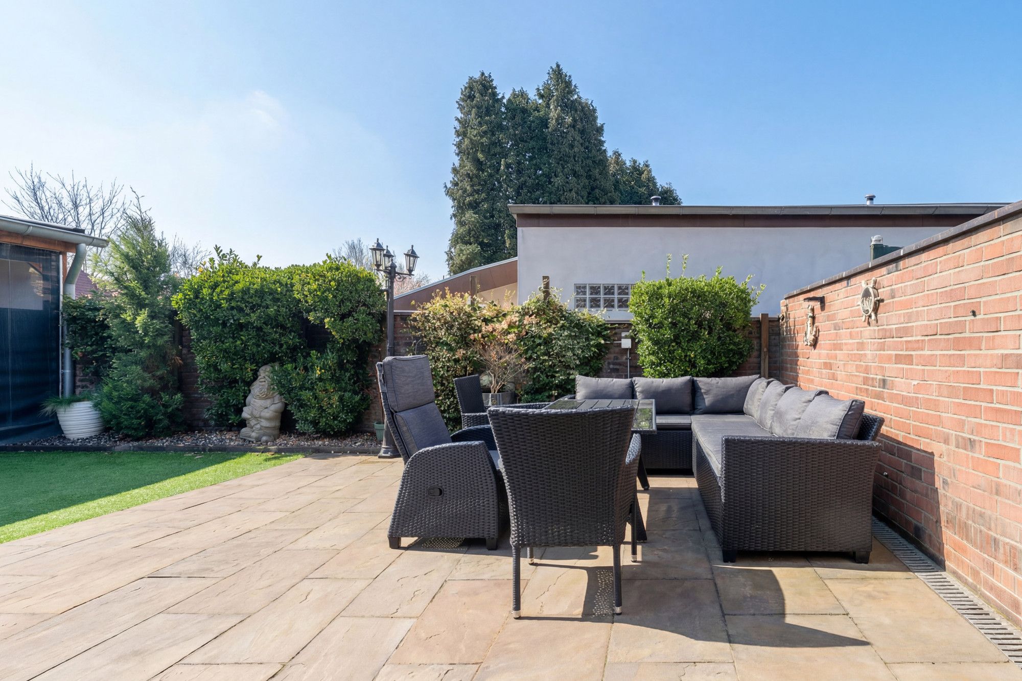 Via de zij-ingang bereikt u de beklinkerde achtertuin, gelegen op het oosten. De tuin is verdeeld over twee niveaus en onderhoudsvriendelijk aangelegd met kunstgras.