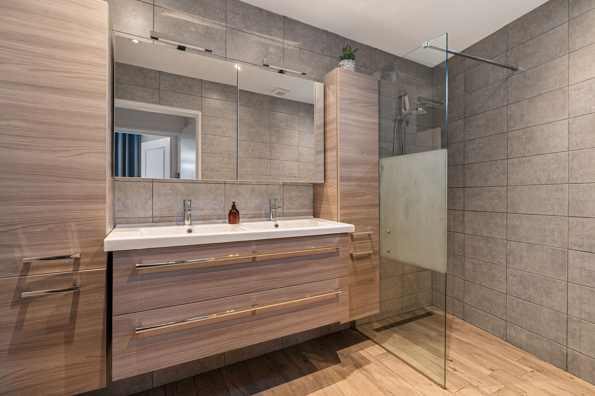 • Een badkamer met dubbele wastafel en inloopdouche.