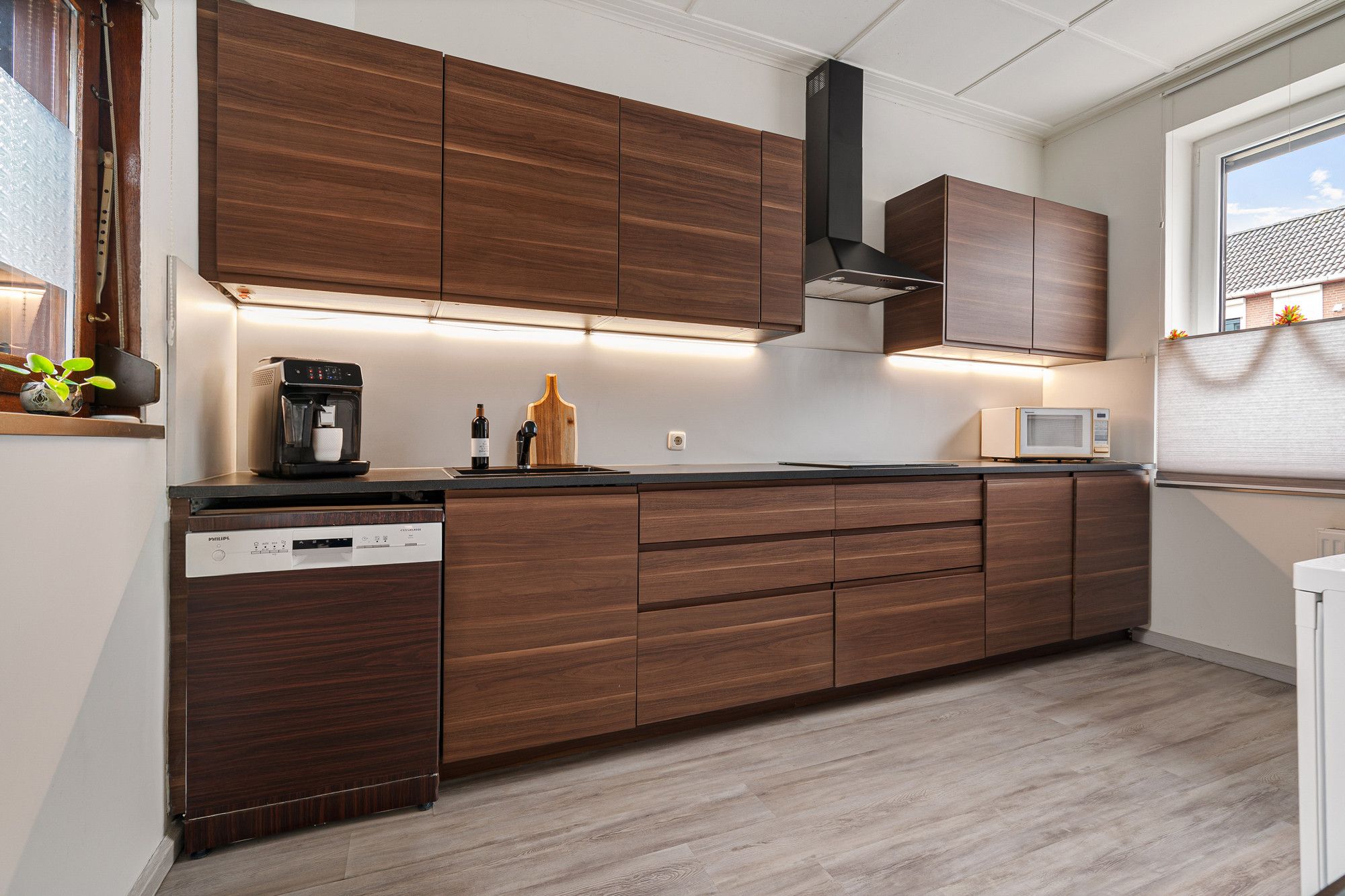 De gesloten keuken is voorzien van diverse inbouwapparatuur, waaronder een vaatwasser, inductiekookplaat, afzuigkap en spoelbak – ideaal voor kookliefhebbers.