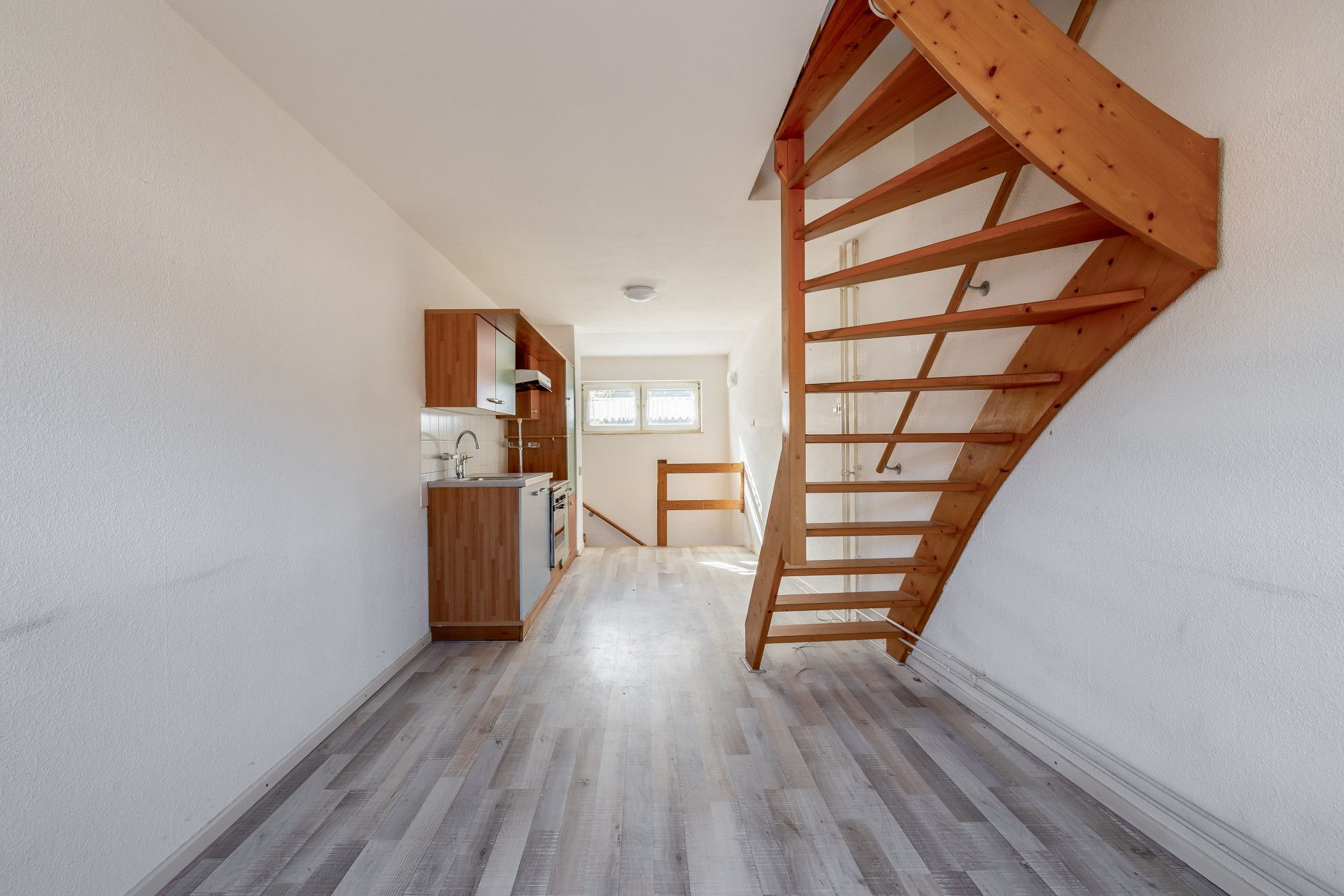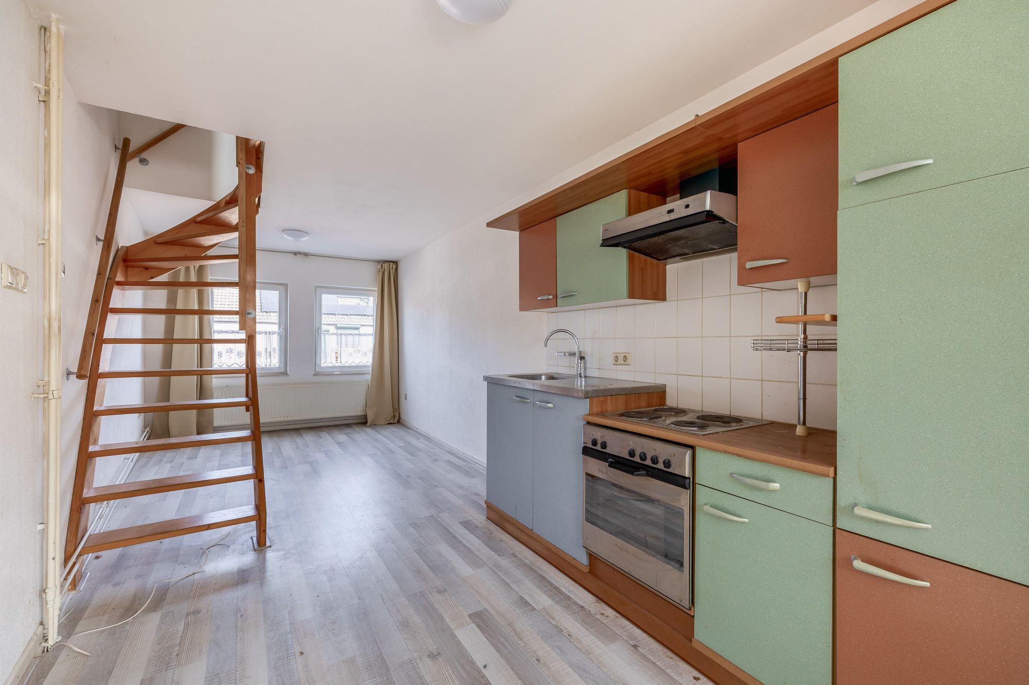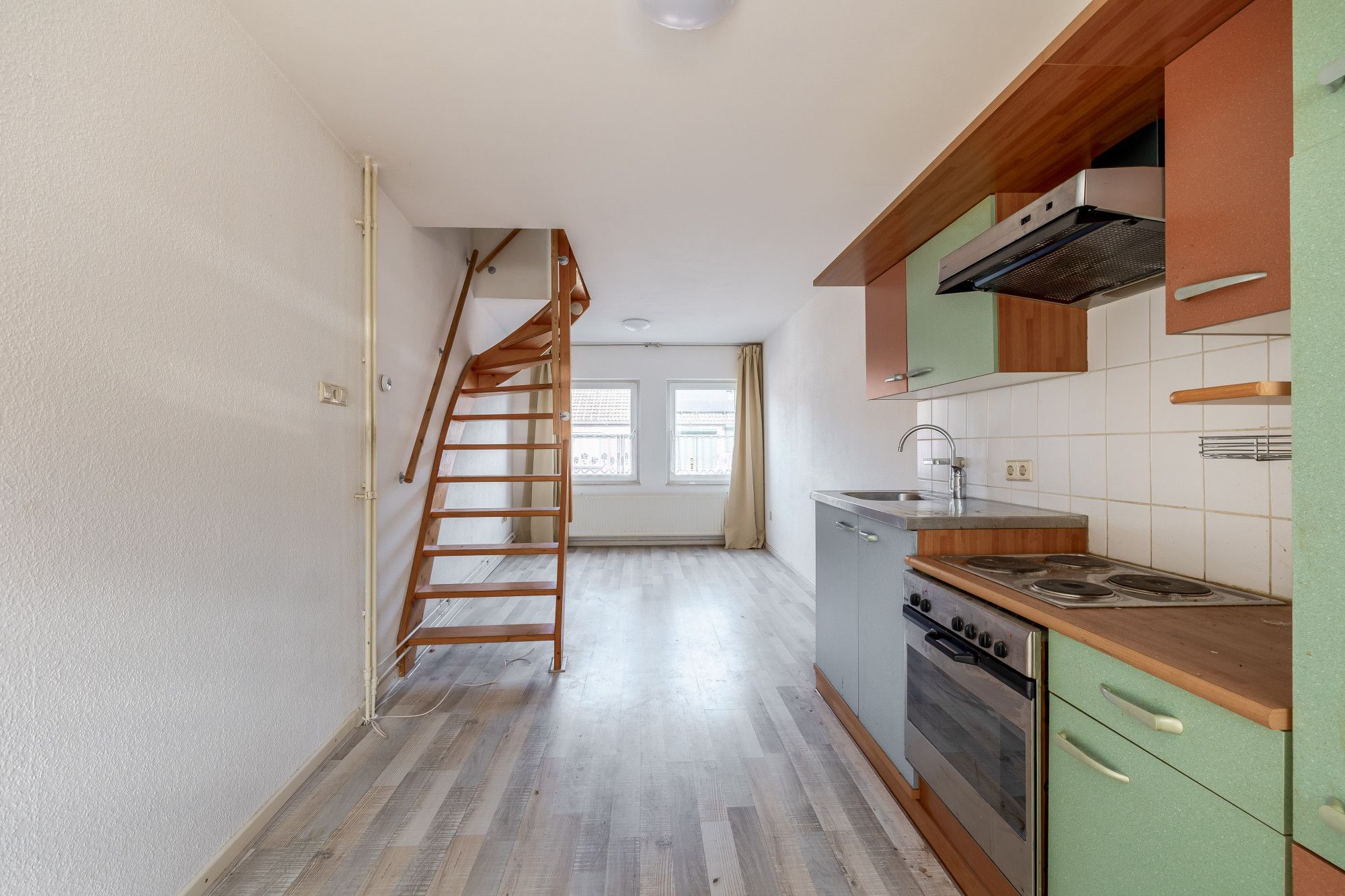 Op de eerste verdieping bevindt zich de woonkamer met een open, eenvoudig uitgevoerde keuken. De ruimte is praktisch ingericht en biedt diverse indelingsmogelijkheden. Vanuit de woonkamer bereikt u middels een vaste trap de tweede verdieping.
