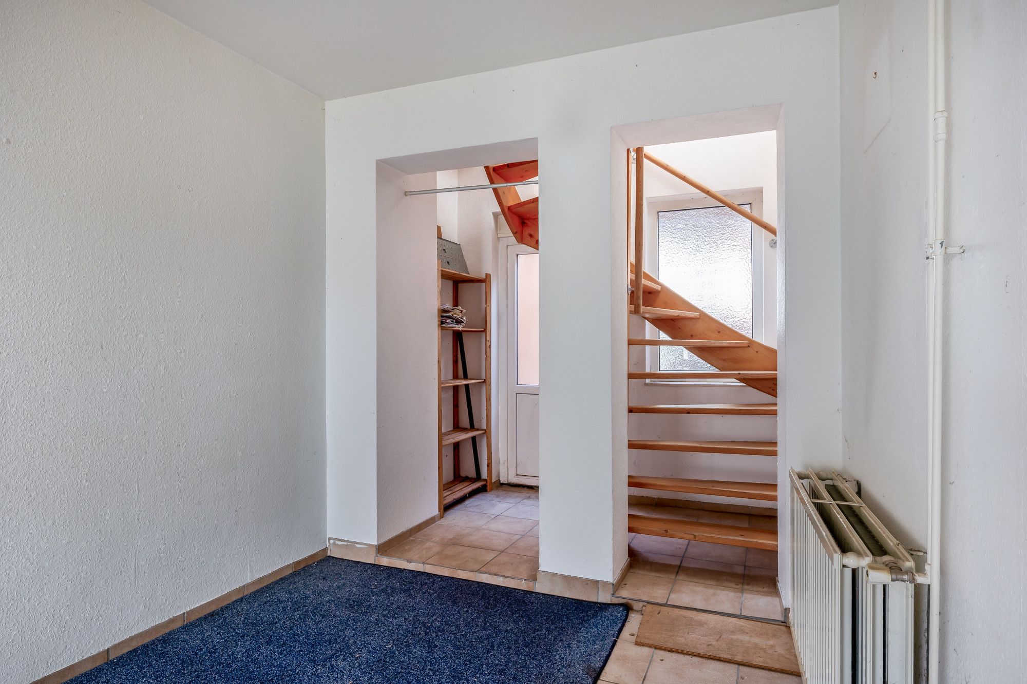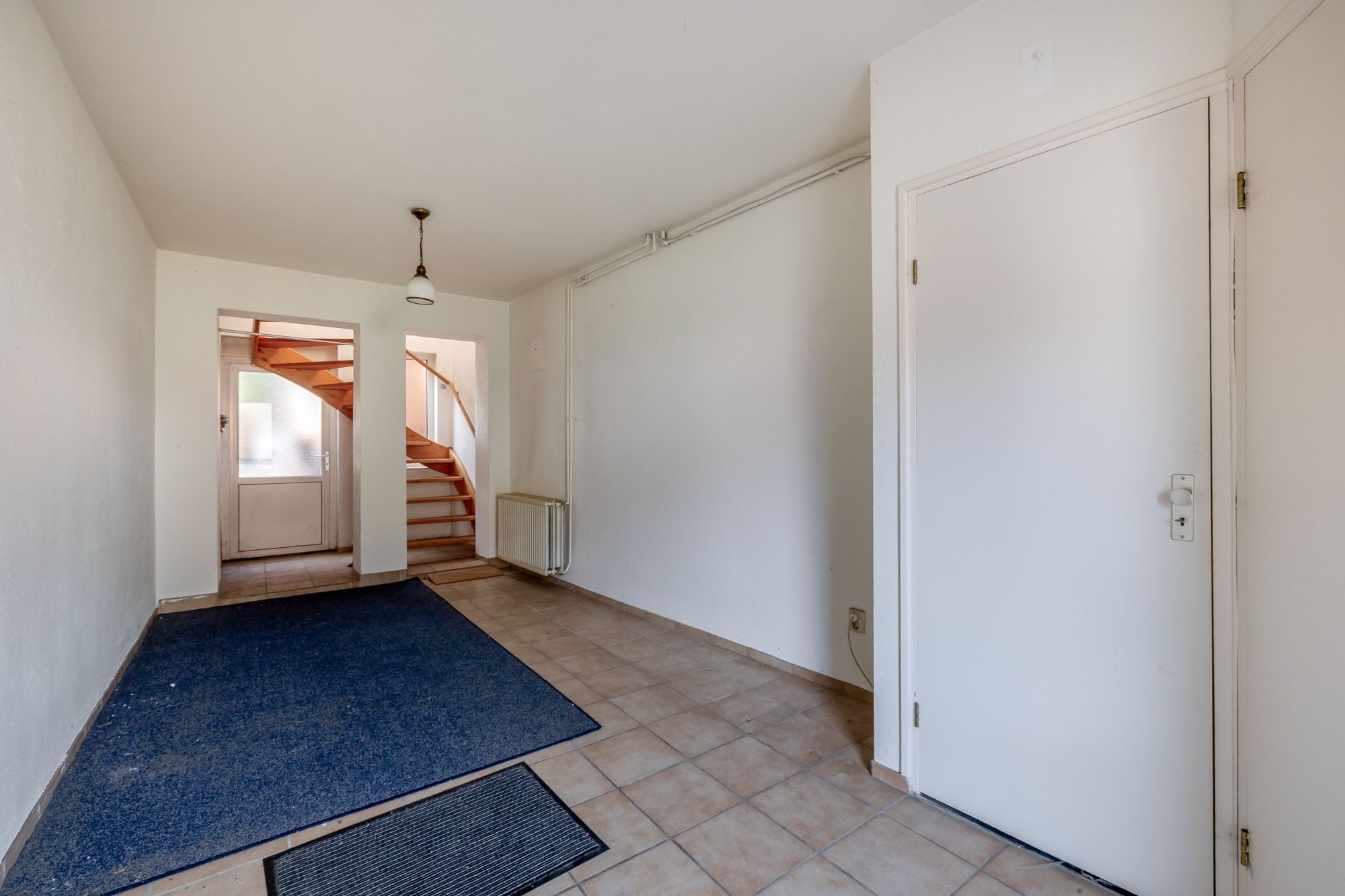 Via de overdekte entree bereikt u de royale, volledig betegelde hal met meterkast en toegang tot de deels betegelde toiletruimte met staand toilet en fonteintje. Vanuit de hal leidt de trap naar de eerste verdieping.