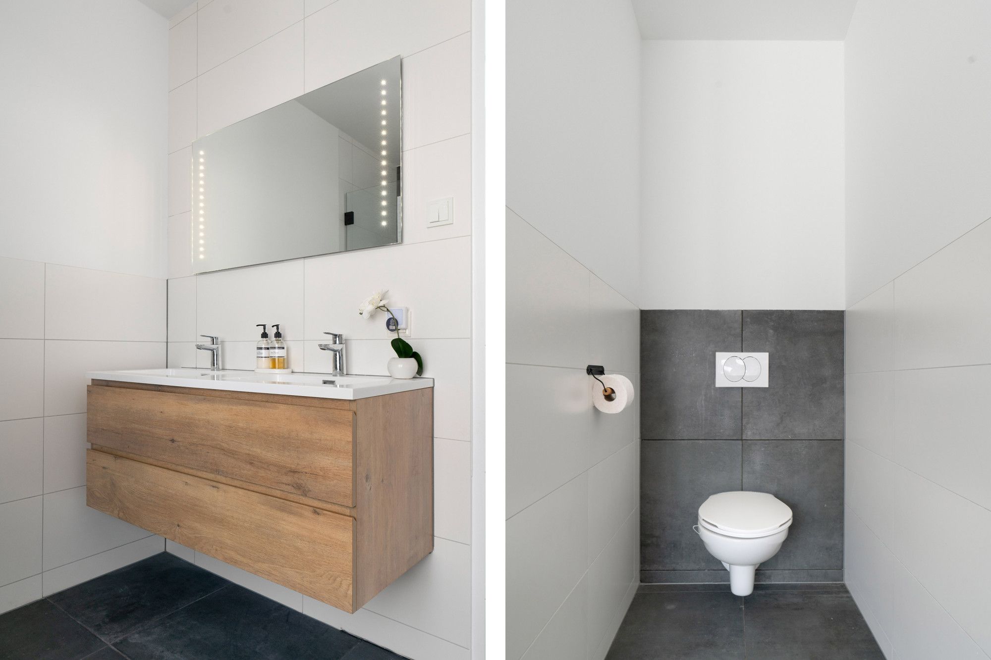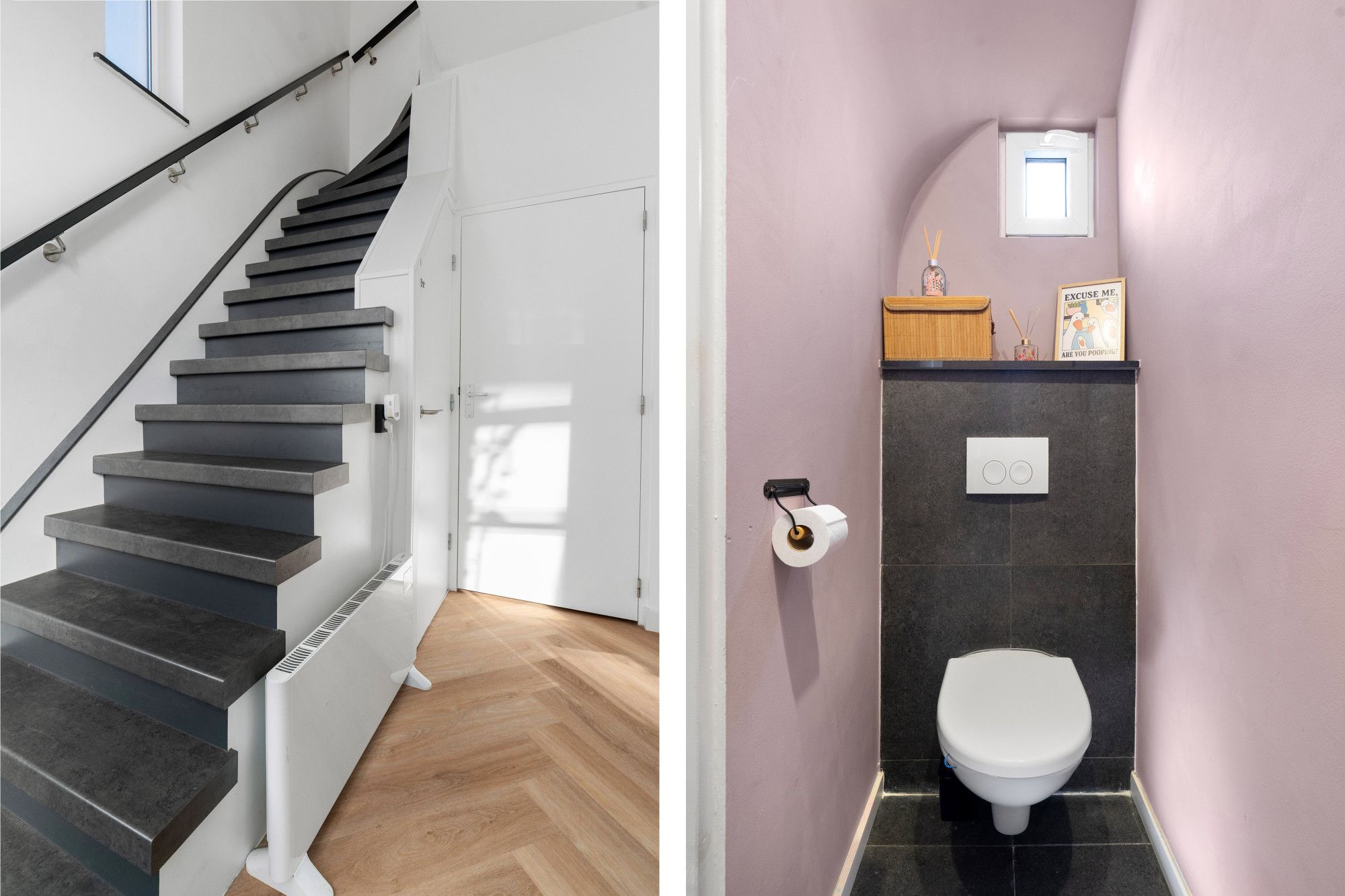 Via de entree kom je in een ruime hal met toegang tot de kelder en de eerste verdieping. Het moderne toilet is voorzien van een hangcloset en fonteintje.