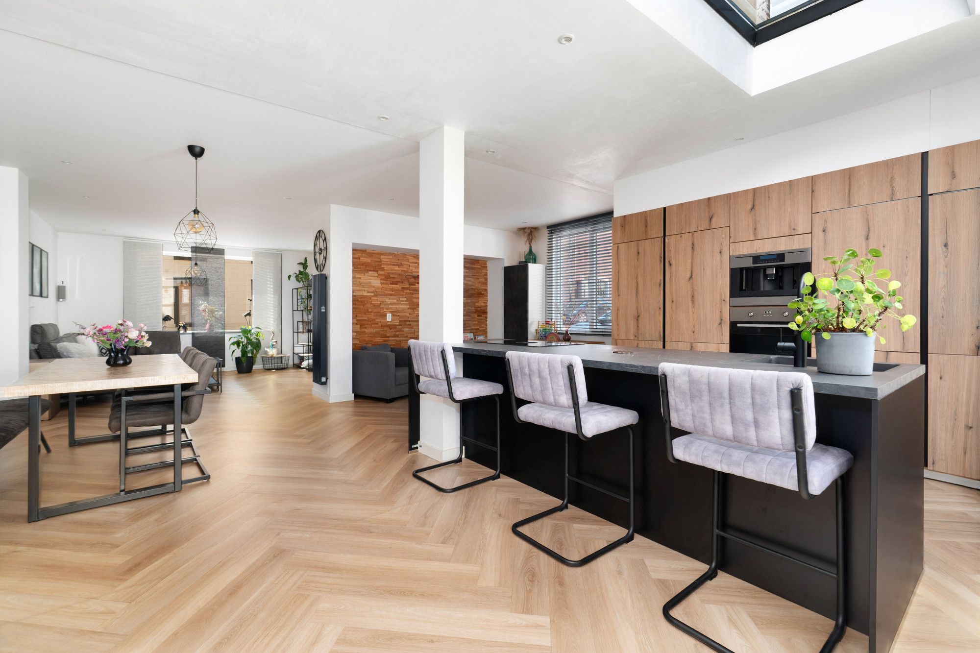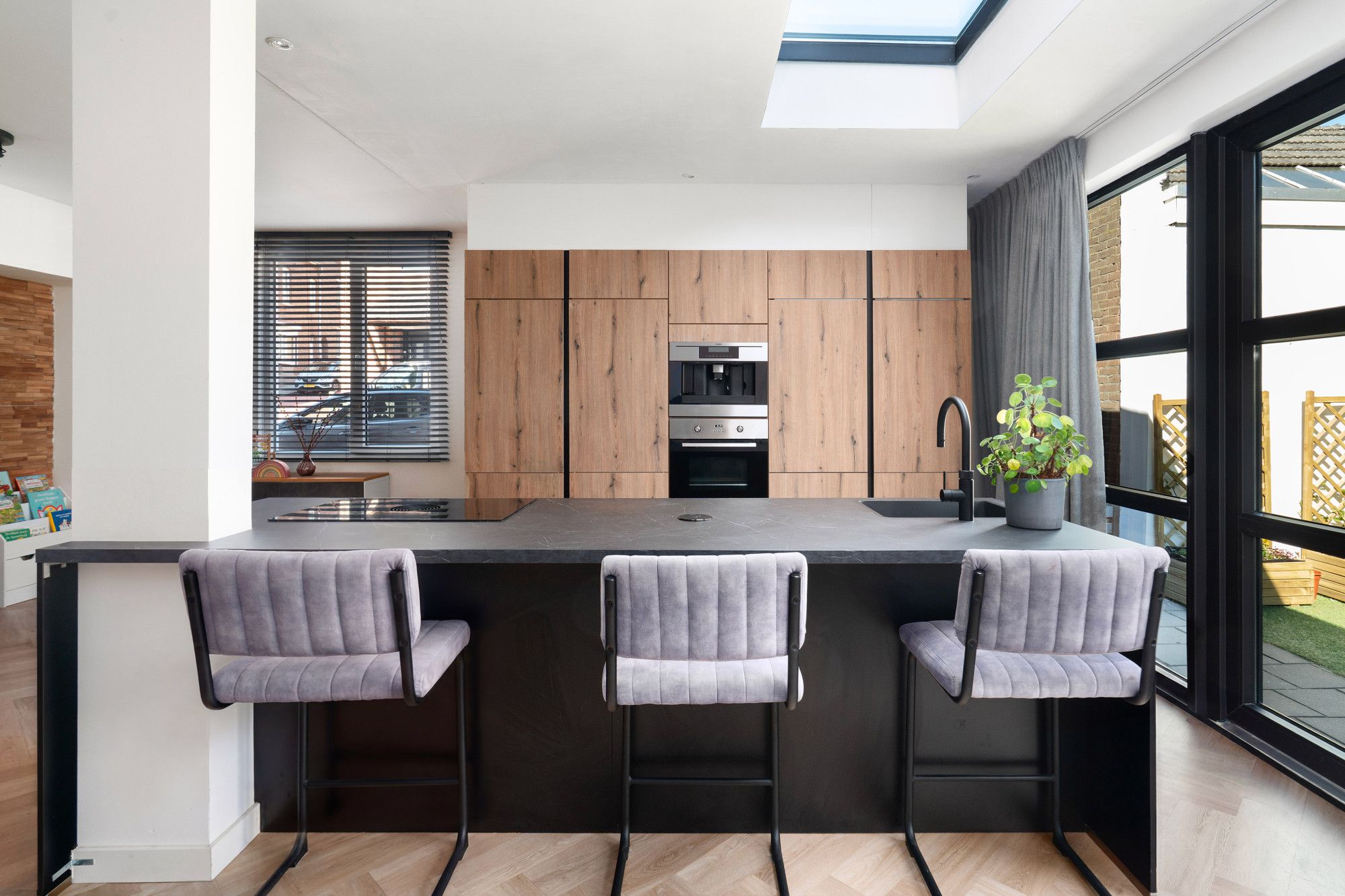 De royale woonkamer met eetgedeelte staat in directe verbinding met de moderne open keuken. De keuken is uitgevoerd met een kookeiland en bar en vormt het hart van de woning – perfect voor gezellige momenten met familie en vrienden.