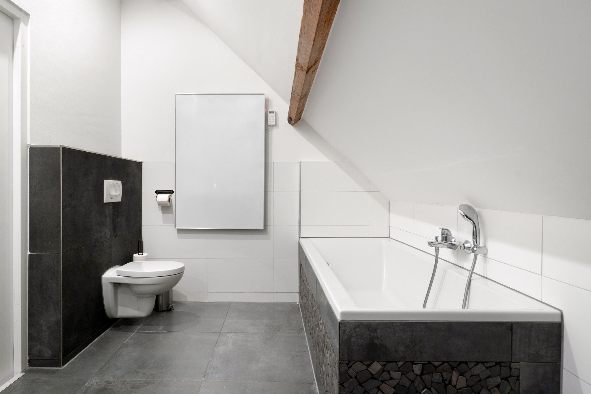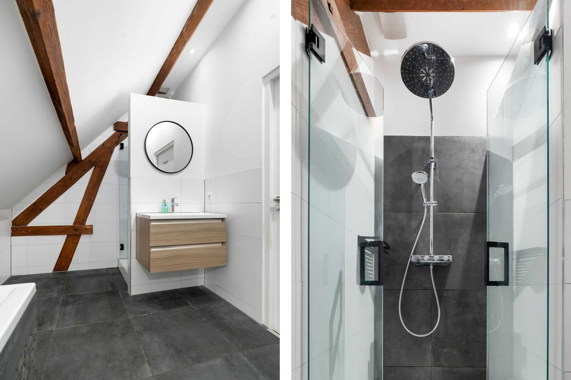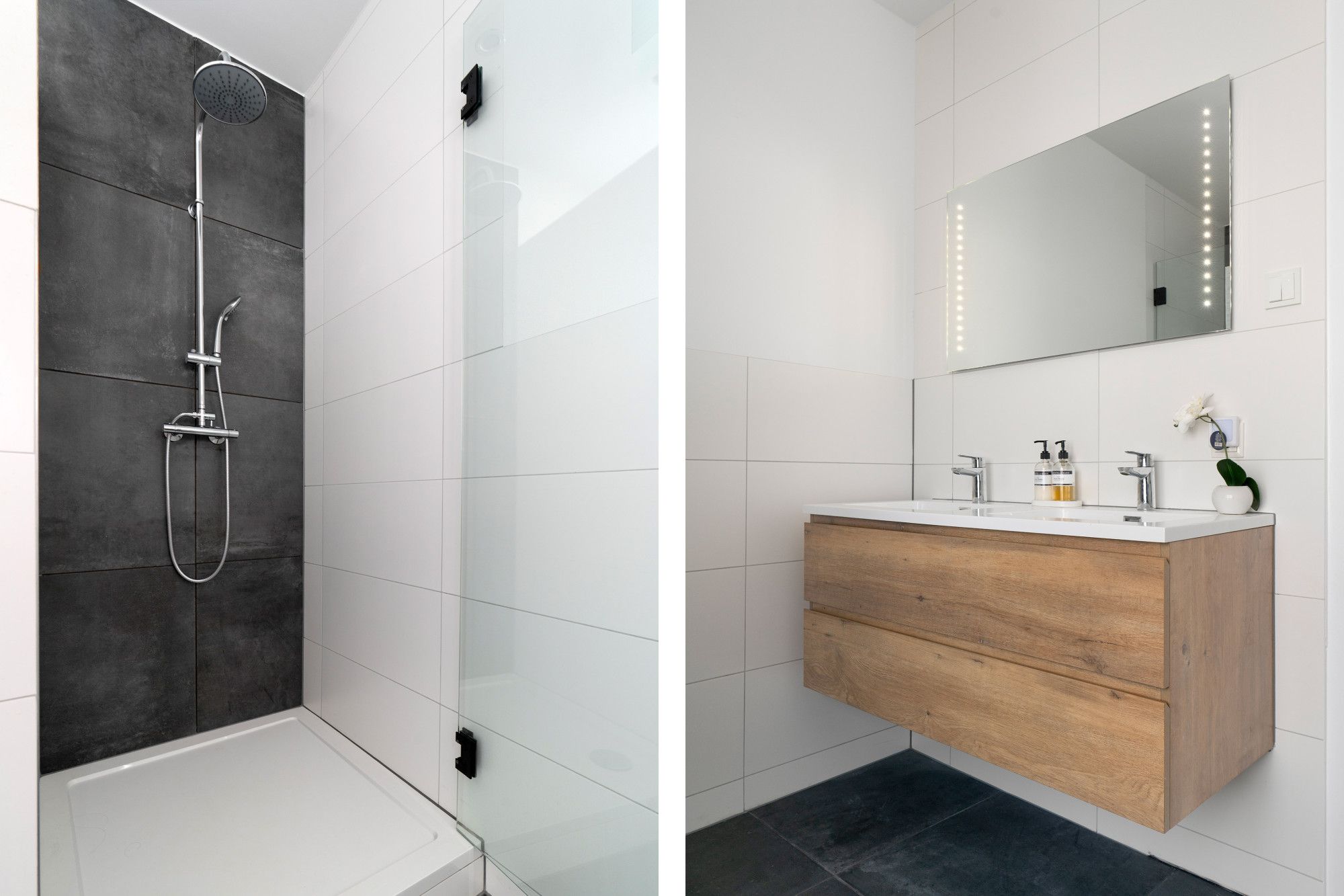 De moderne, volledig betegelde badkamer is compleet uitgerust met een ligbad, separate douche, hangcloset en een dubbele wastafel.