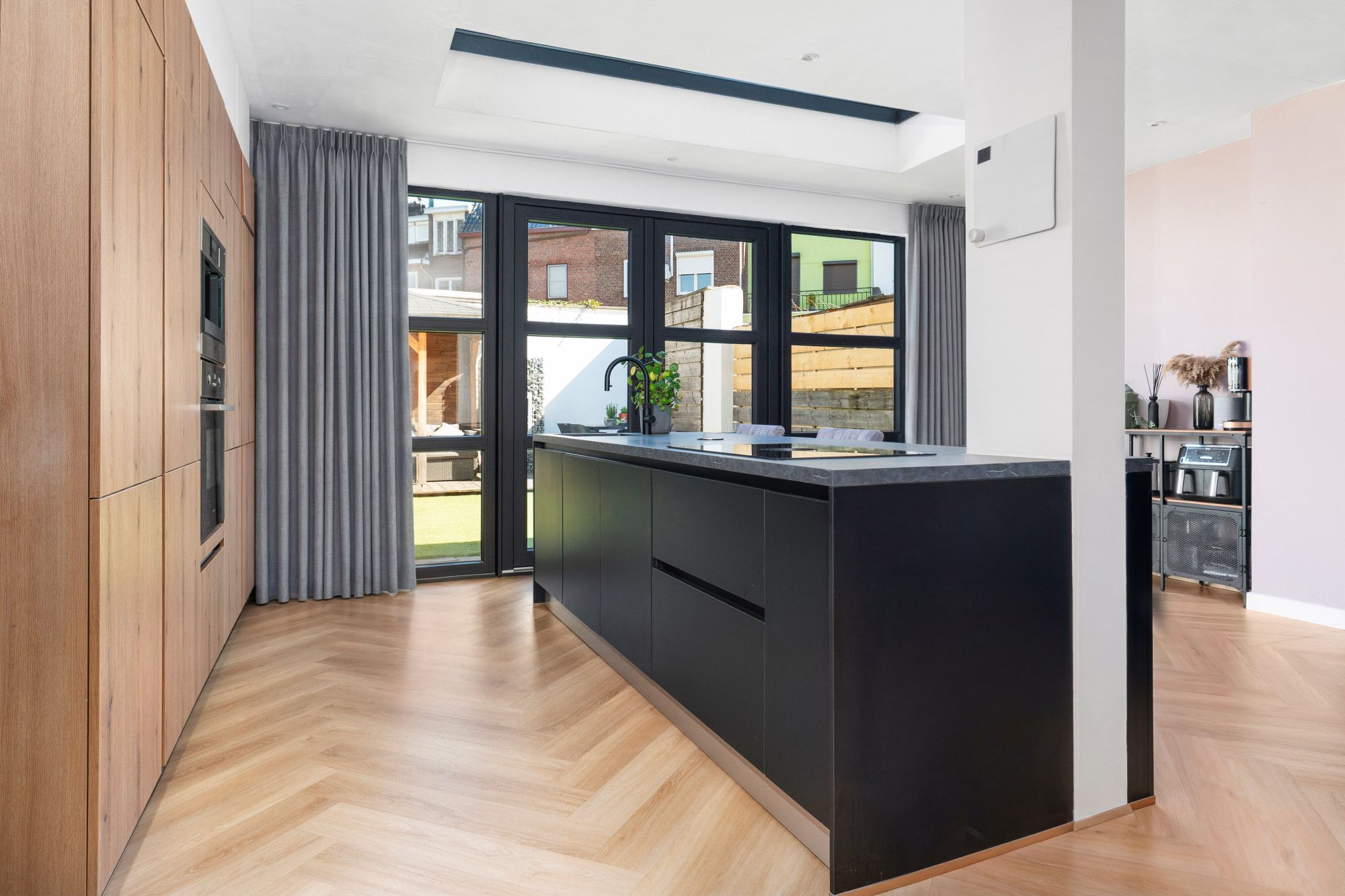 De keuken beschikt over diverse inbouwapparatuur, waaronder een magnetron, oven, inductiekookplaat, Quooker, vaatwasser, dubbele ingebouwde koelkast met vriezer en een spoelbak. Via de openslaande deuren bereik je de achtertuin.