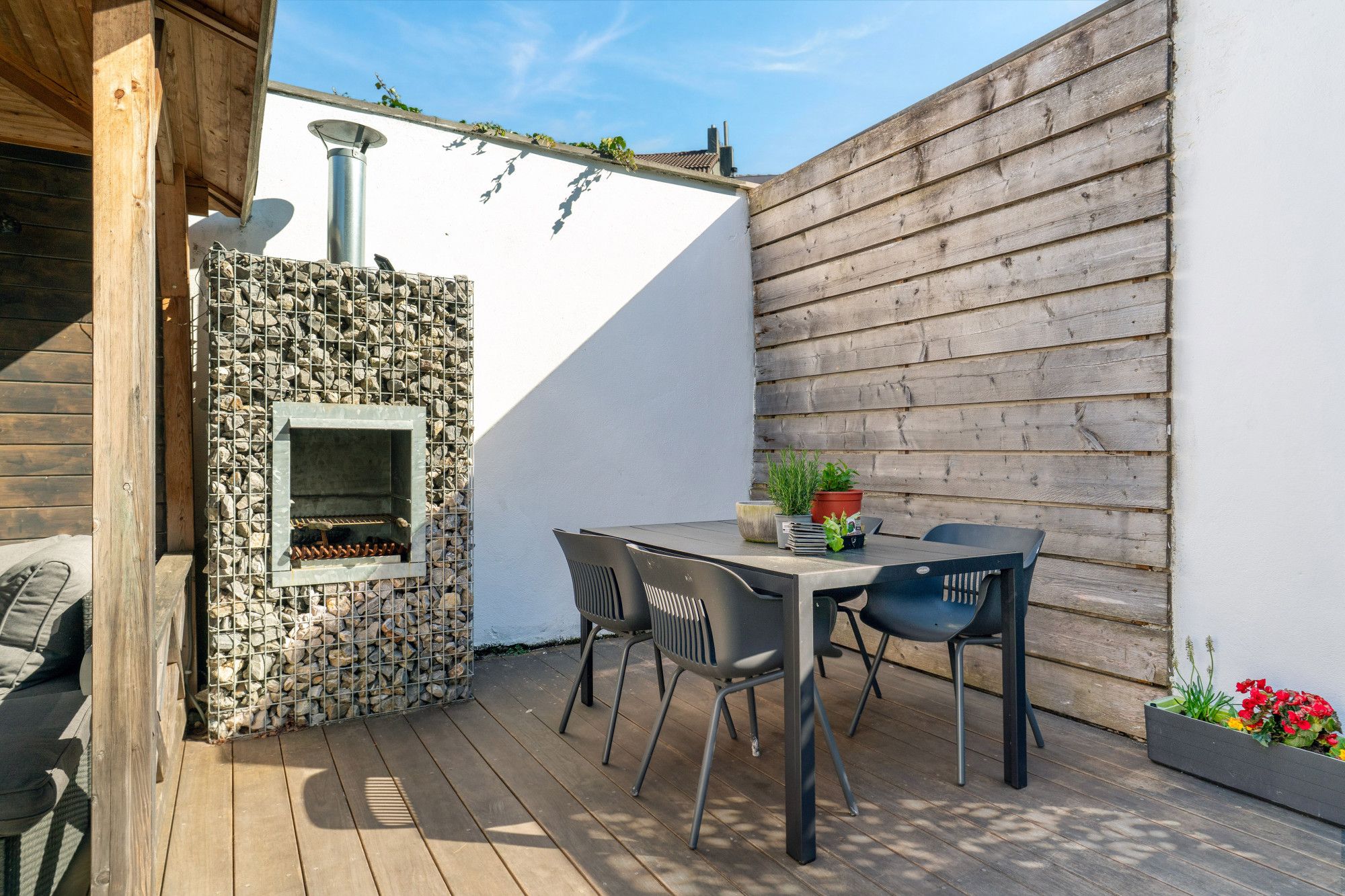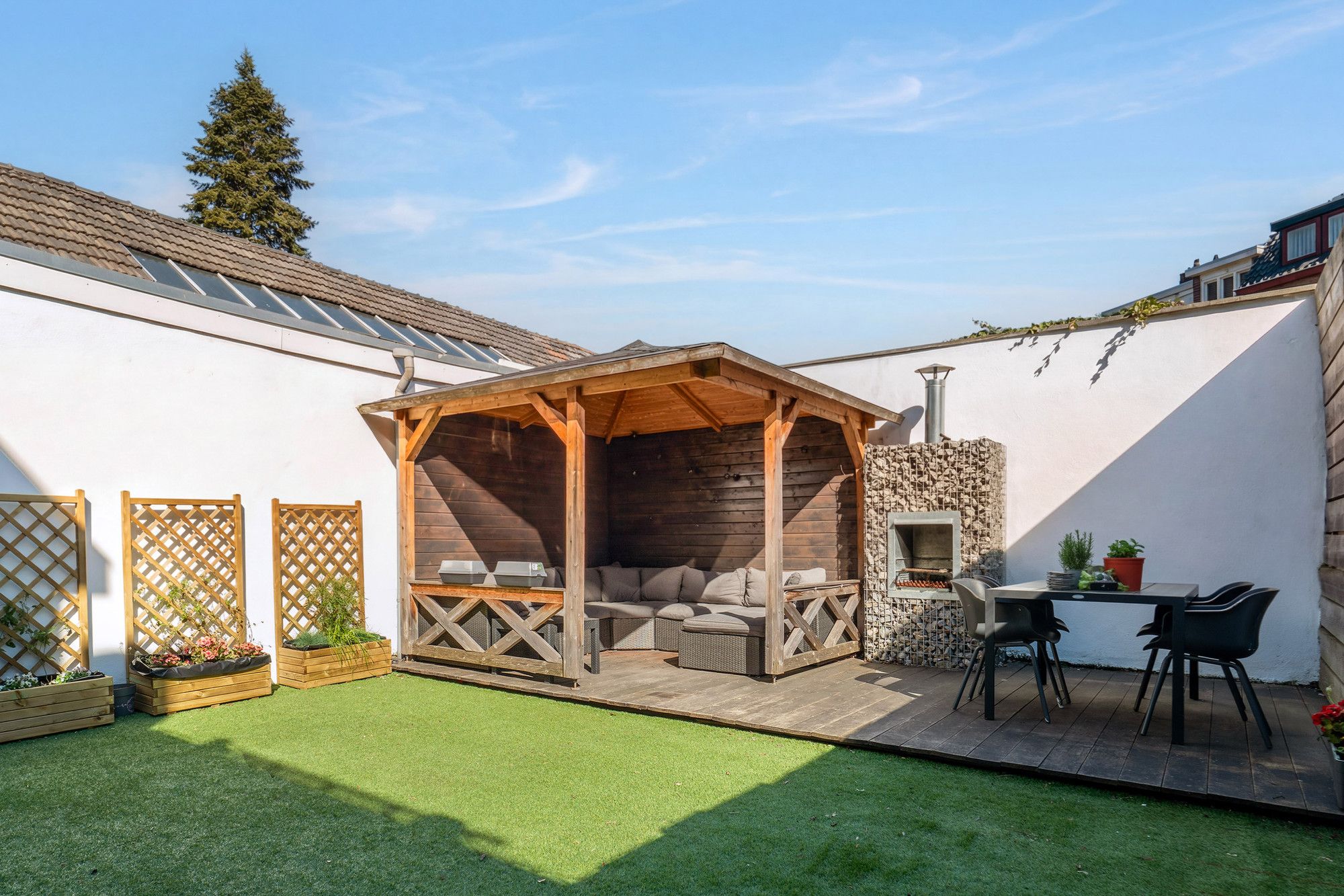 De achtertuin is sfeervol en onderhoudsvriendelijk aangelegd. De combinatie van een houten vlonder, verzorgd kunstgras en een charmant prieeltje met zitgelegenheid zorgt voor een warme en uitnodigende sfeer. Met de aanwezige buitengrill is dit de perfecte plek om te genieten van lange zomeravonden met familie en vrienden.