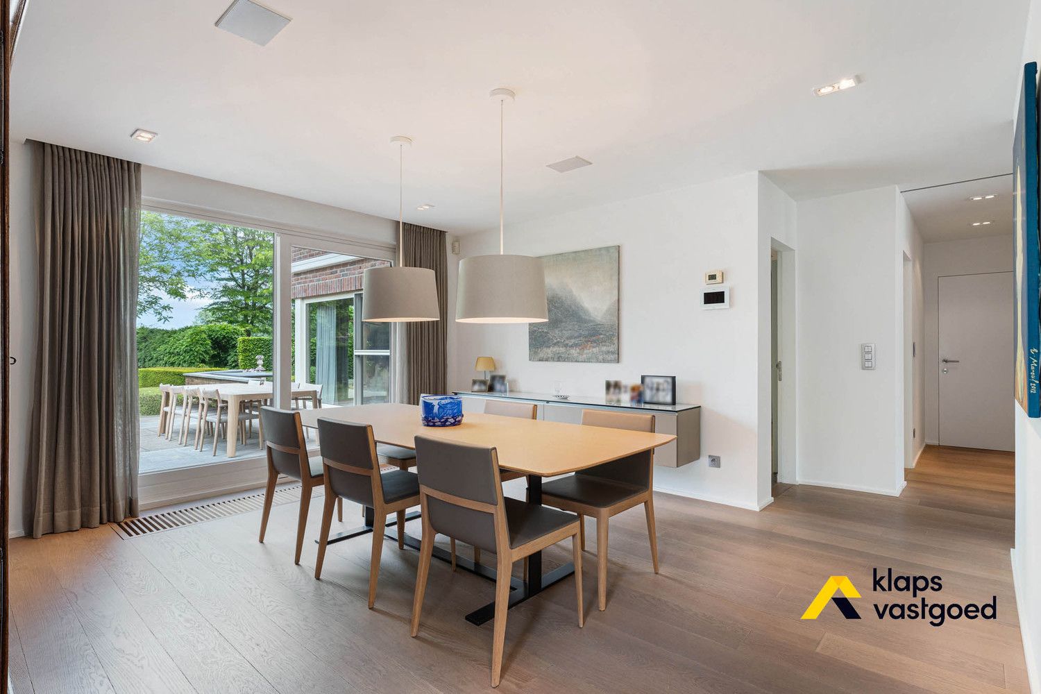 De woning beschikt over grote raampartijen die via schuiframen verbonden zijn met de terrassen en een schitterend uitzicht bieden op de tuin.