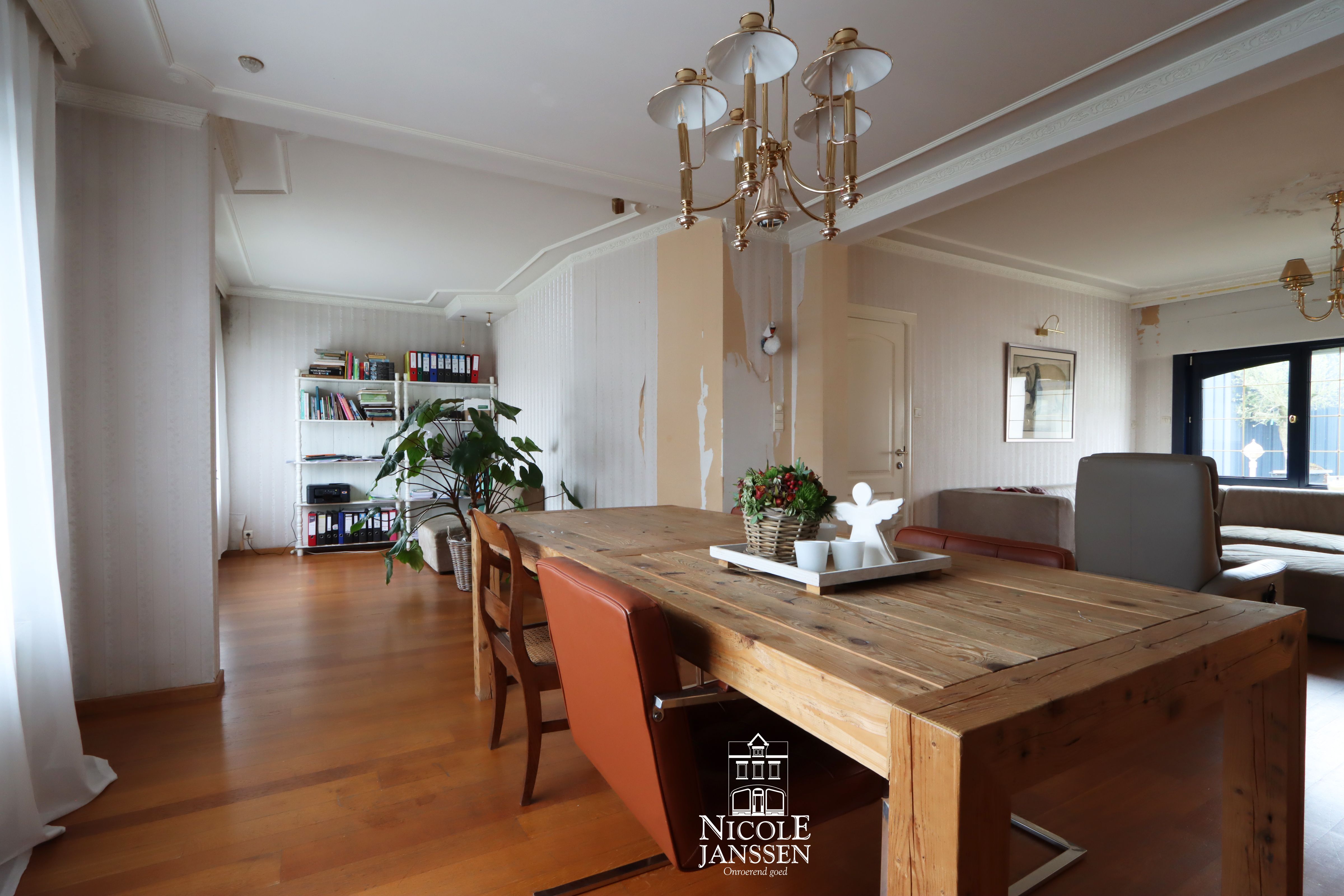 - Gelijkvloers: inkomhal, L-vormige woonkamer, keuken, achterbouw met ruim toilet, berging, grote wasplaats met douche, bureel/hobby/slaapkamer met eigen toegang, badkamer