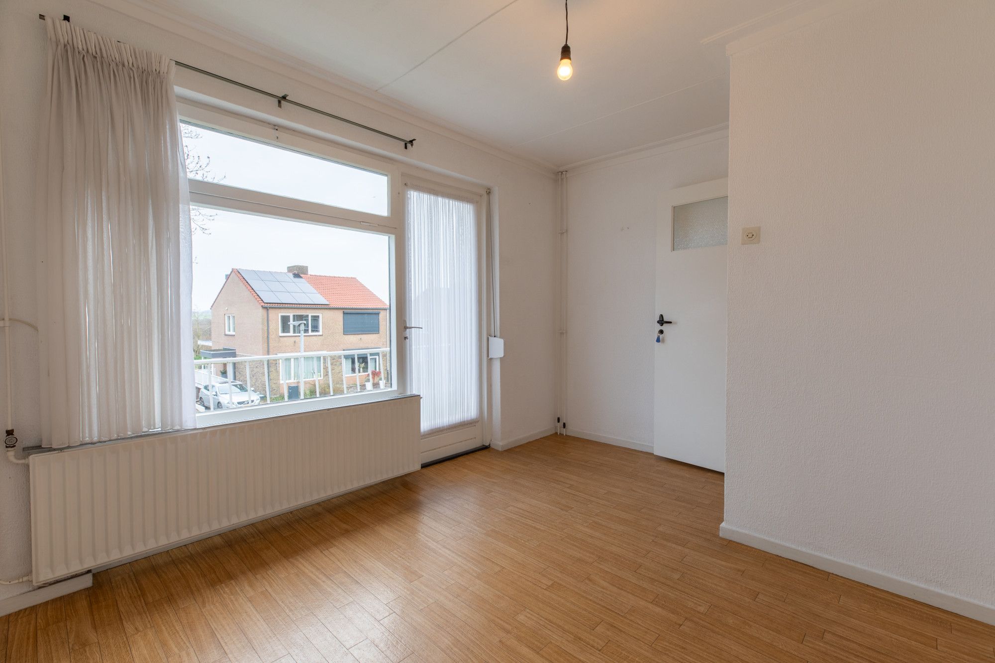 Woonkamer (6.66 x 3.95 m) voorzien van parketvloer en met schoorsteenkanaal.