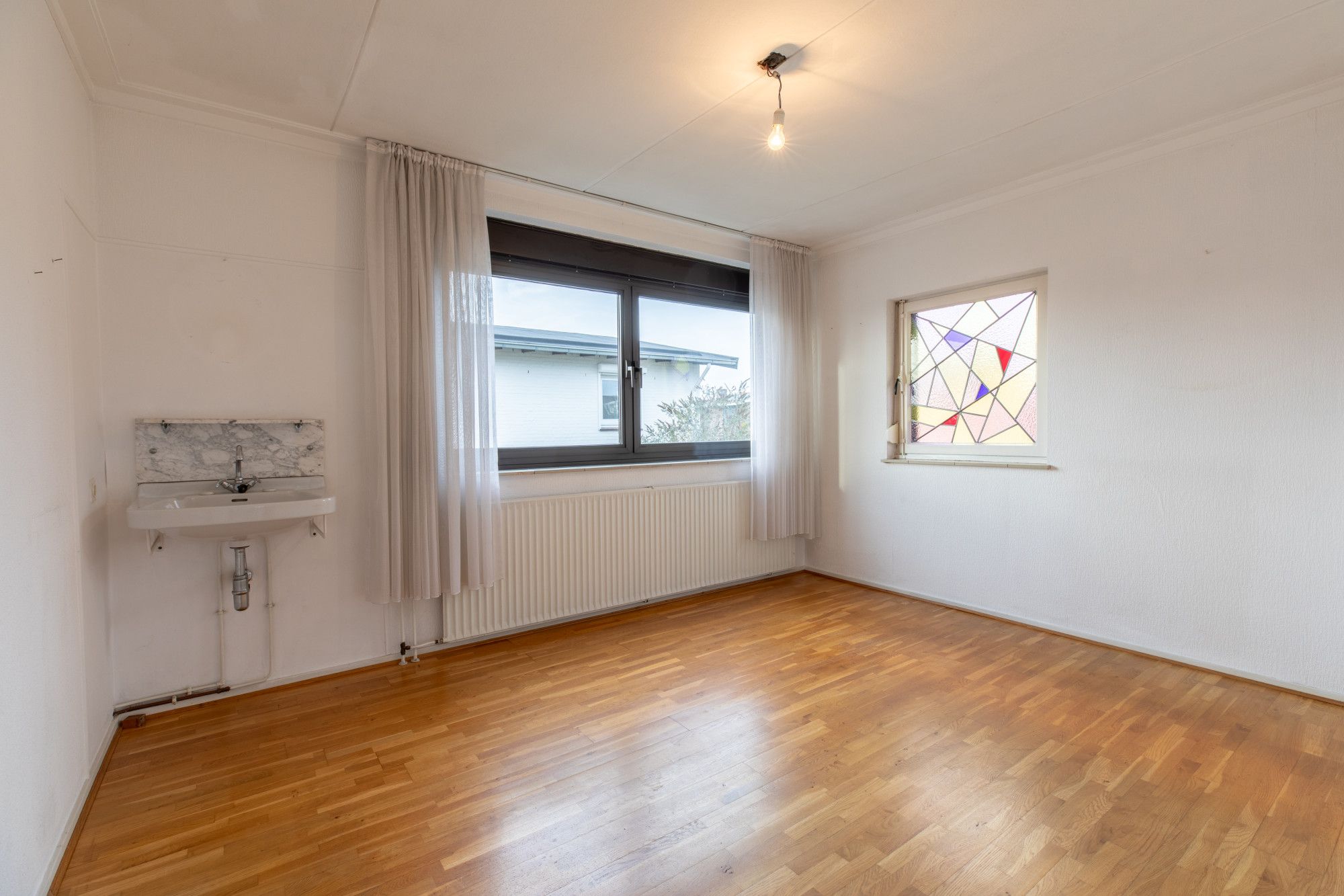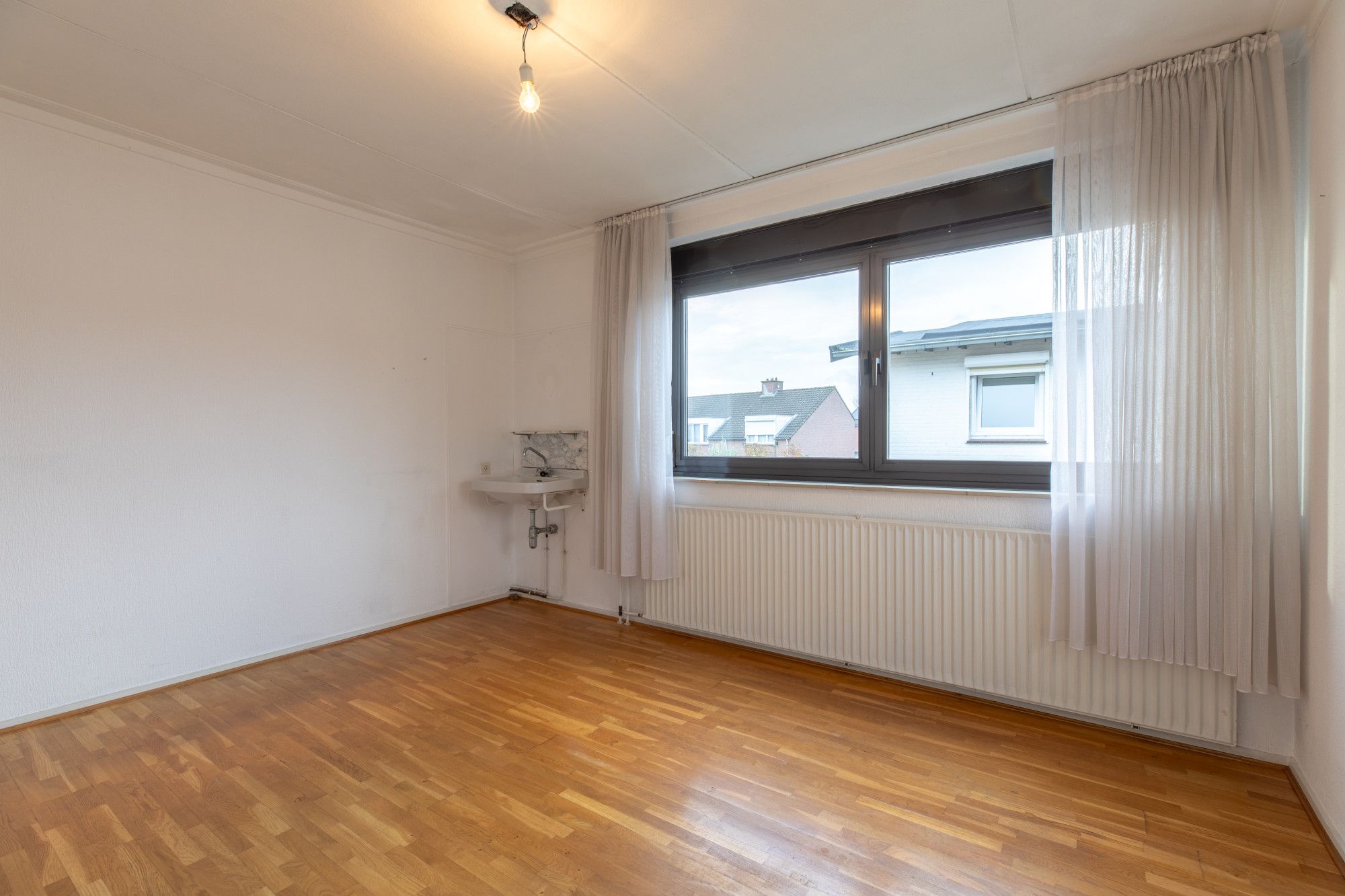 Slaapkamer 1 (3.96 x 3.40 m) voorzien van parketvloer en met vaste wastafel.