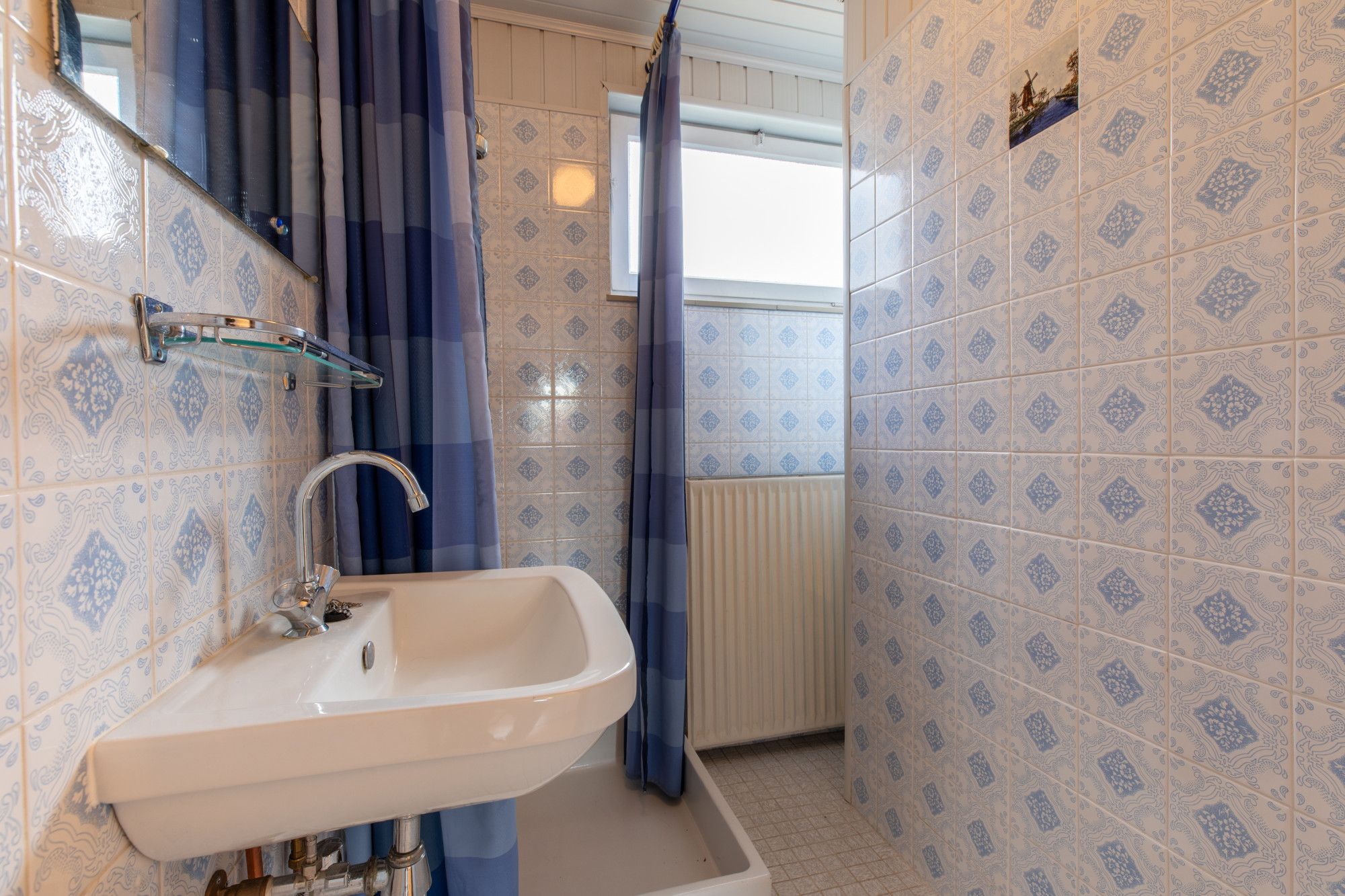 Betegelde compacte badkamer (2.11 x 1.31 m) met douche en vaste wastafel.