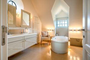 De verdieping is ingericht met nachthal, 4 slaapkamers met elk een eigen badkamer en een 5de slaapkamer, momenteel in gebruik als zitkamer.