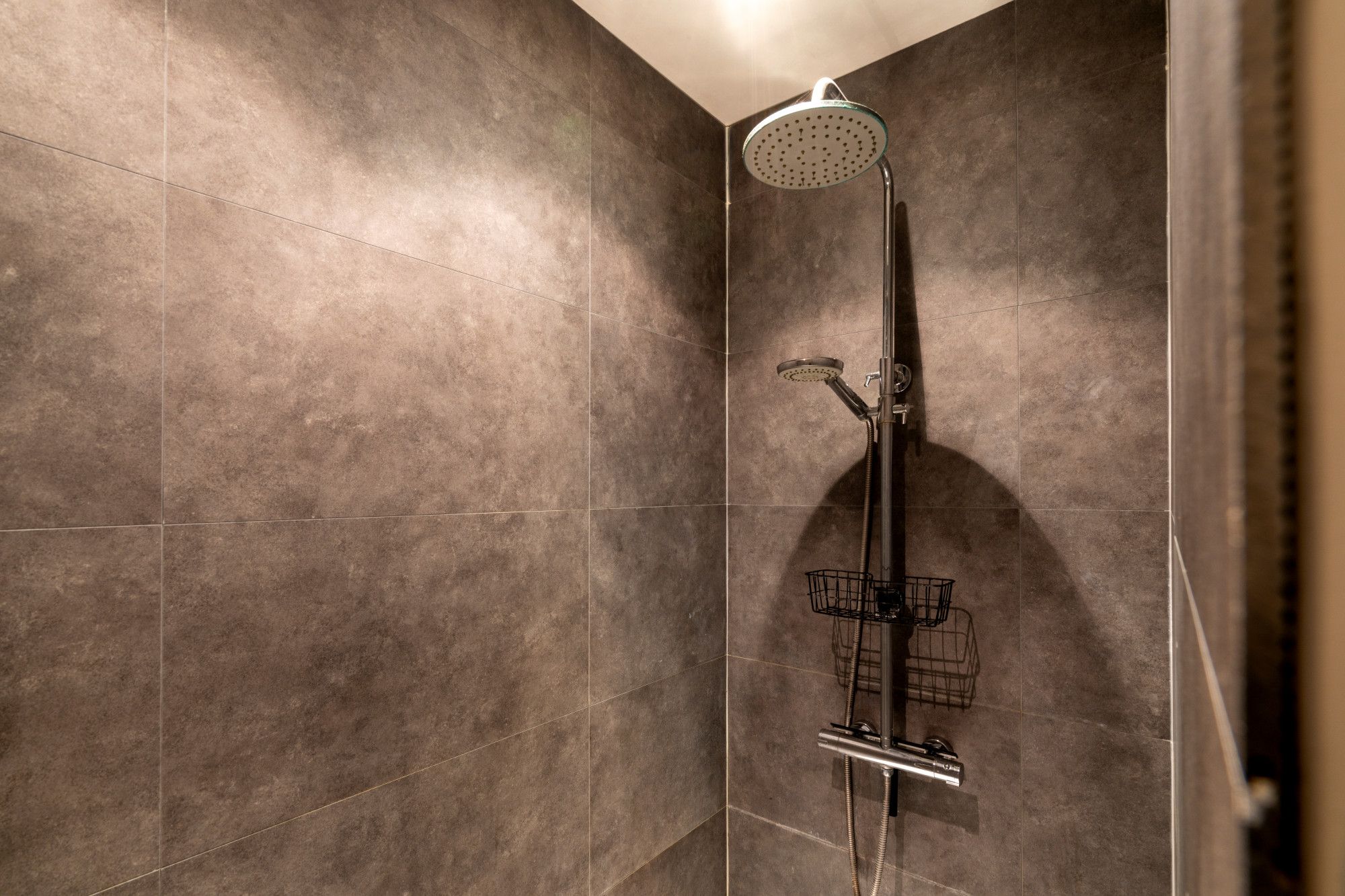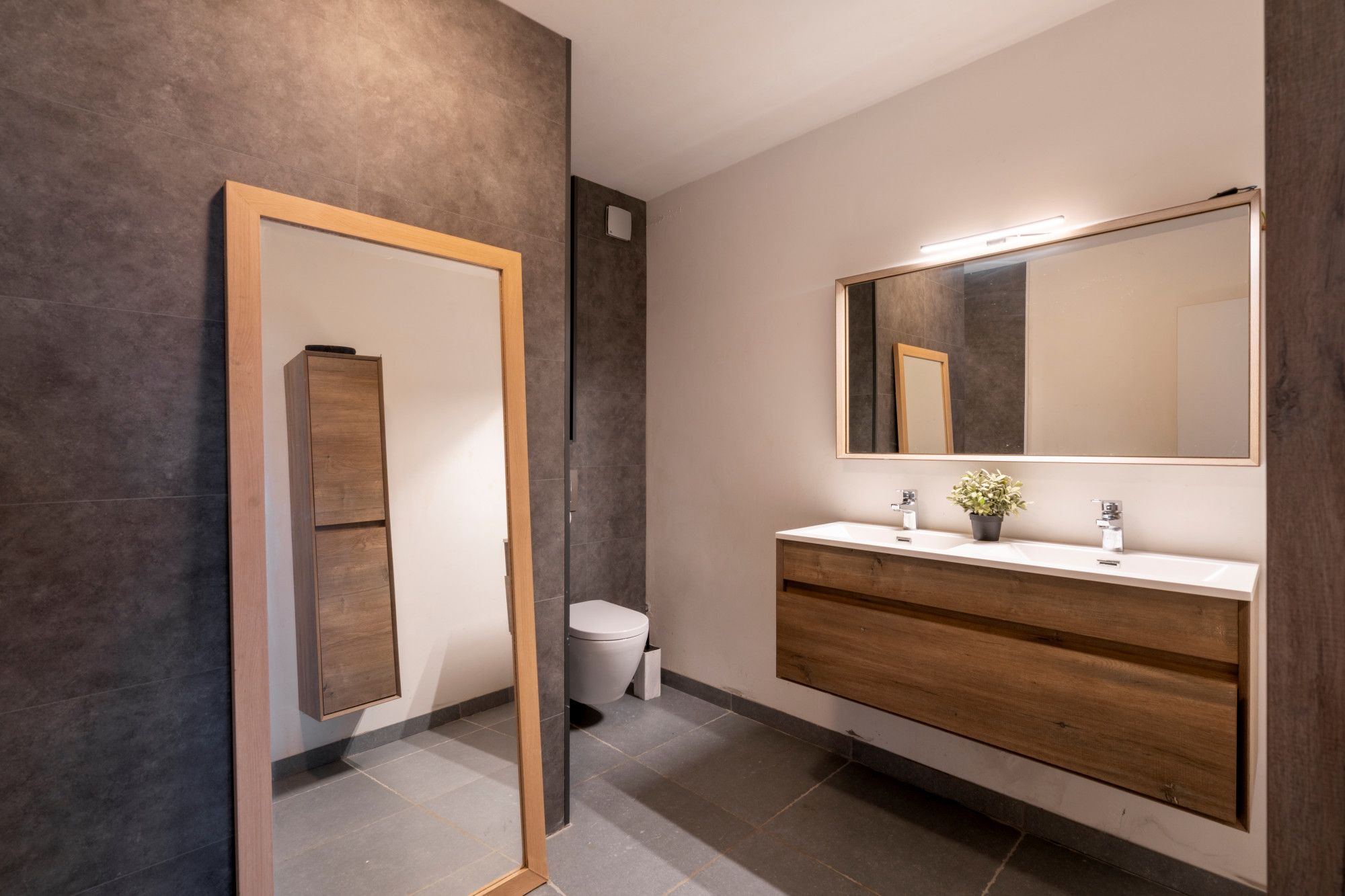 Badkamer 2, gelegen op niveau 1, werd in 2021 vernieuwd en is voorzien van een toilet, een dubbele lavabo en een regendouche.