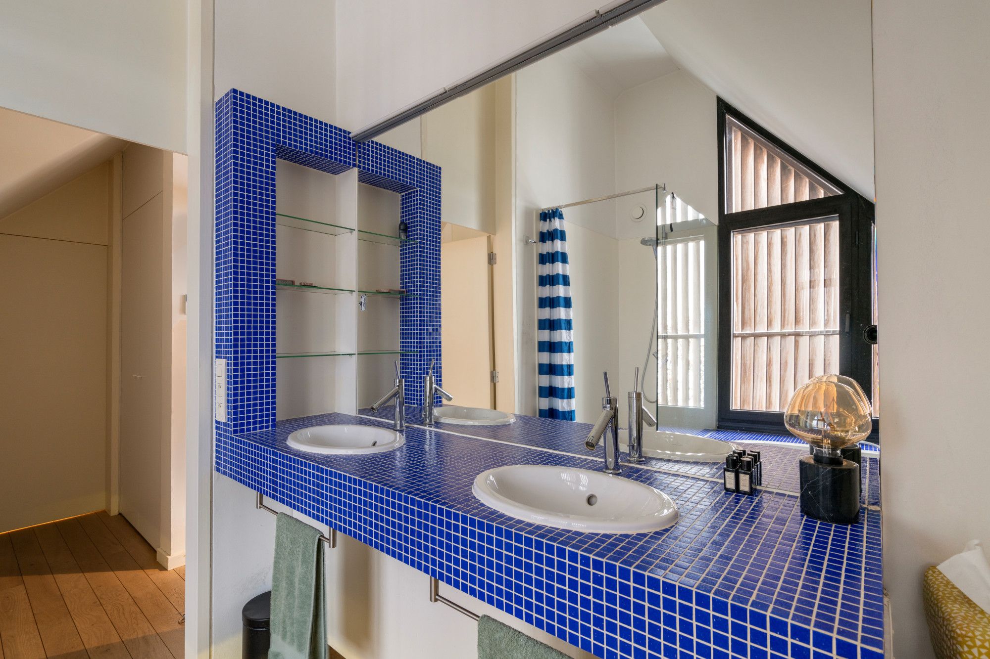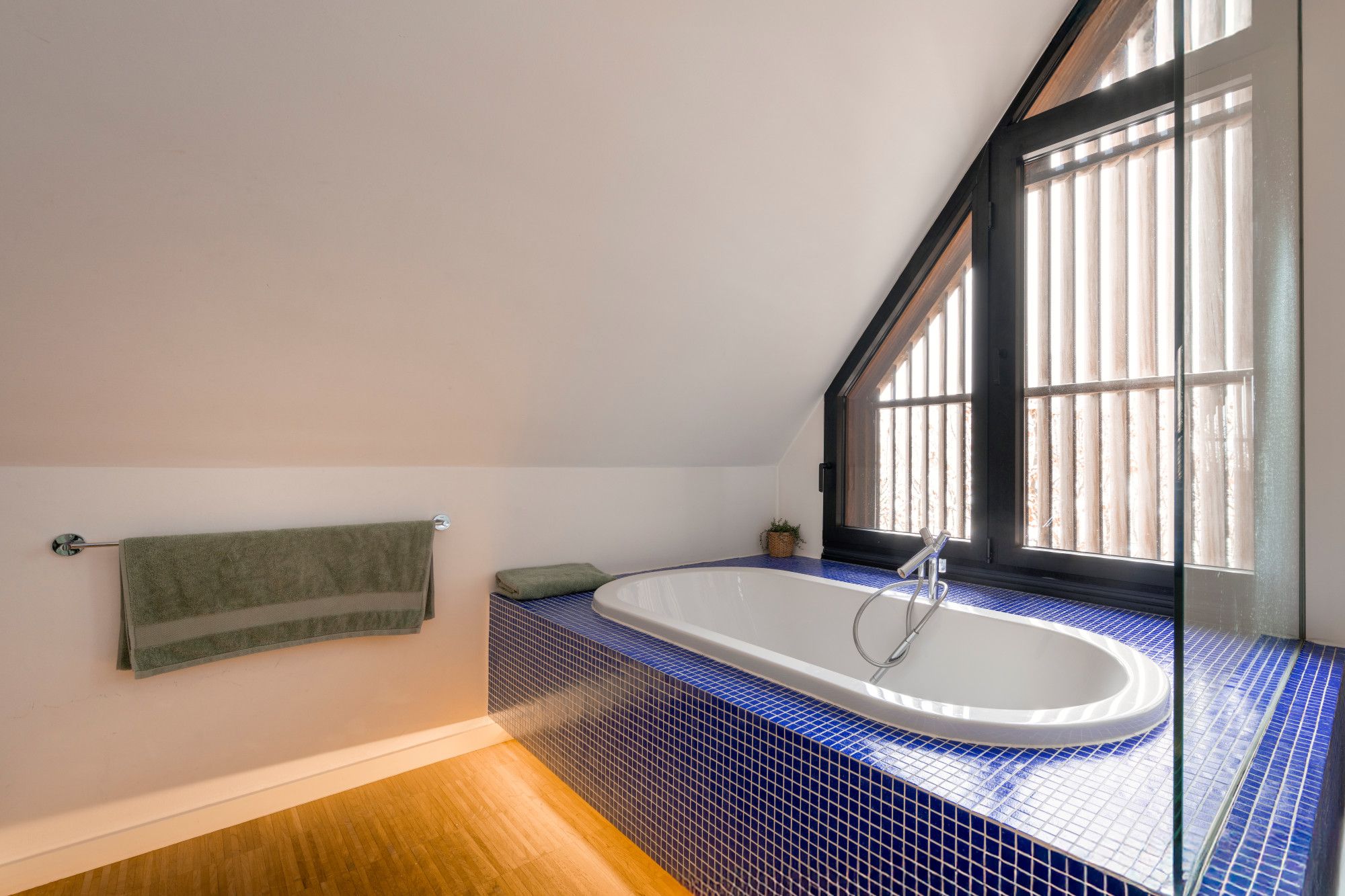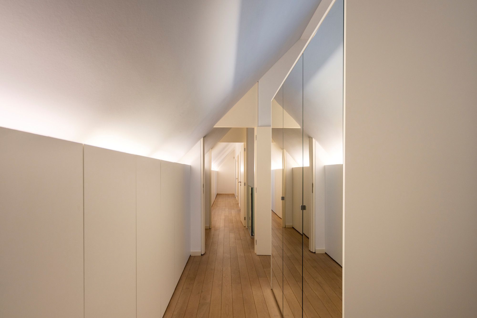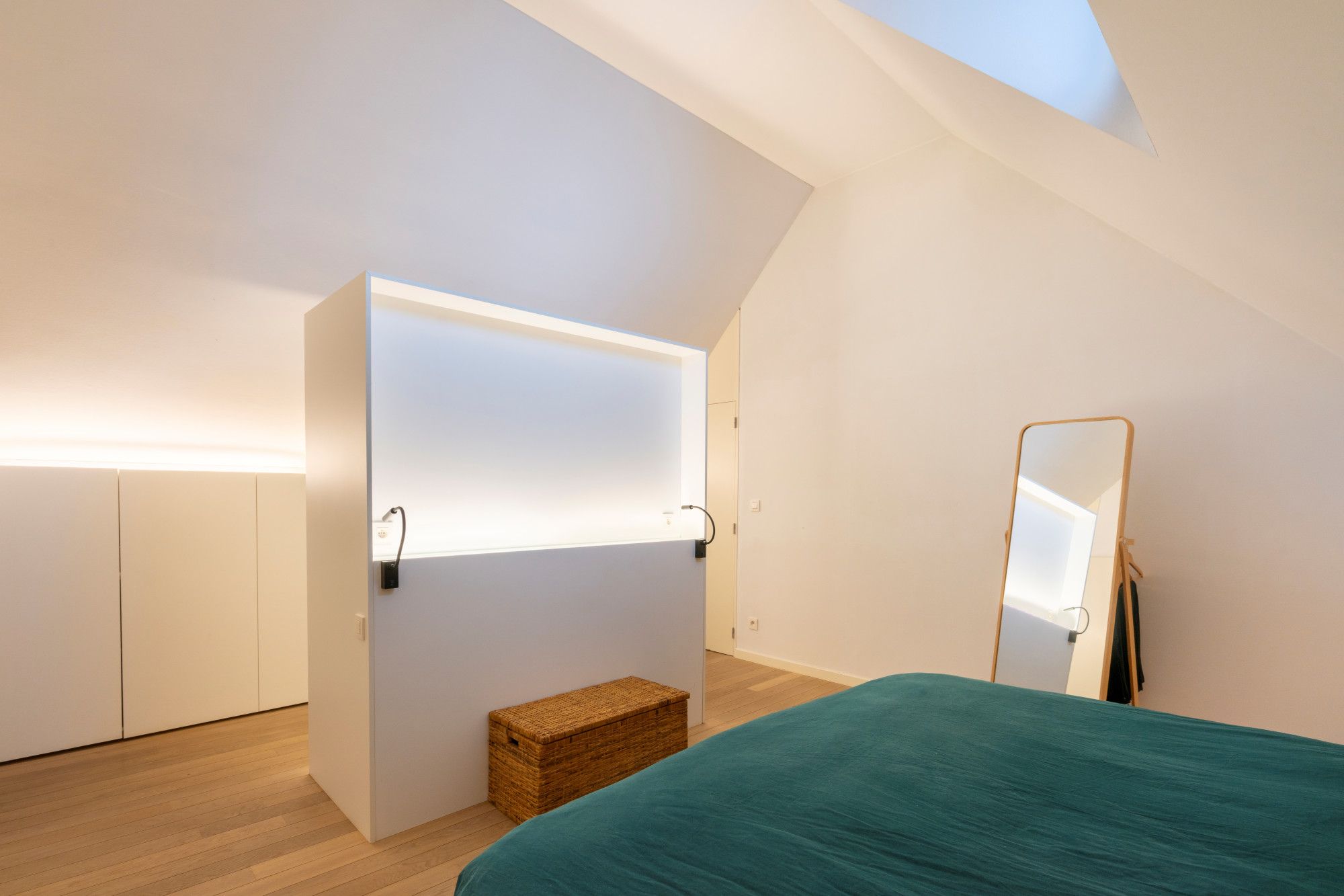 Op de bovenverdieping bevindt zich de master bedroom met dressing en luxueuze badkamer, uitgerust met dubbele wastafel, ligbad en regendouche. Daarnaast is er een apart toilet en zijn er twee kinderkamers, met een tweede badkamer met wastafel en regendouche. In de nachthal zorgen ingemaakte kasten voor extra bergruimte en een strak geheel.