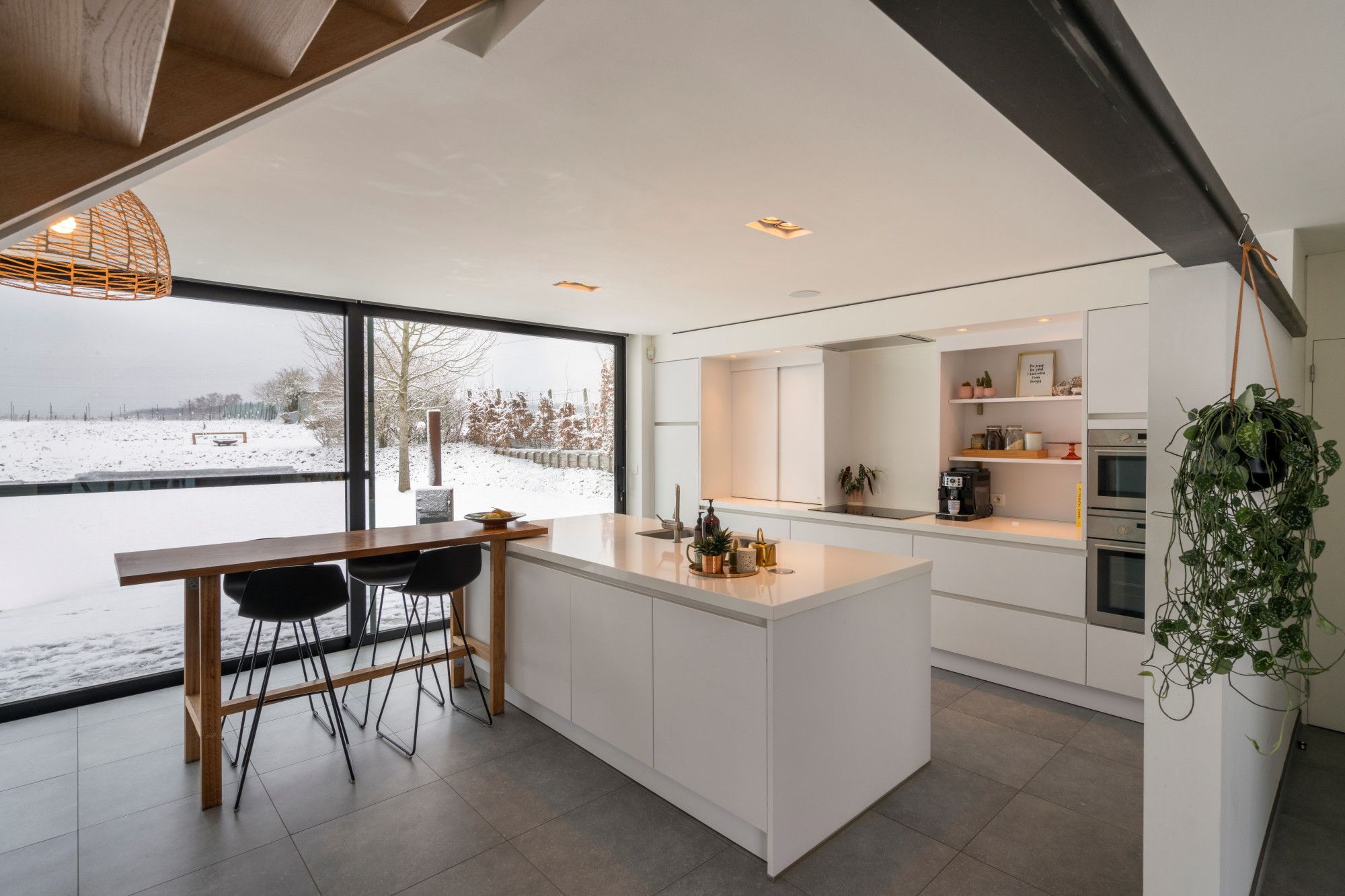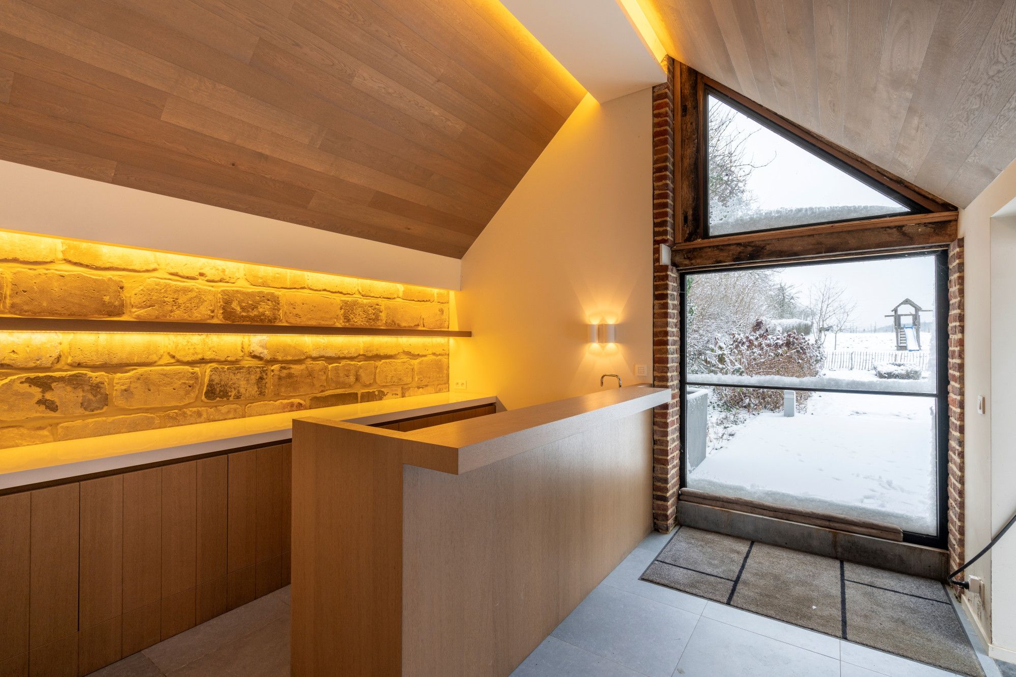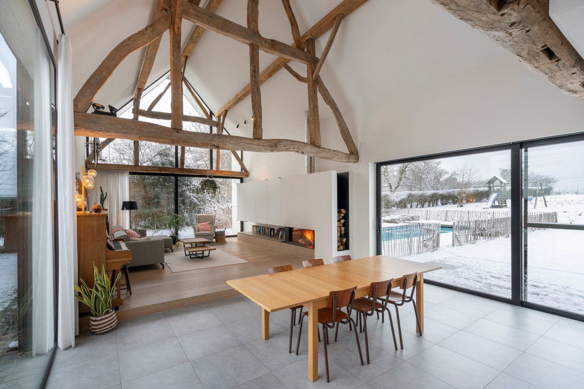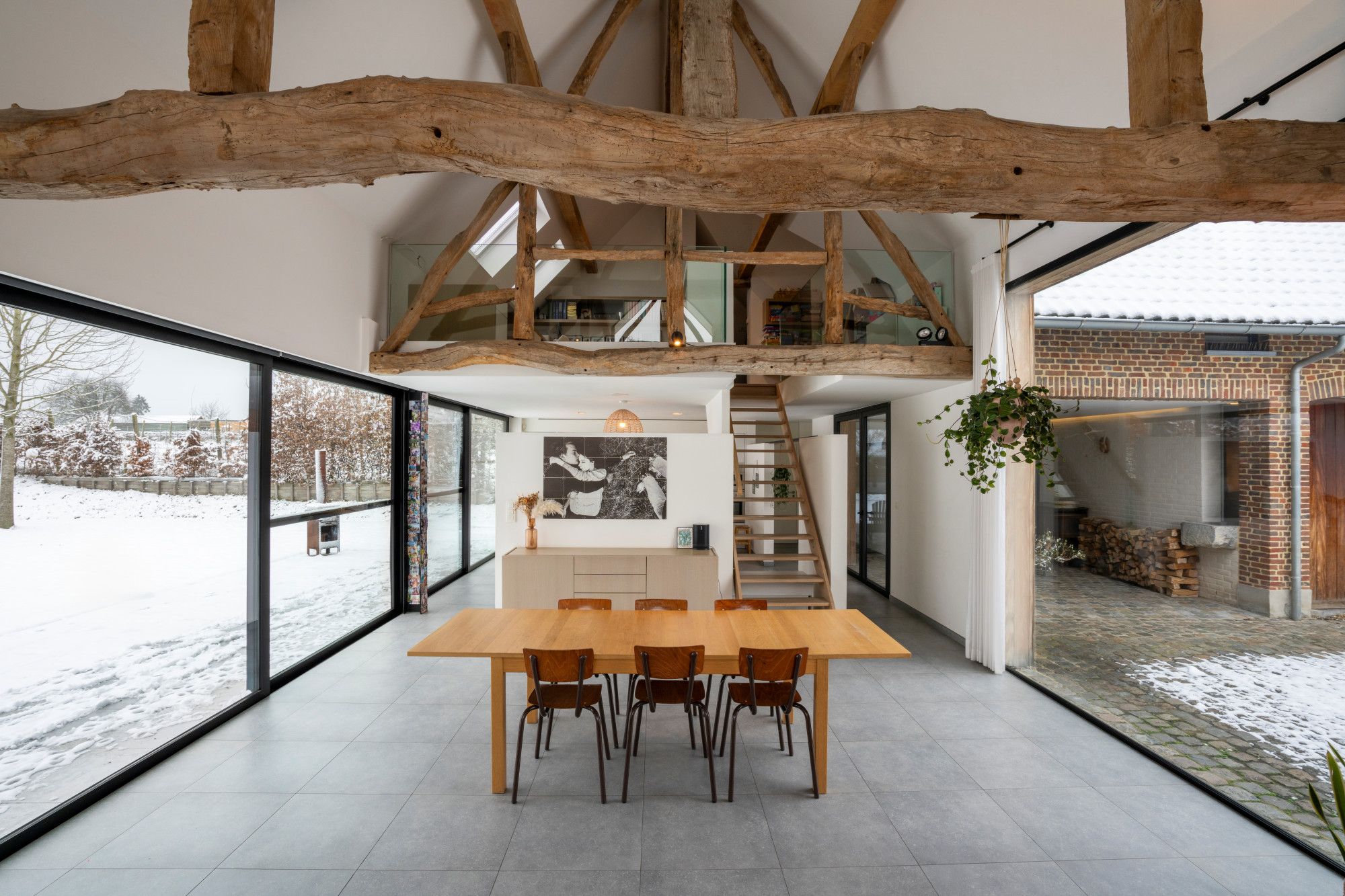 Het leefgedeelte straalt ruimte en licht uit. De moderne, volledig uitgeruste keuken met kookeiland vormt het hart van de woning en beschikt over hoogwaardige toestellen zoals een koelkast, oven, microgolfoven, inductiekookplaat, dampkap en vaatwasser. Aansluitend bevindt zich de eethoek en de zithoek met een open haard op hout. De plafonds lopen hier open tot in de nok, waardoor de originele dakstructuur volledig zichtbaar blijft en een prachtige verbinding ontstaat met de kantoorruimte op de verdieping.